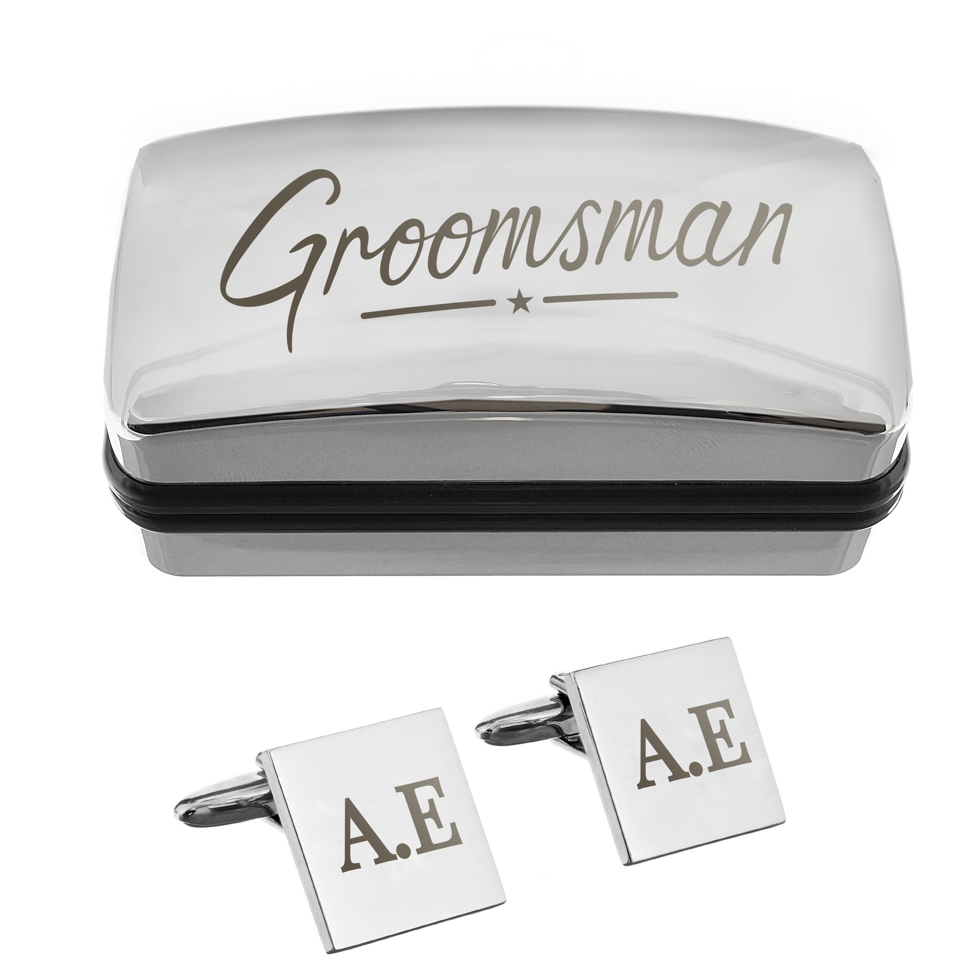 The cufflinks are beautifully presented in a sleek chrome-effect box, with "Groomsman" engraved on the lid, a lasting reminder of his special role in your big day.