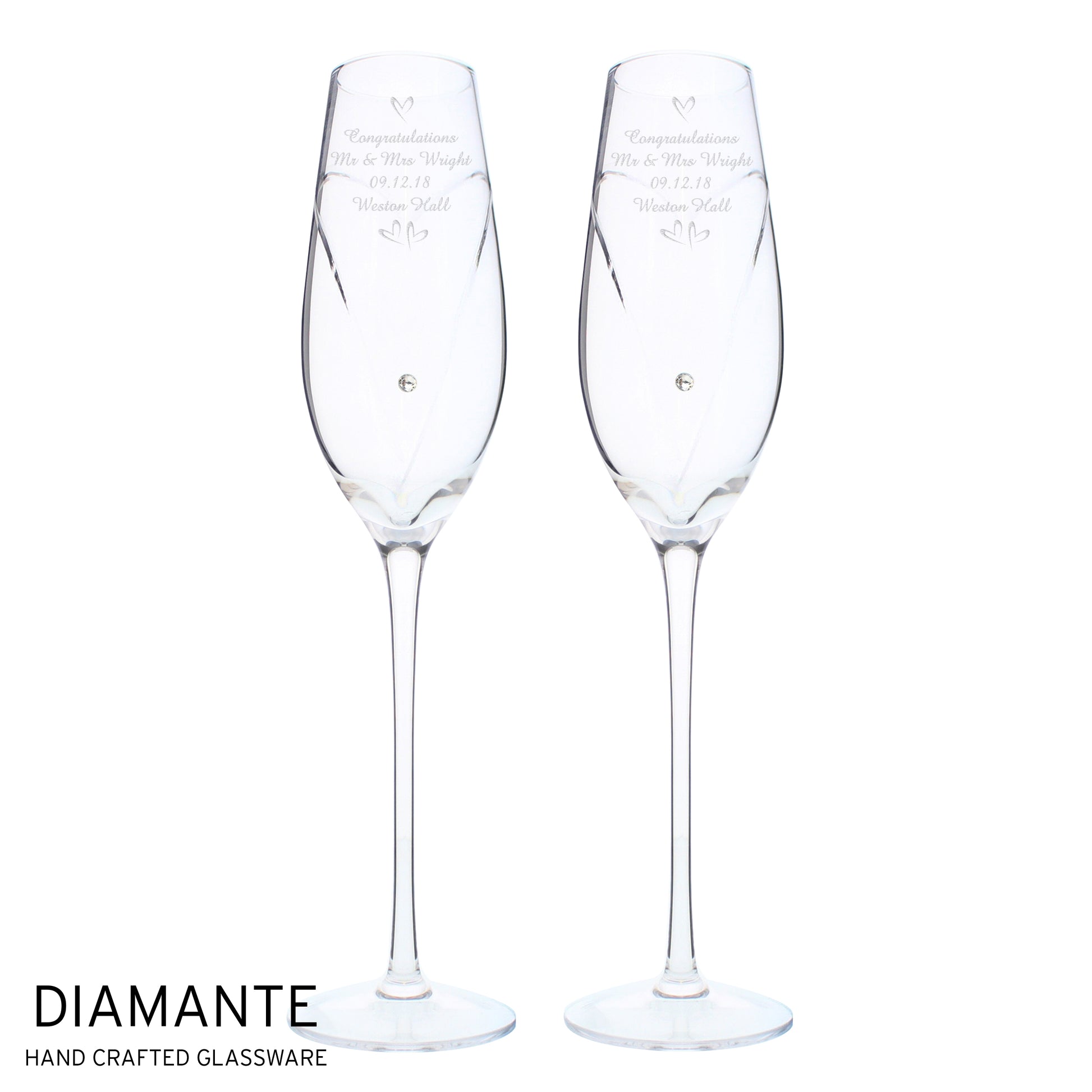 Personalise this Hand Cut Pair of Diamante Flutes with 4 lines, 15 characters per line.