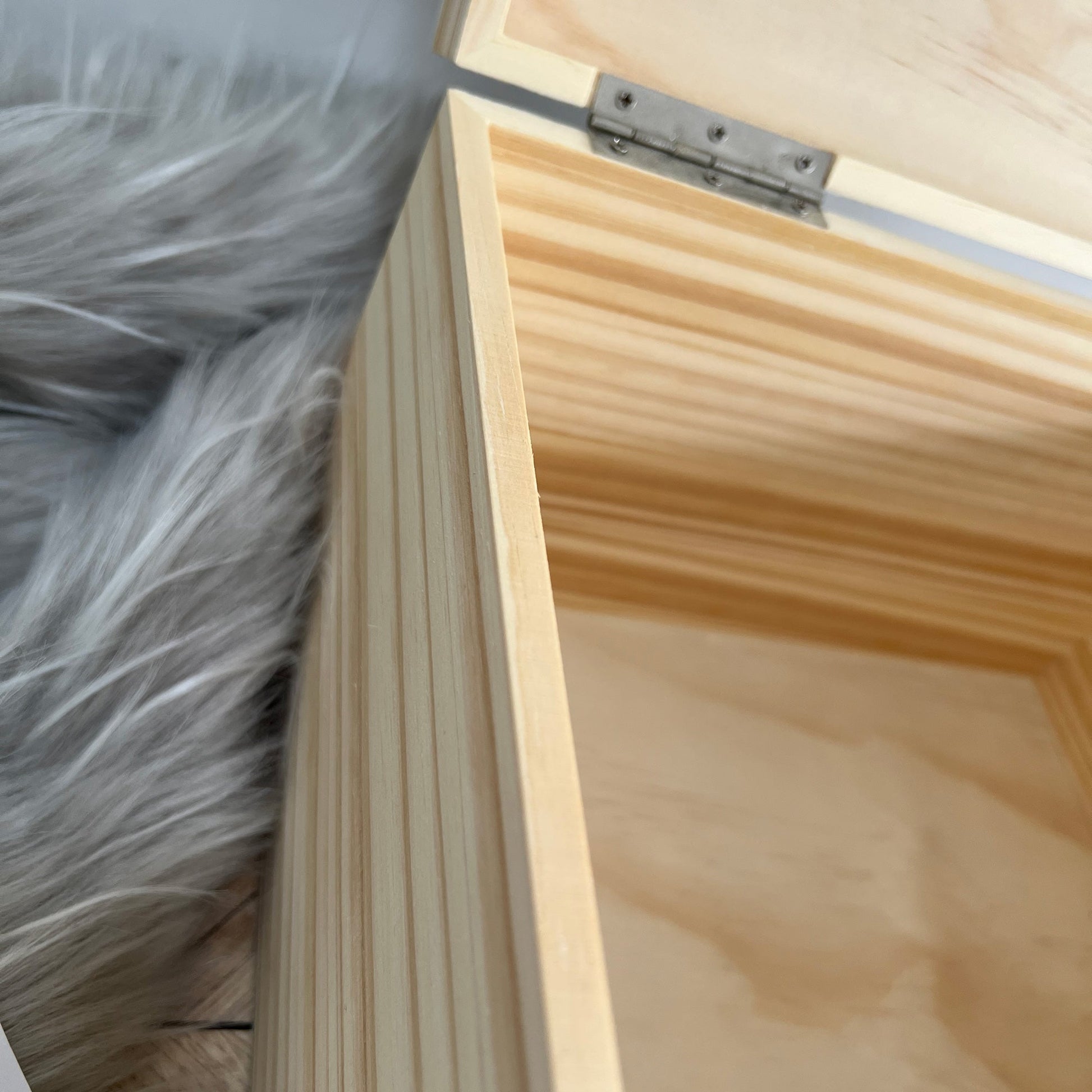 Choose from 5 sizes. It's made of natural pine wood with metal hinges and a silver clasp.