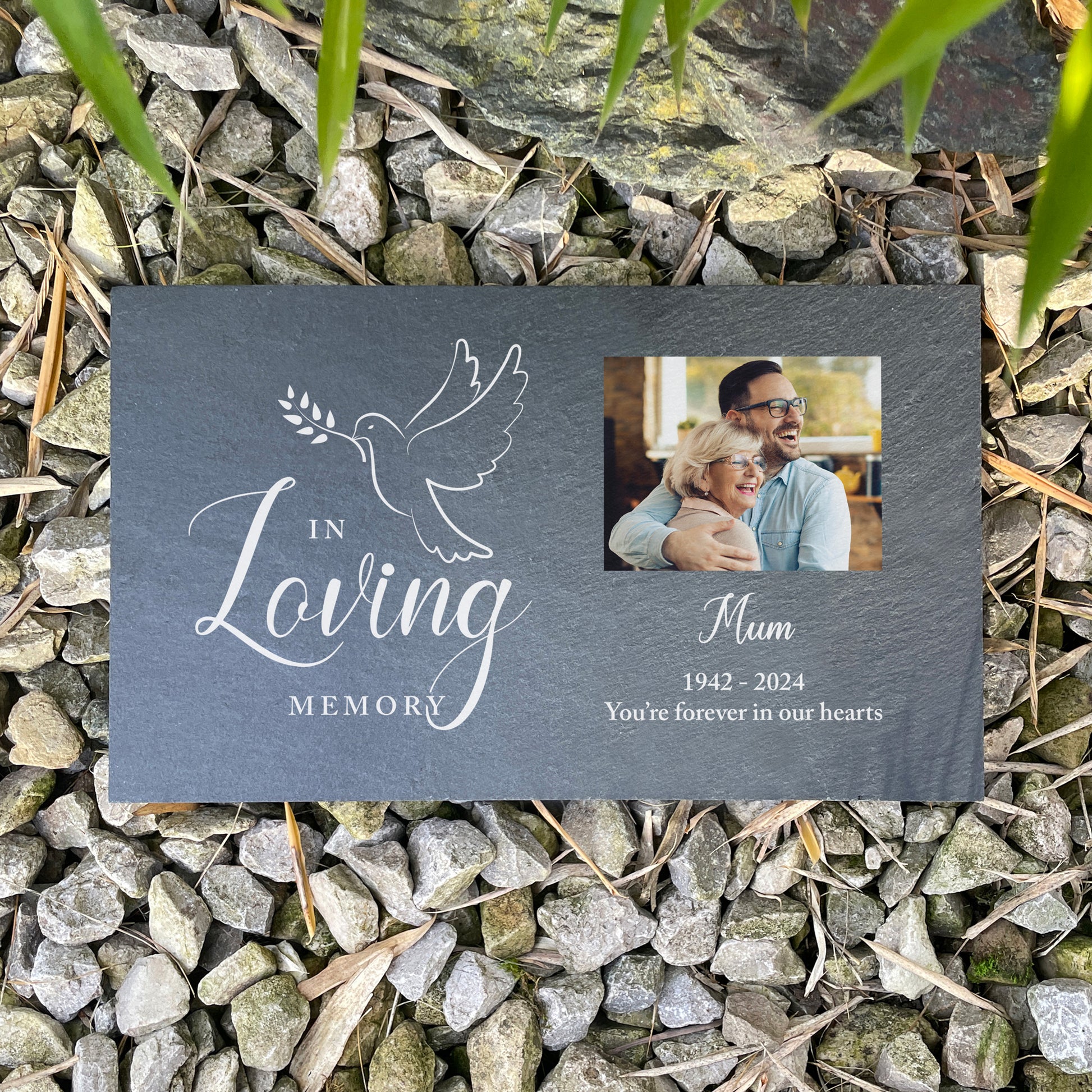 Remember a dearly missed loved one with this personalised slate grave marker, featuring our popular In Loving Memory Dove design.