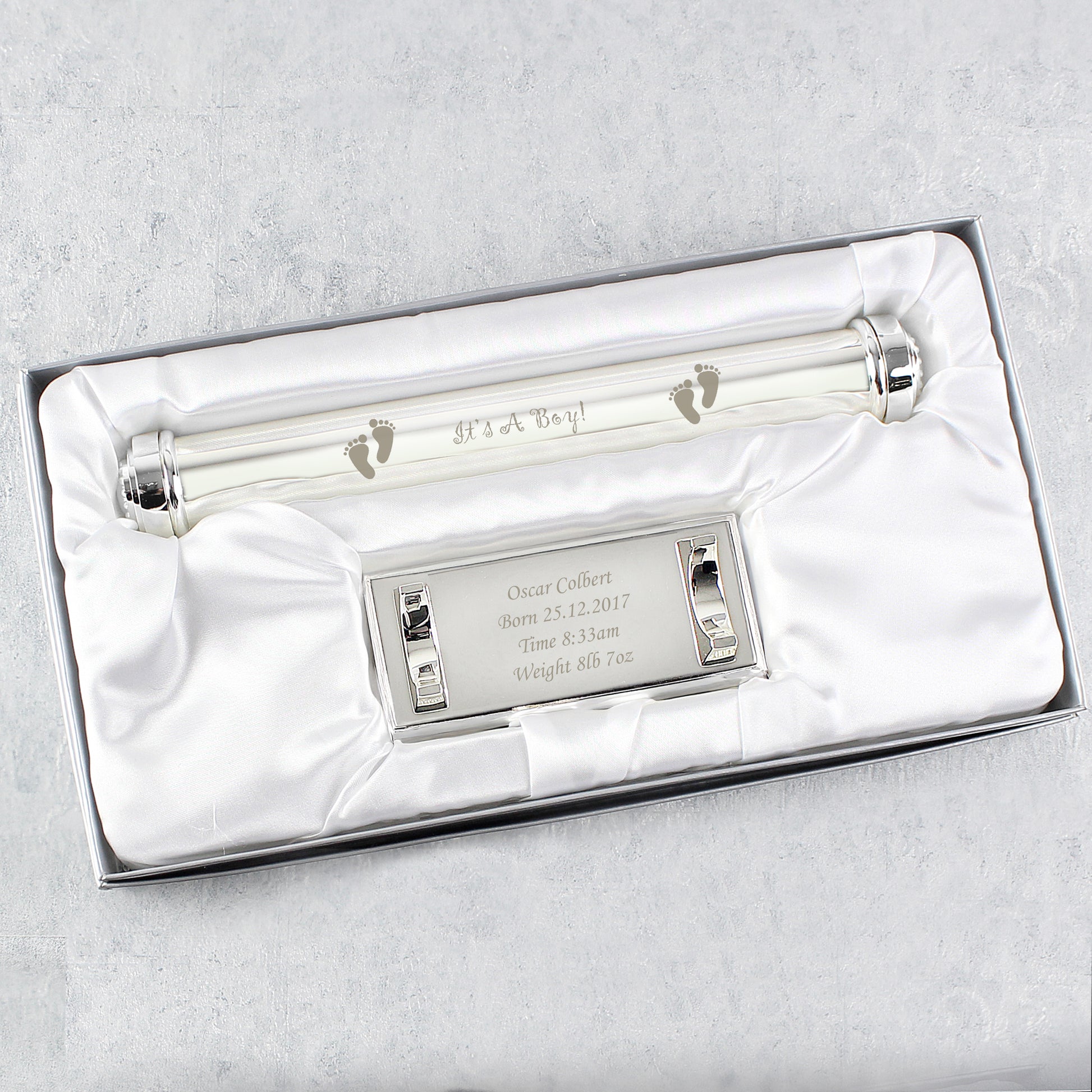 Personalised the stand with any message over 4 lines and up to 25 characters per line. The wording 'It's a Boy' featured on the holder is standard text.