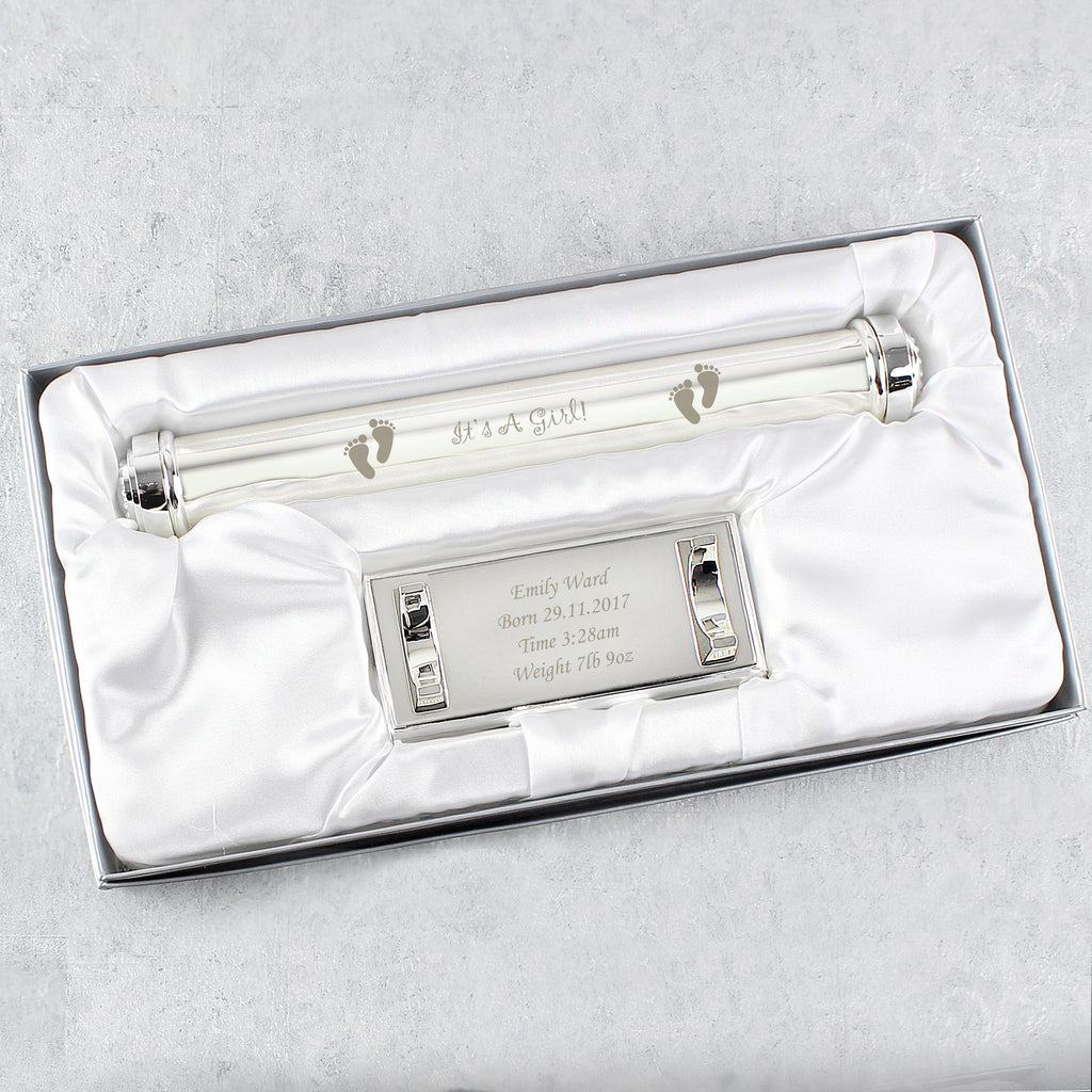 Personalised the stand with any message over 4 lines and up to 25 characters per line. The wording 'It's a Girl' featured on the holder is standard text.