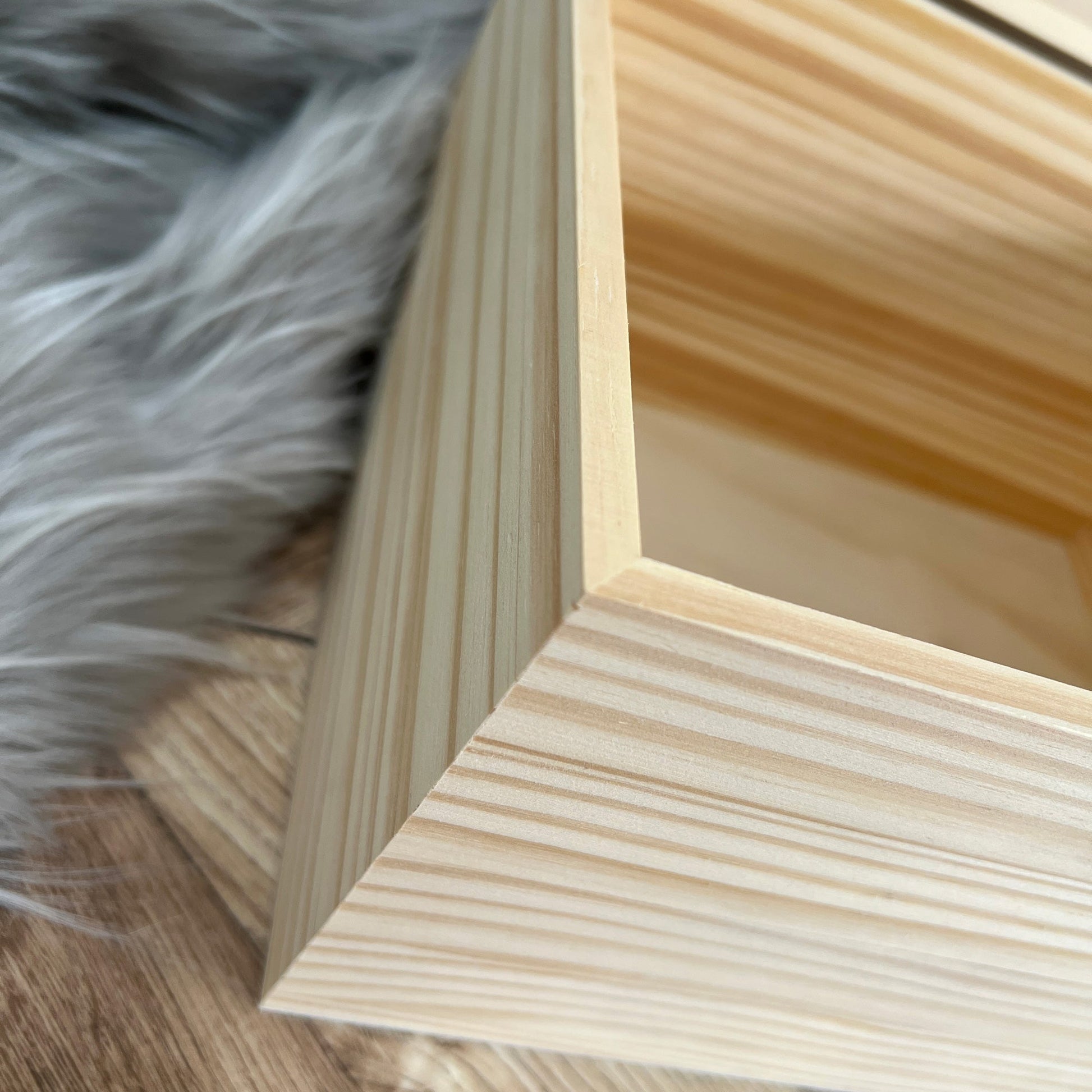 Choose from 5 sizes. It's made of natural pine wood with metal hinges and a silver clasp.