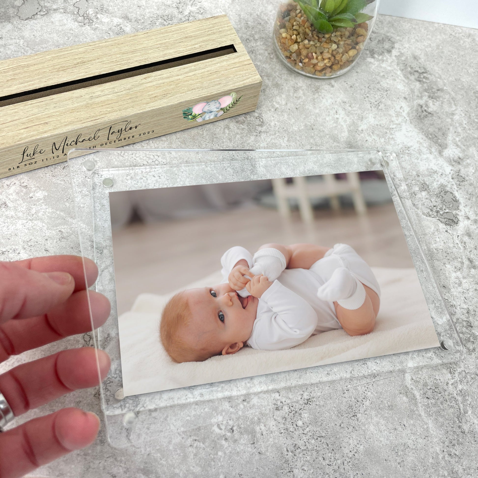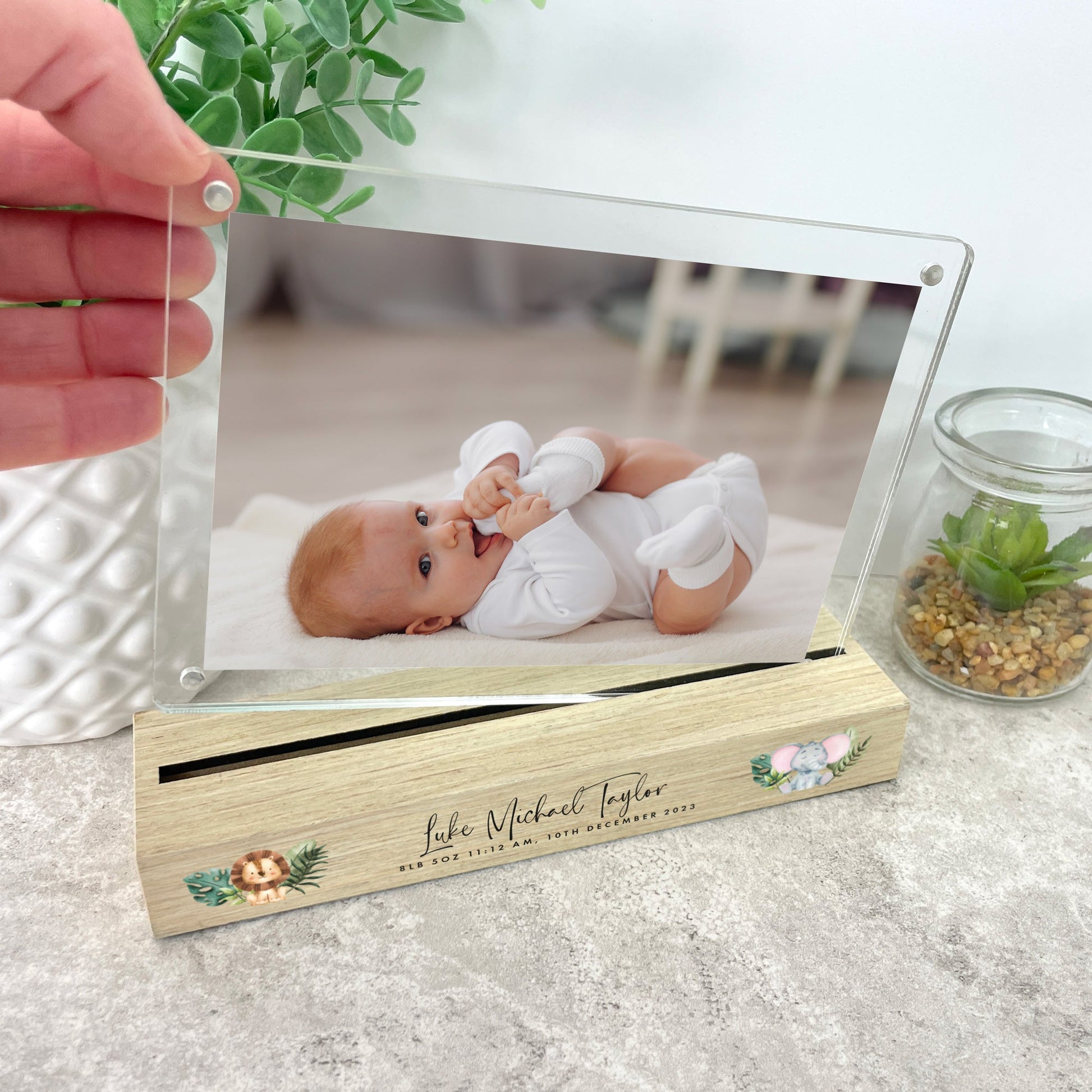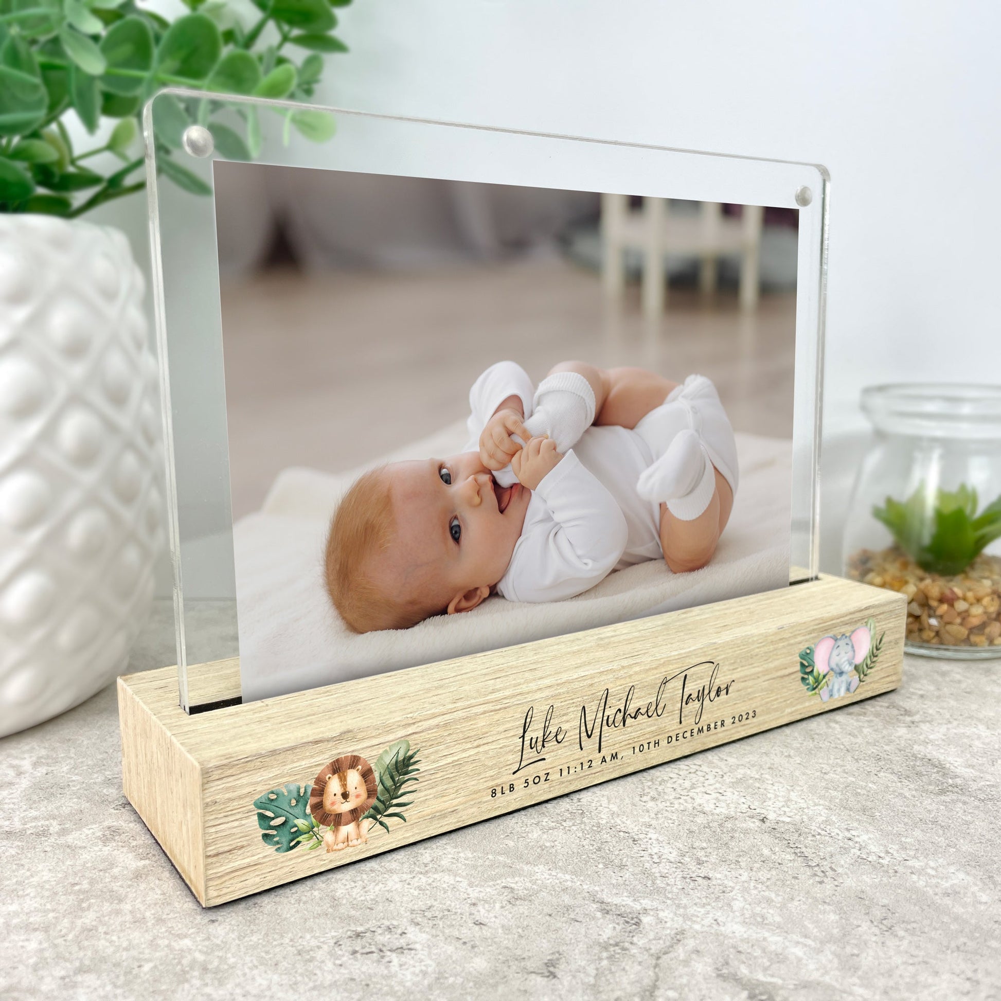 Celebrate the arrival of a little one with this adorable jungle animal-themed personalised baby photo frame. A delightful gift for new parents or grandparents, it's perfect for displaying a cherished photo of your precious bundle of joy.
