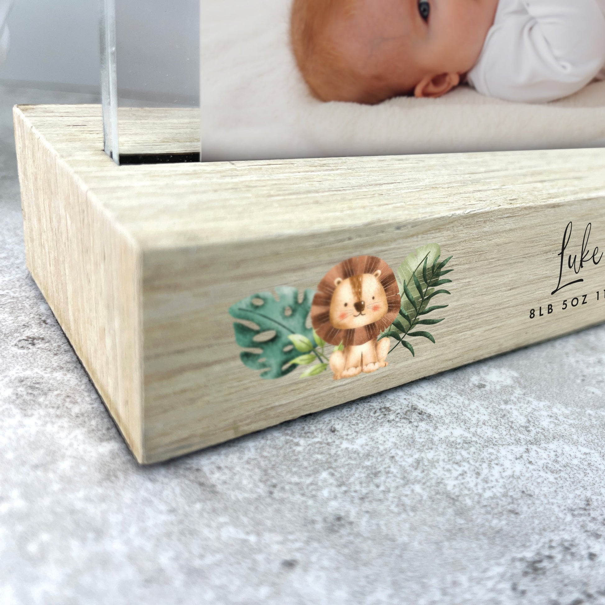 The solid wood base features a charming lion and elephant design, with space to personalise with your baby's name, date of birth, time of birth, and birth weight.