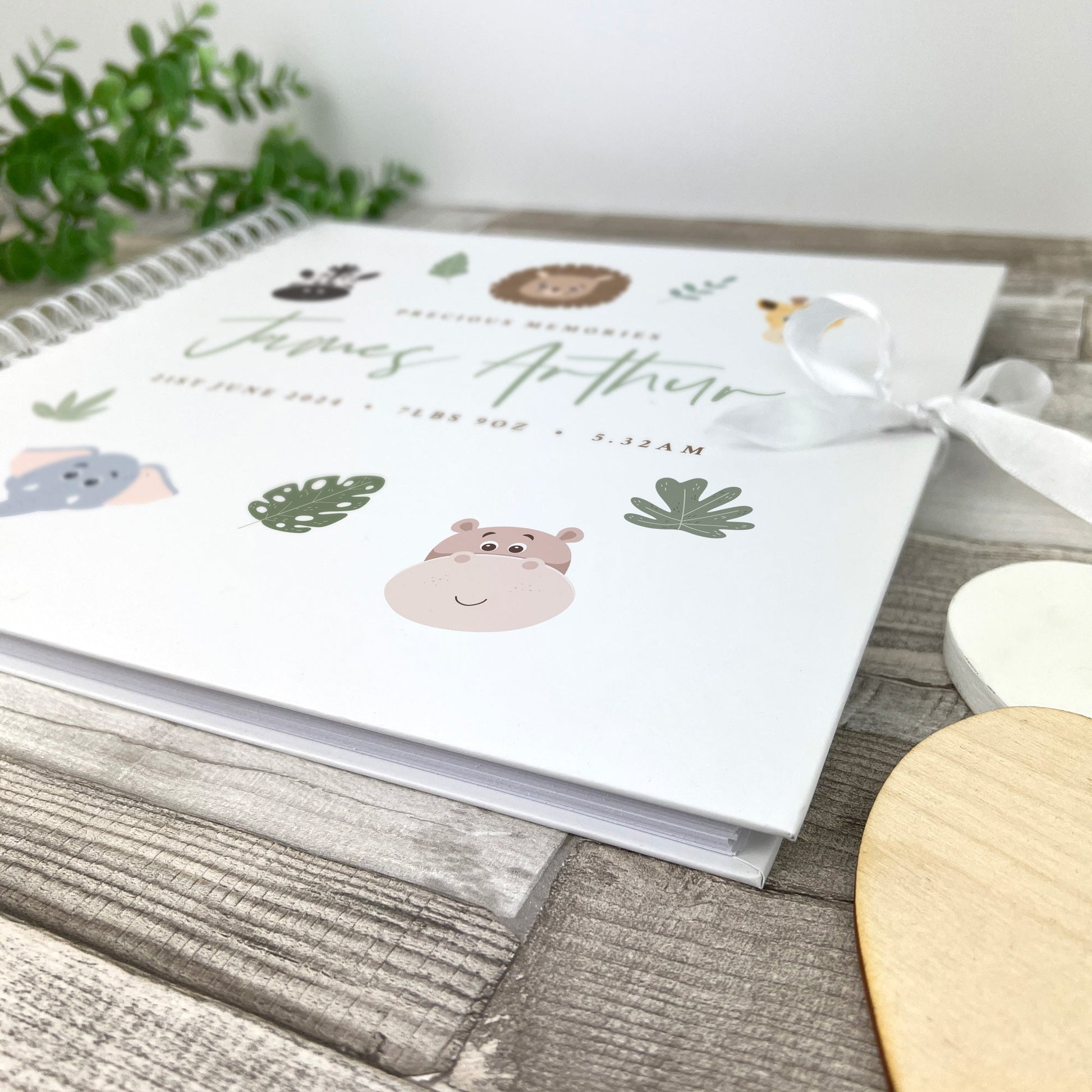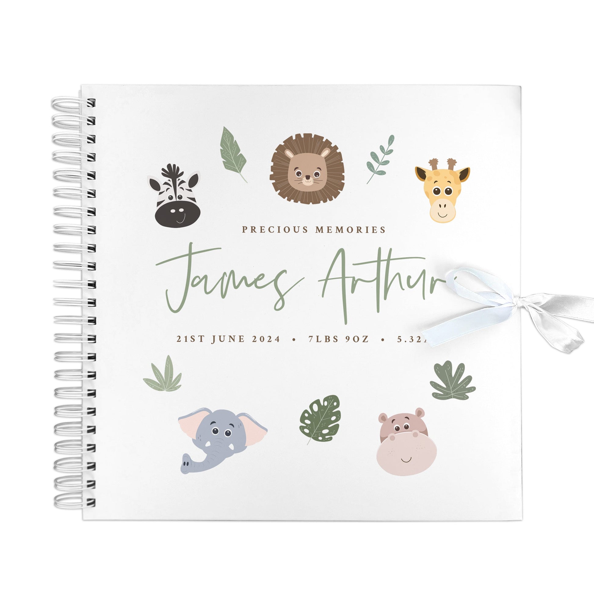 Capture every giggle, milestone, and magical moment with this charming personalised jungle-themed baby scrapbook. The perfect keepsake for documenting your little one's earliest adventures from hospital bracelet tags and tiny handprints to first smiles and precious photographs.
