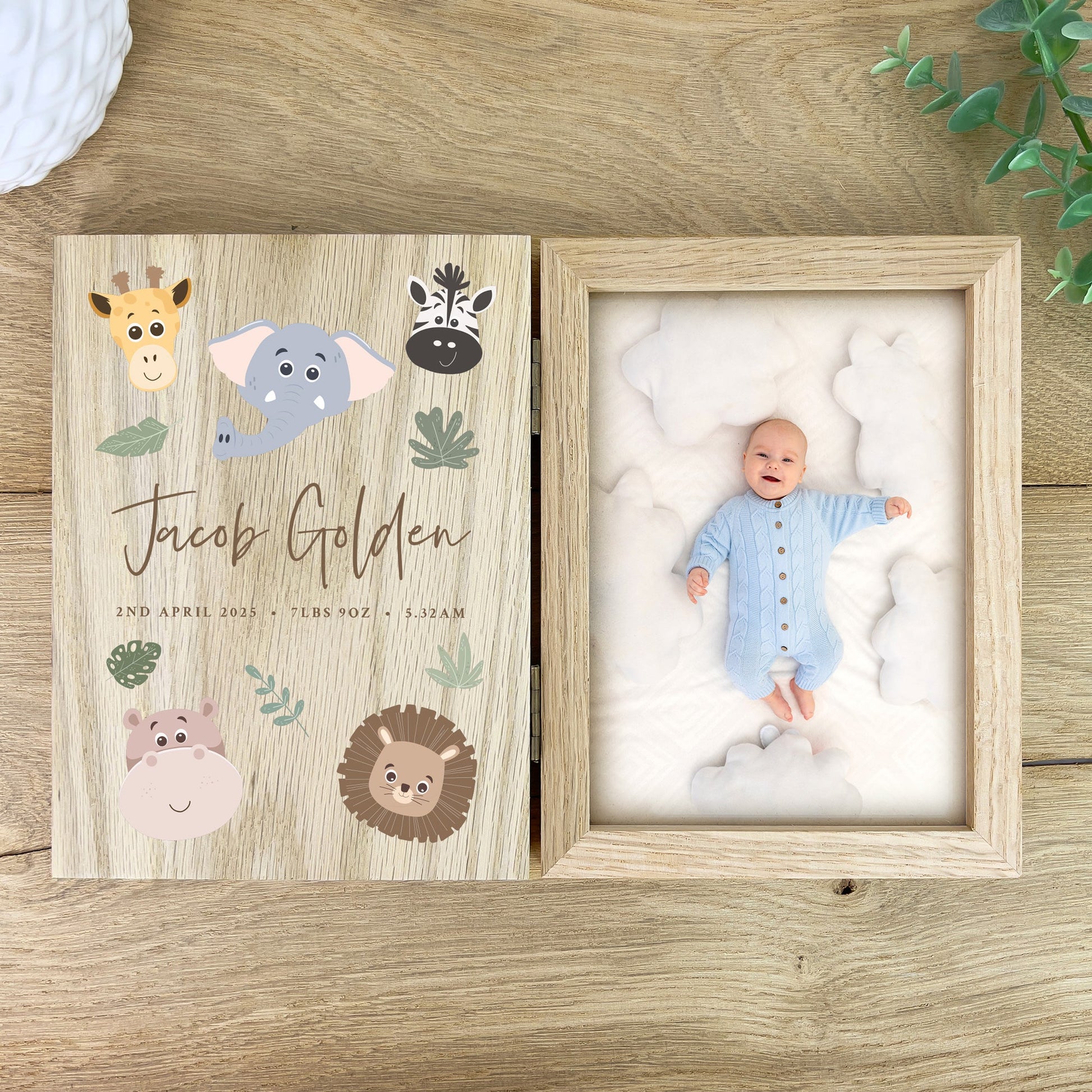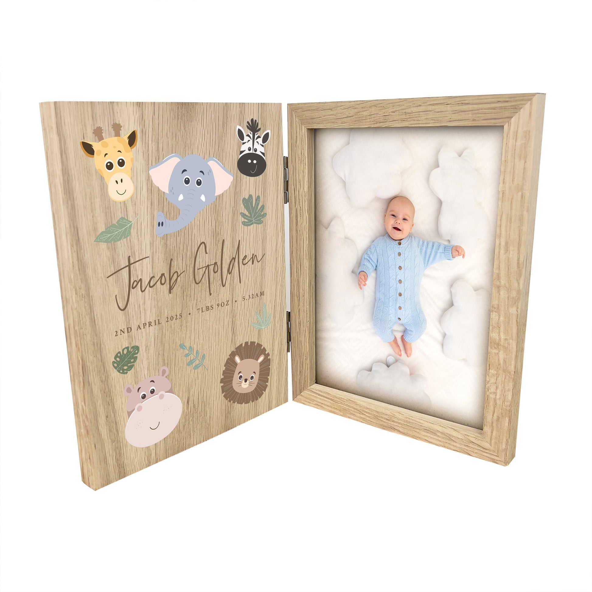 Mark a momentous milestone with this enchanting jungle-inspired picture frame a nursery essential that celebrates baby's arrival in style! Customise the left panel with your little one's name, arrival details, or a touching personal note to create a treasured memento.