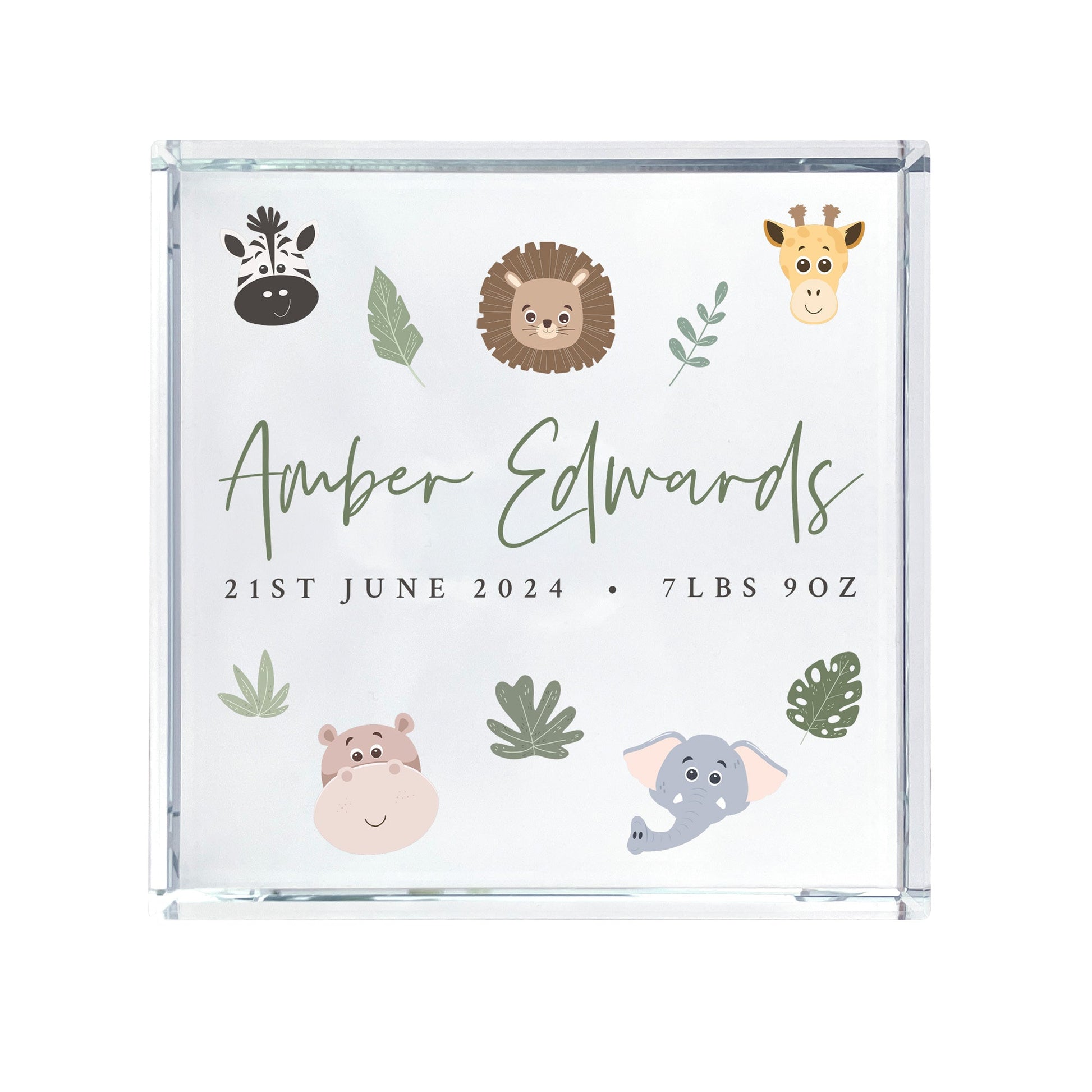 Welcome your little one into the world with this delightful jungle-themed crystal token! Bursting with adorable woodland creatures and lush greenery, it's the ideal keepsake for a newborn or christening celebration.