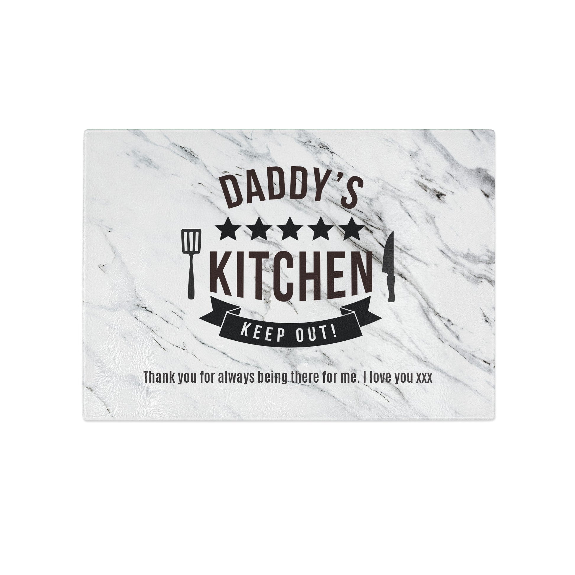 Delight a food-loving friend with a distinct custom present! Showcasing a marbled look, this grooved glass cutting board boldly declares *NAMES* Kitchen and amusingly tells others to "KEEP OUT!" You can personalise this custom cutting board with any name and a lone message.