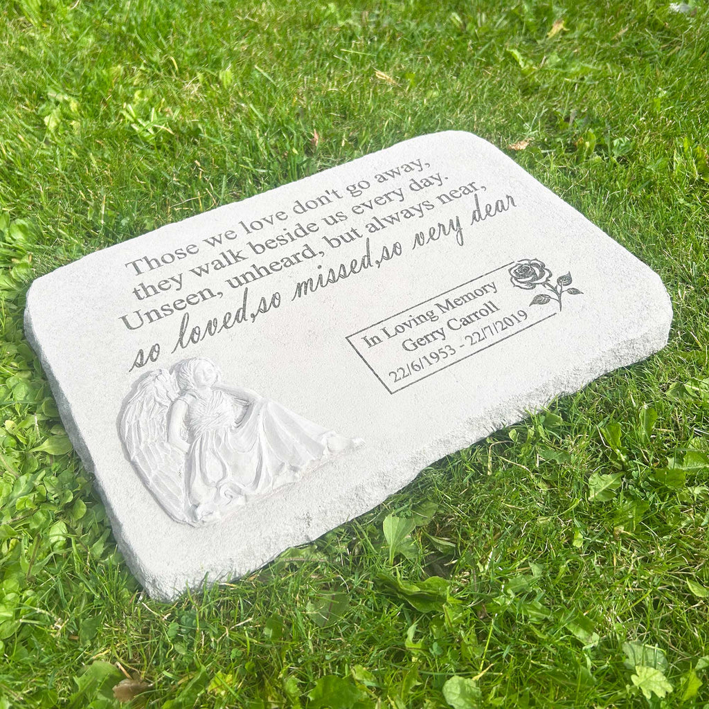 Remember your loved one with this large personalised memorial stone that truly expresses heartfelt sentiment. Featuring a delicate 3D angel motif and the option for three lines of custom engraving (up to 21 characters per line), this memorial stone will create a unique and personal tribute. The thoughtful fixed verse included reads: