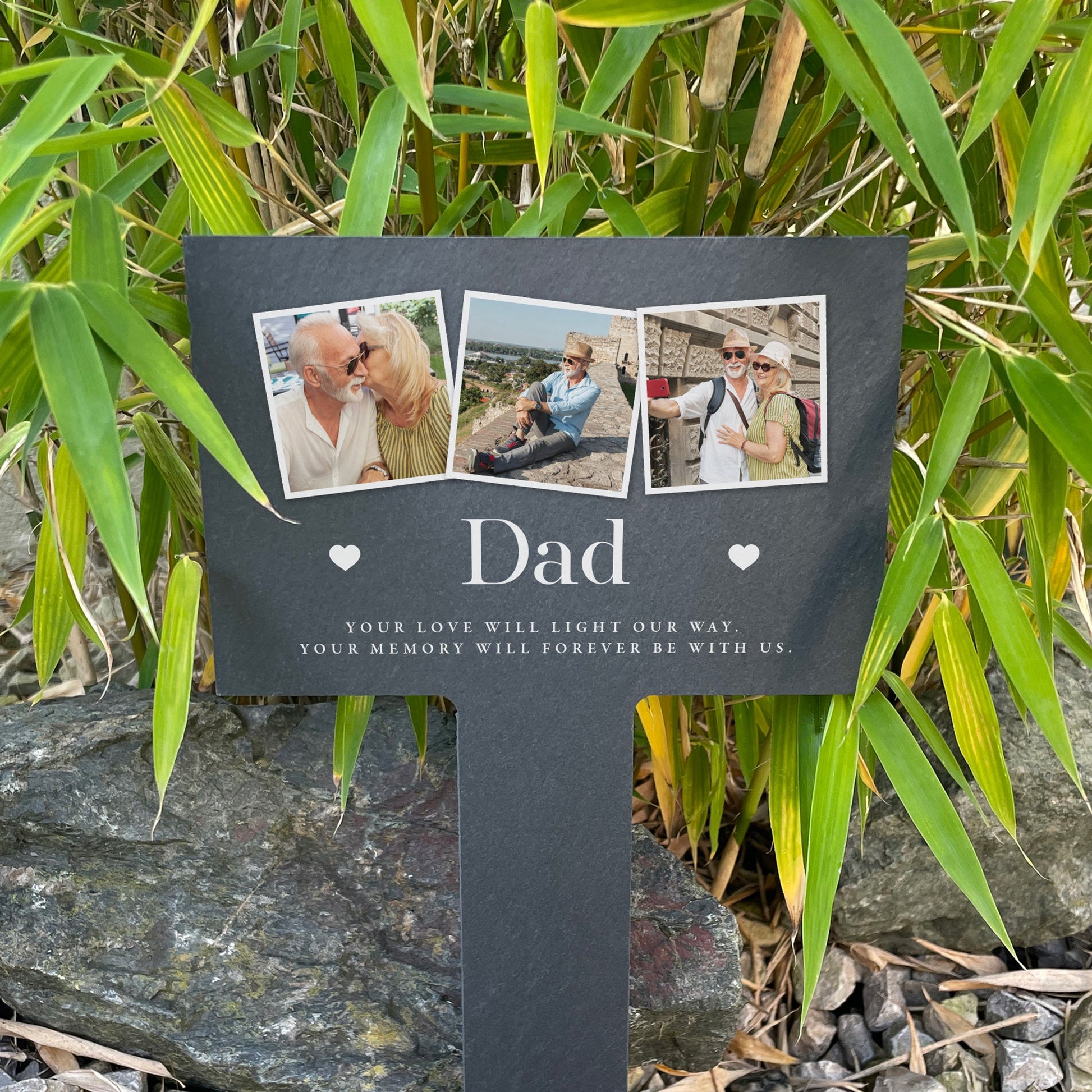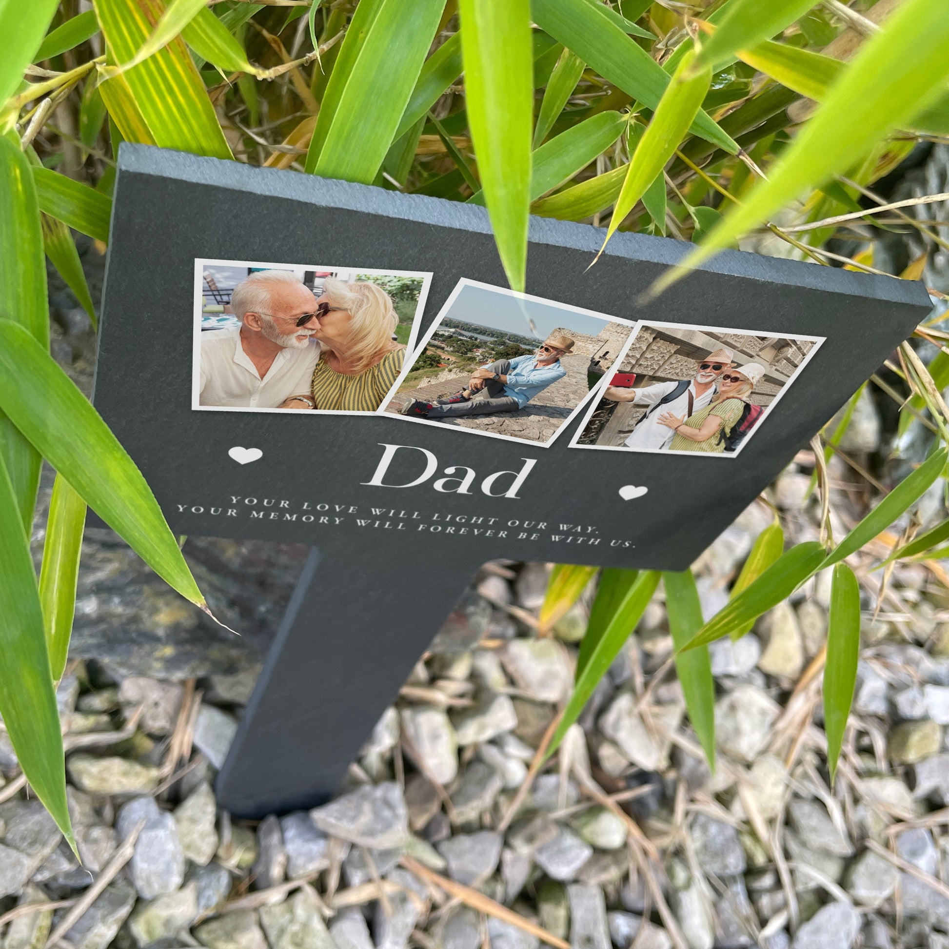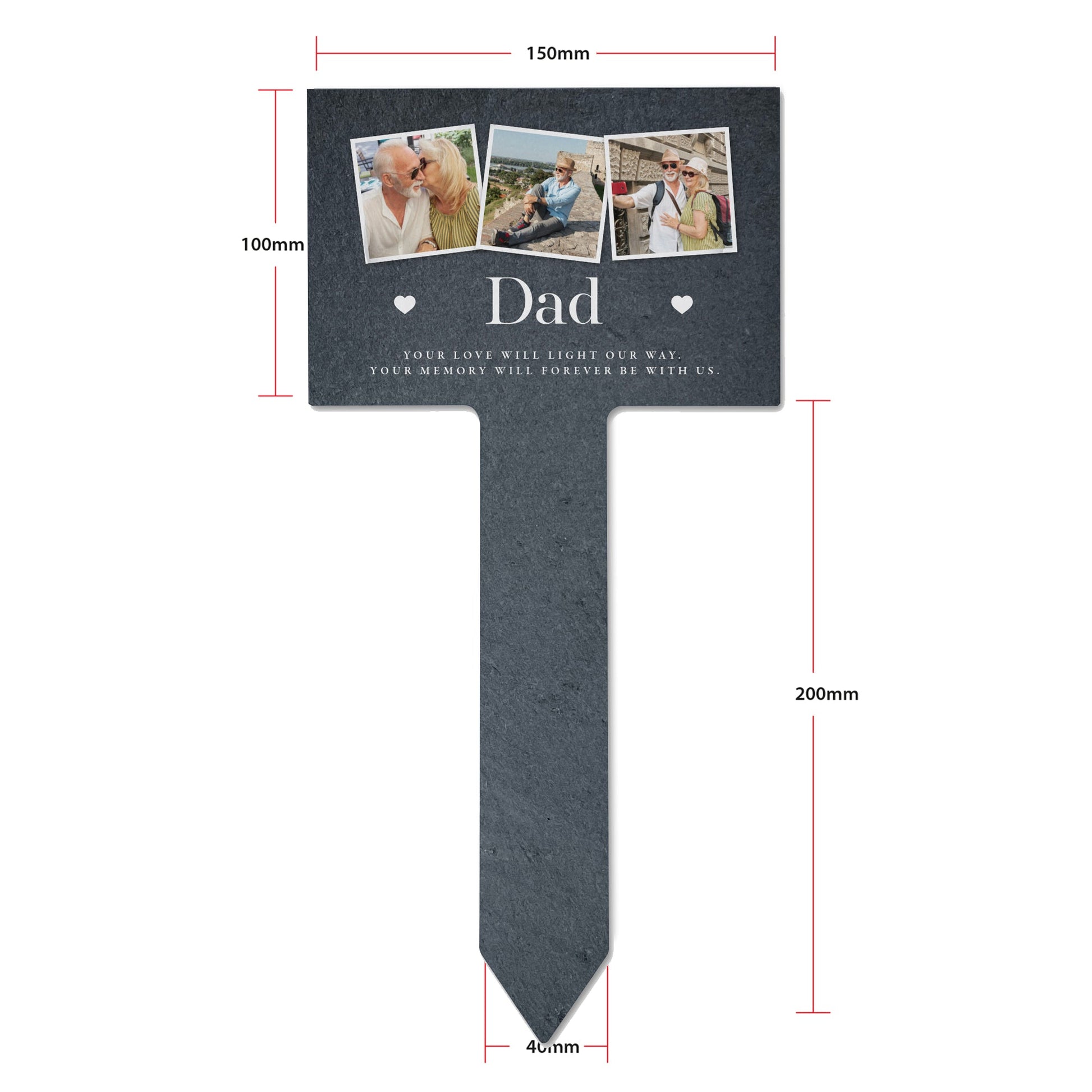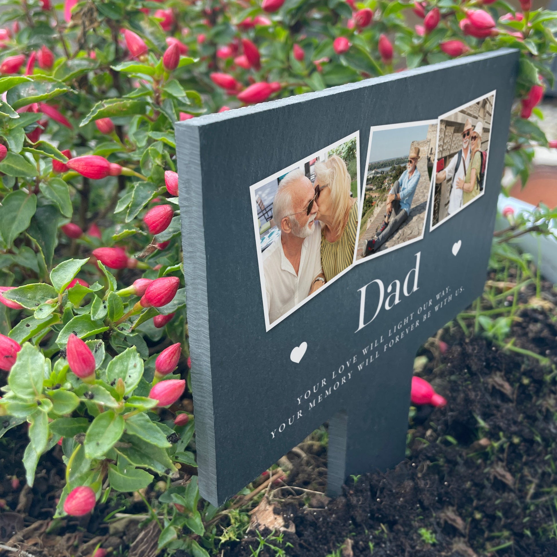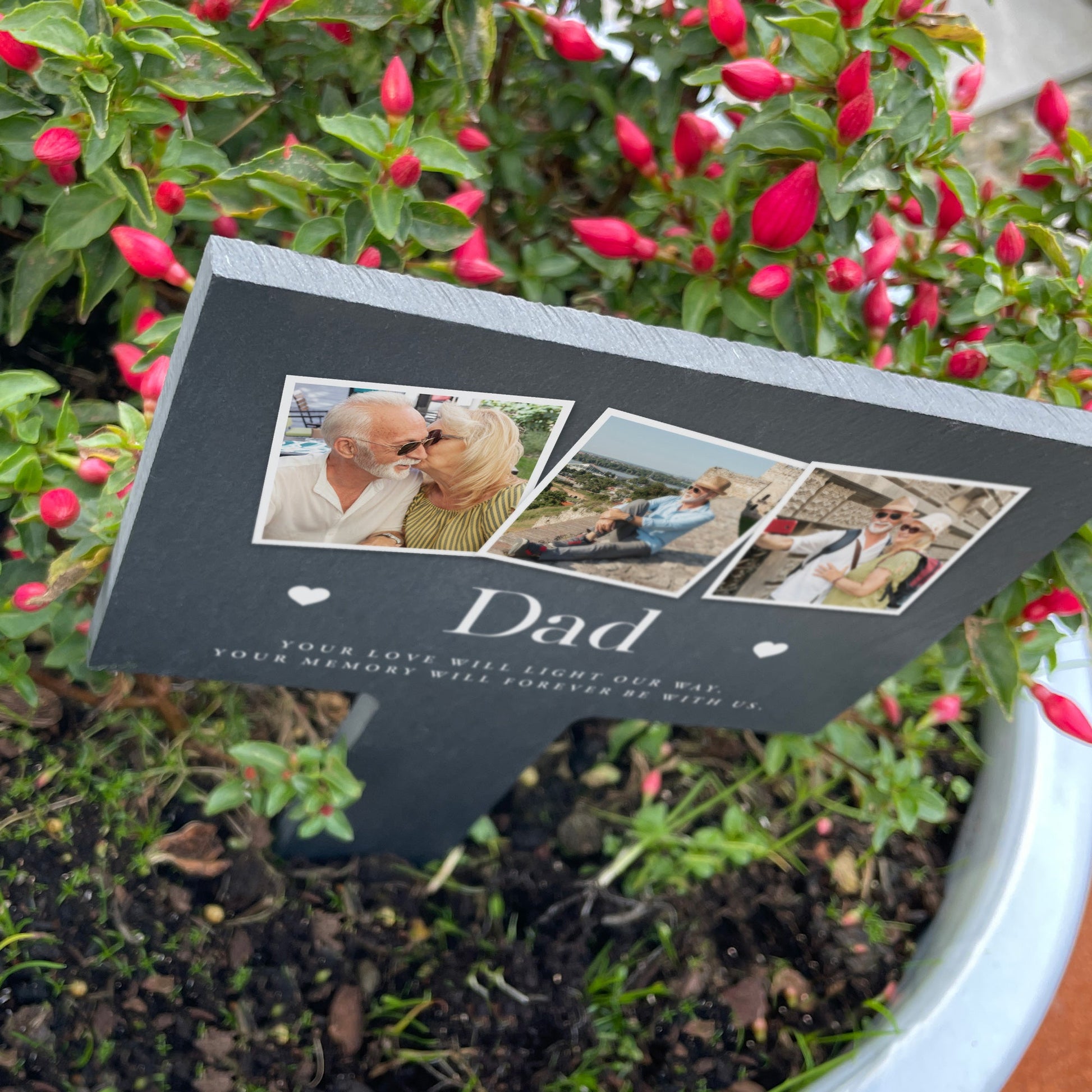 Personalise this plant marker with space for three treasured photos, their name, and two lines of text to remember your dearly missed loved one. A small white heart design is featured on either side of their name.