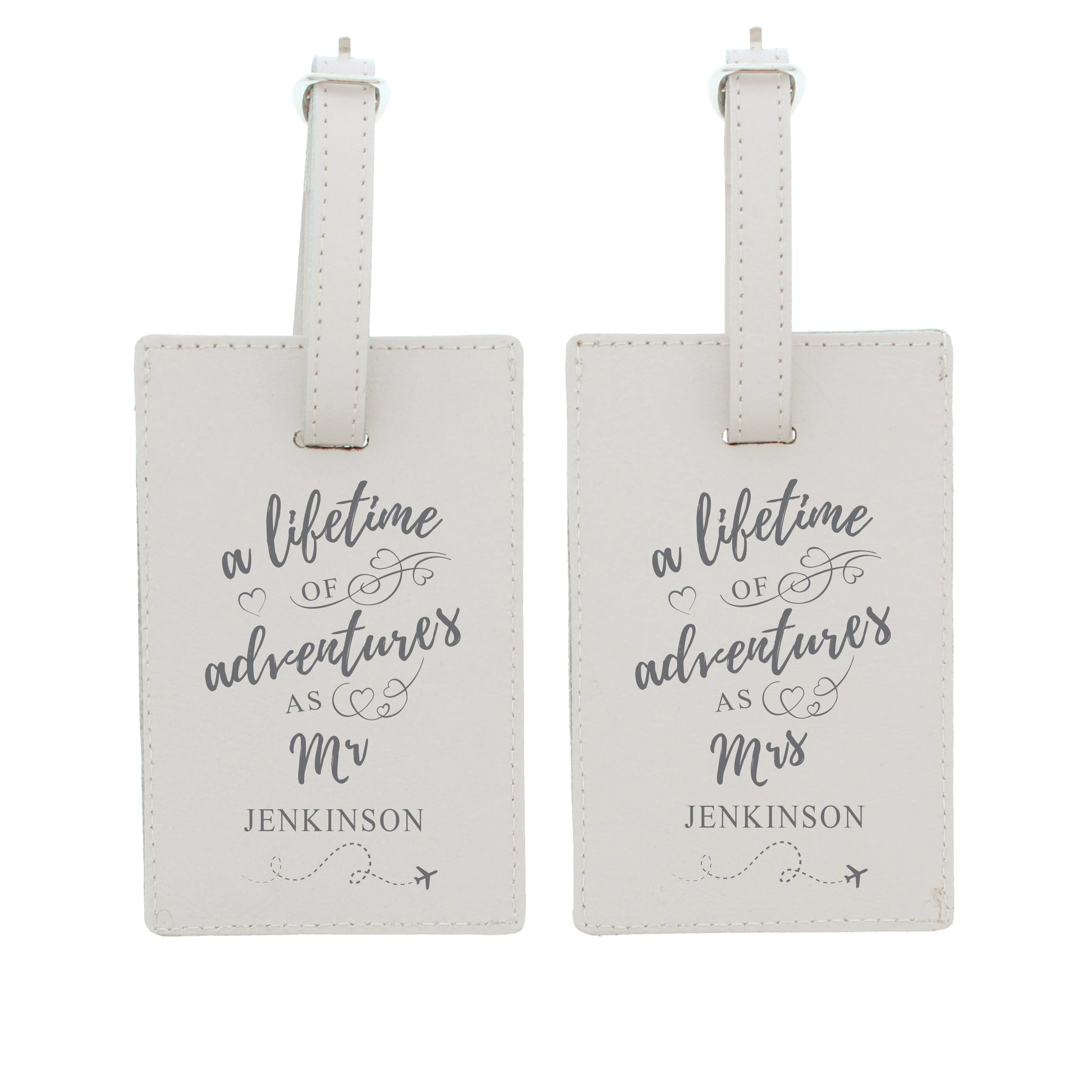 Our personalised Couples Adventures cream luggage tags are the perfect way to set off for a honeymoon in style.