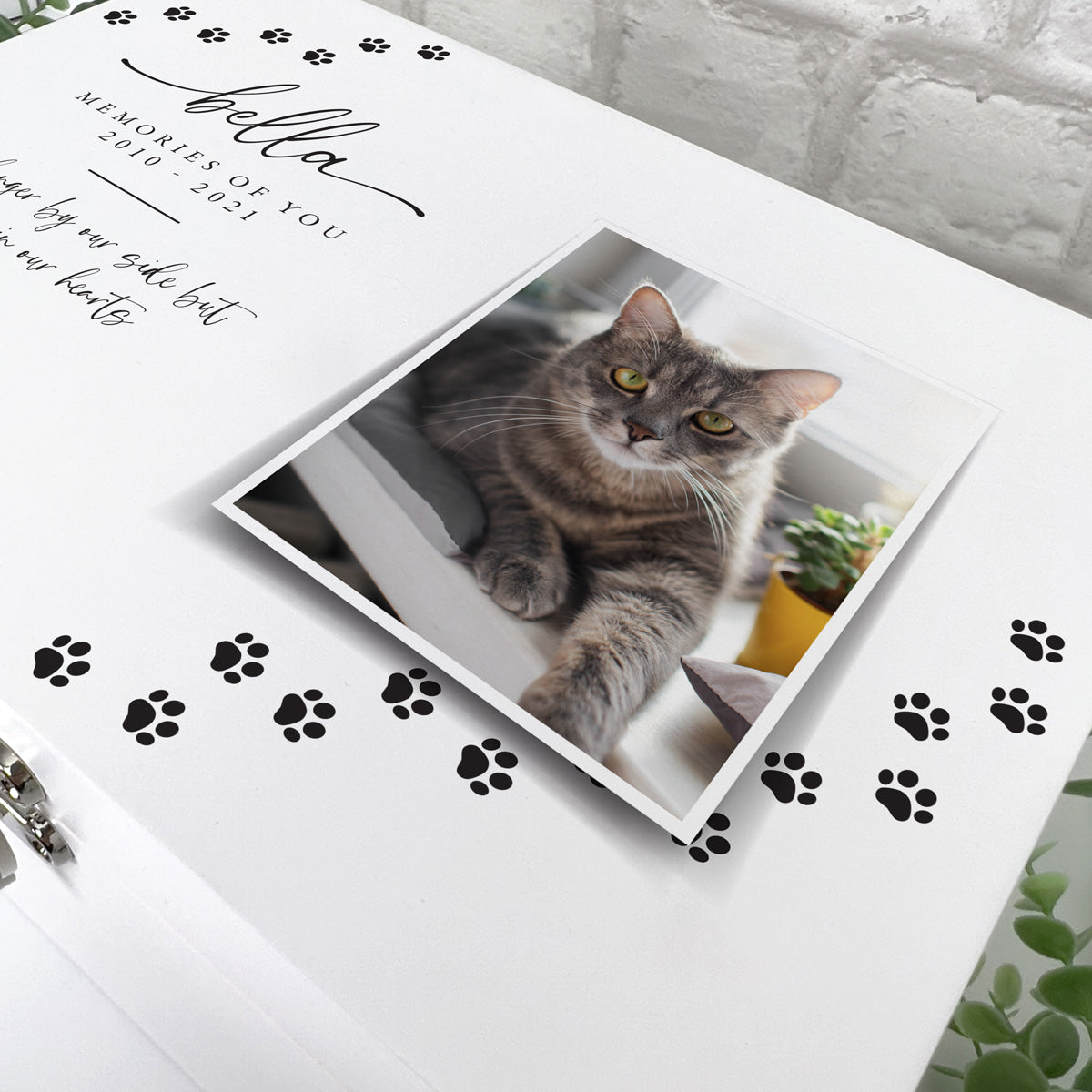 Keep your cherished pet's keepsakes safe in this white wooden photo memory box. Personalise it with your beloved pet's name, date, photo, and a short message.