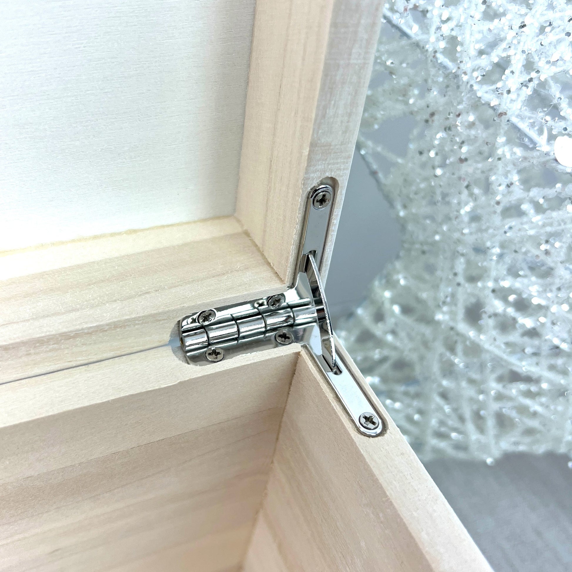 The white boxes are made of pine wood and may have small differences. They have metal hinges and a clasp to keep things safe.