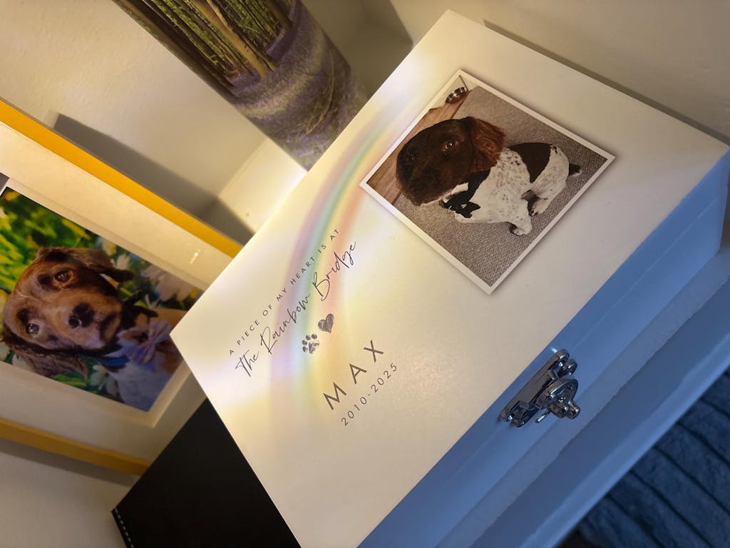 Personalised Rainbow Bridge Pet Photo White Wooden Memorial Keepsake Box - 3 Sizes