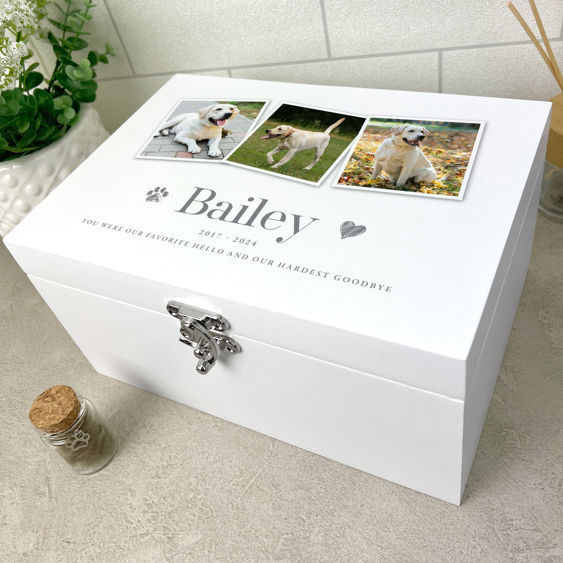 Hold your cherished pet's memories close with this personalised keepsake box. It's designed to beautifully display three of their treasured photos.