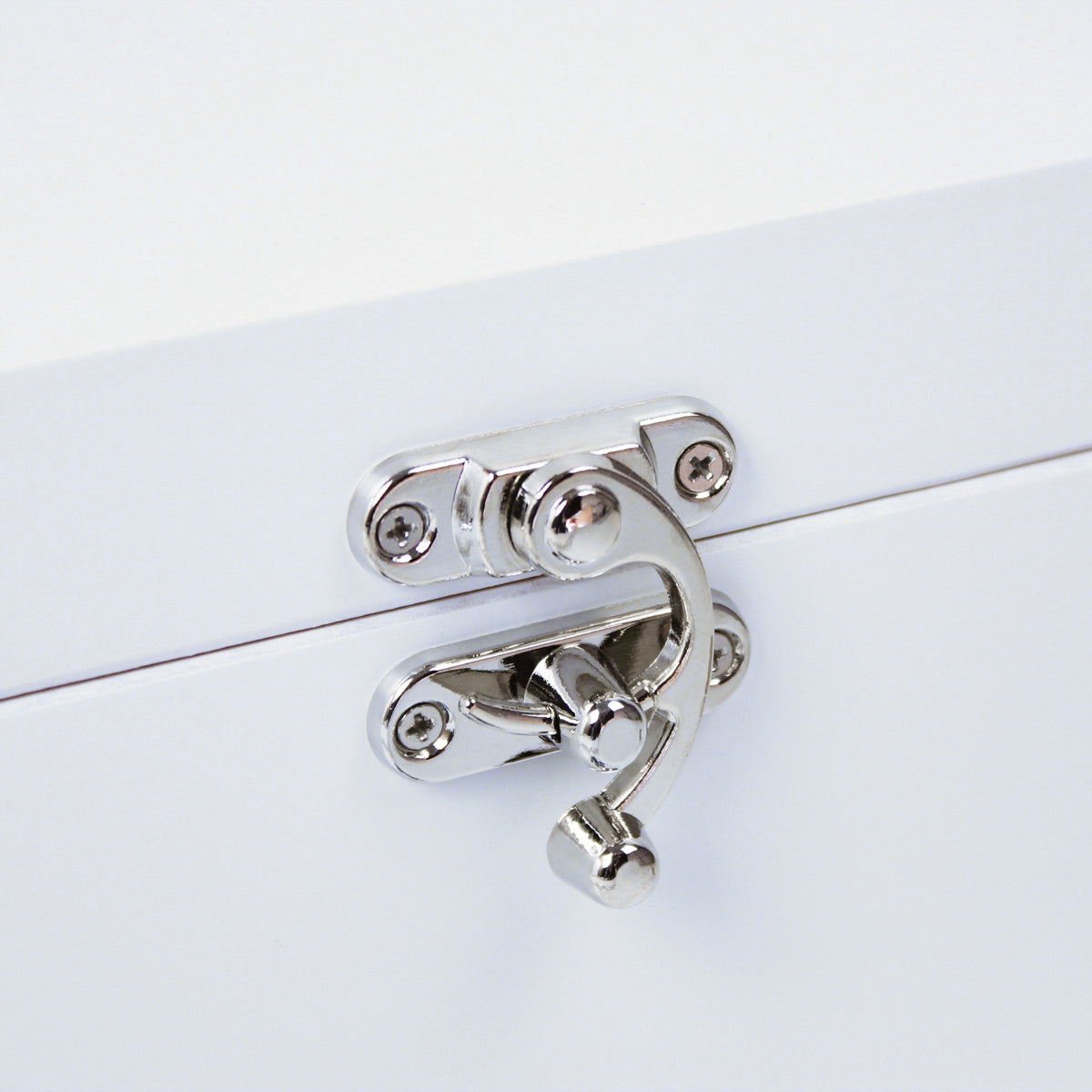 The strong white box is made of pine wood. It has metal hinges and a clasp to keep things safe.