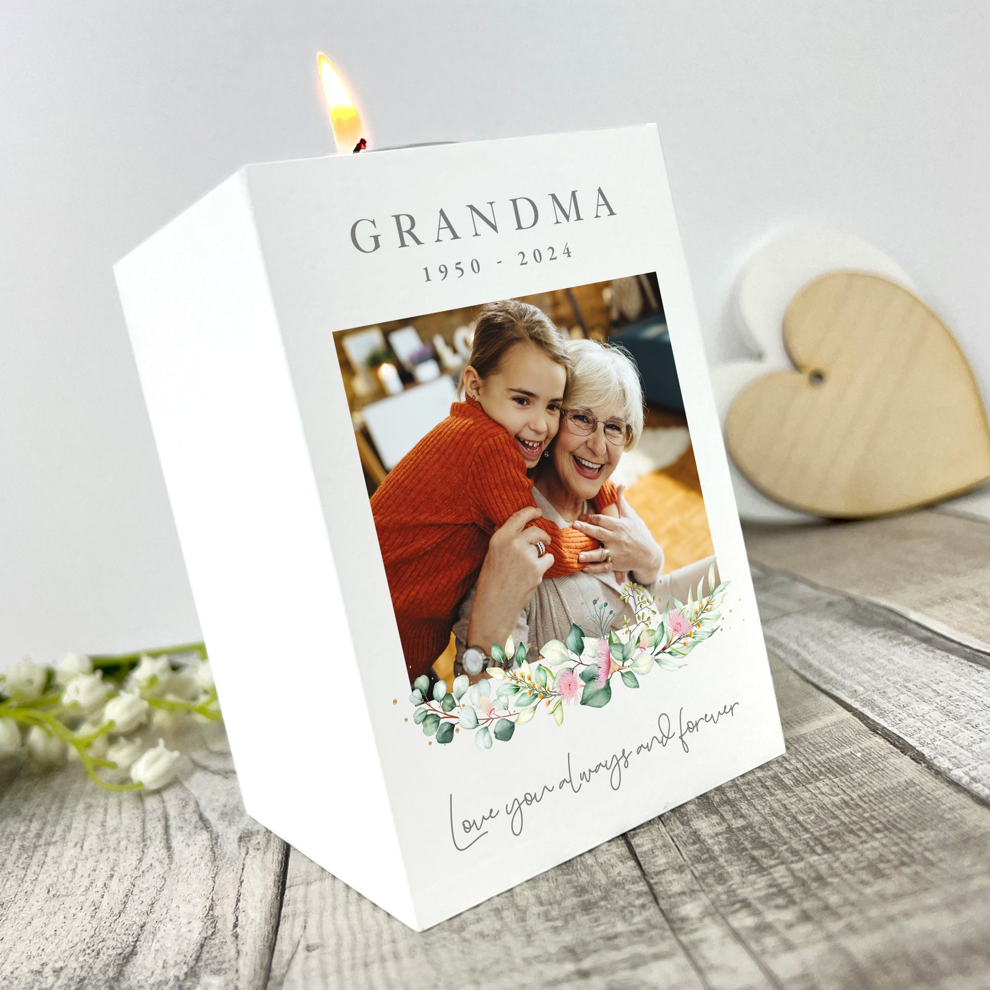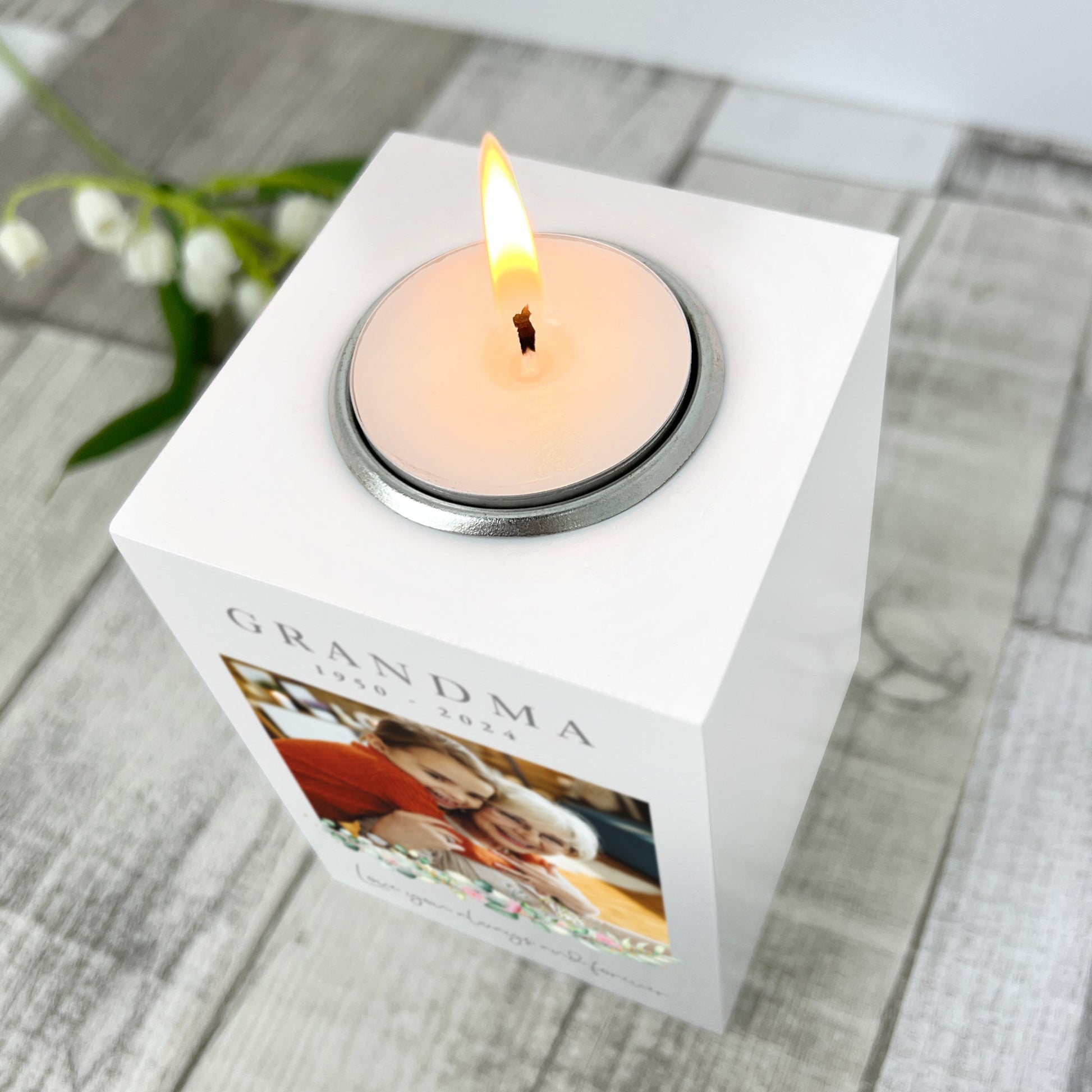 Personalised Memorial Floral White Wooden Photo Tea Light Holder