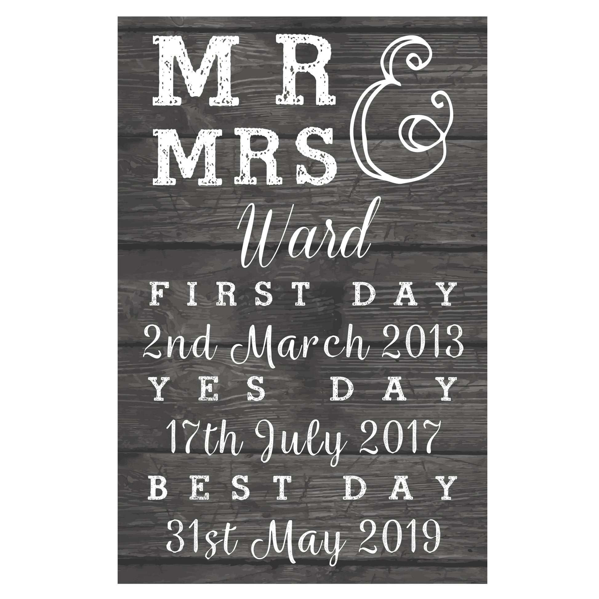 Please note the words 'Mr & Mrs', ' First Day' 'Yes Day' and 'Best Day' are fixed text.