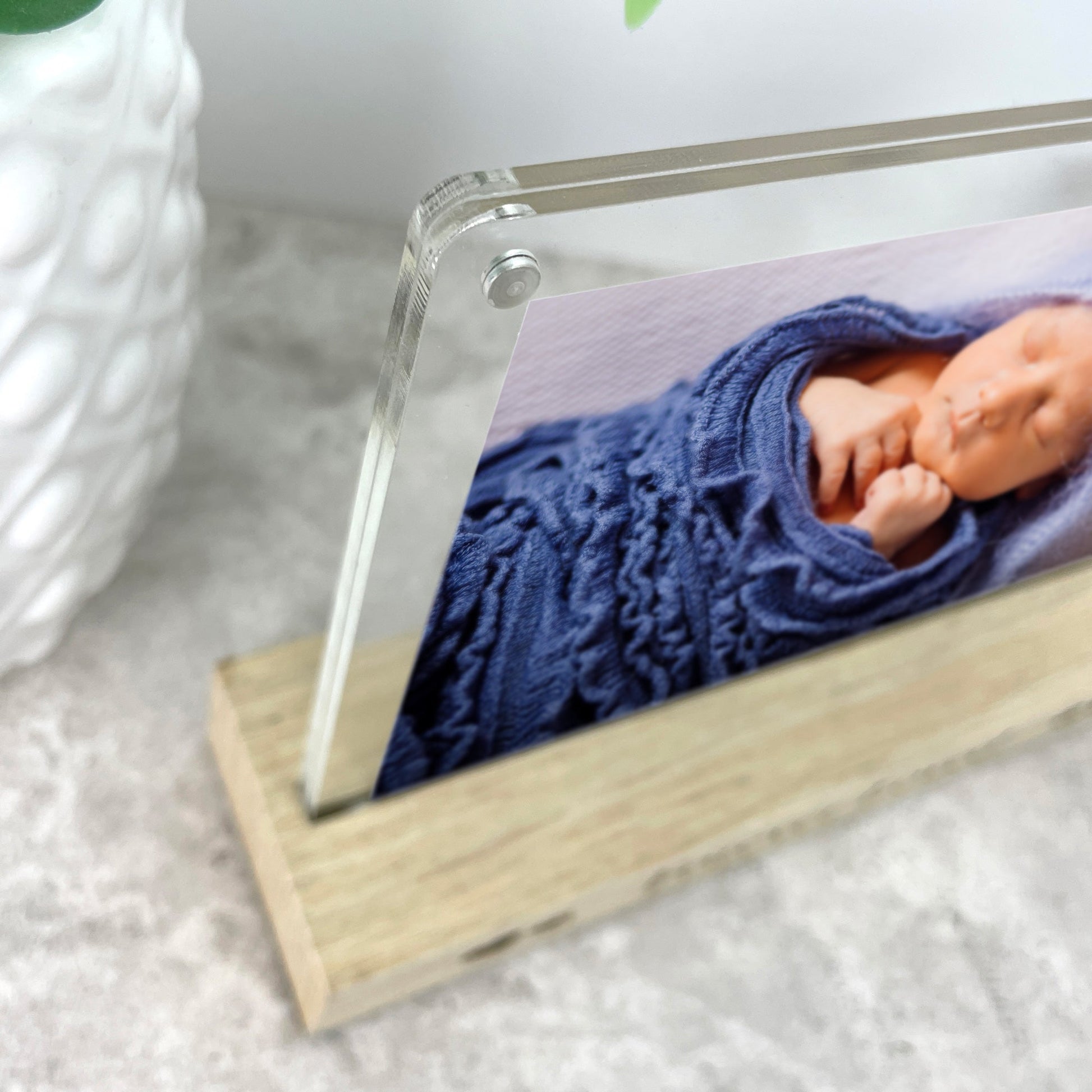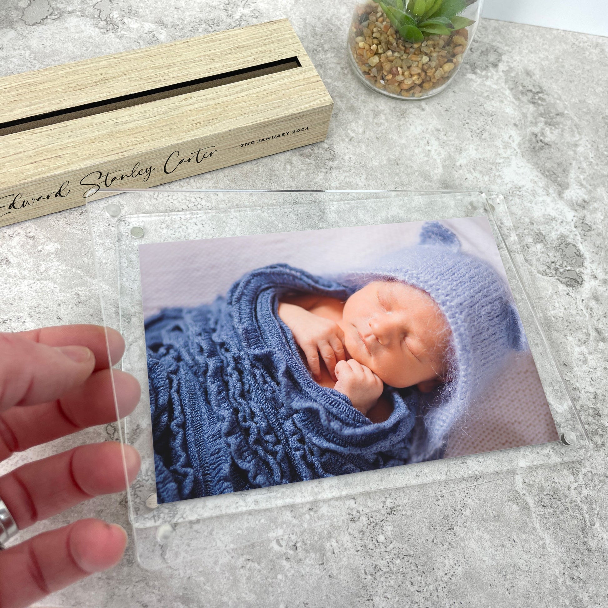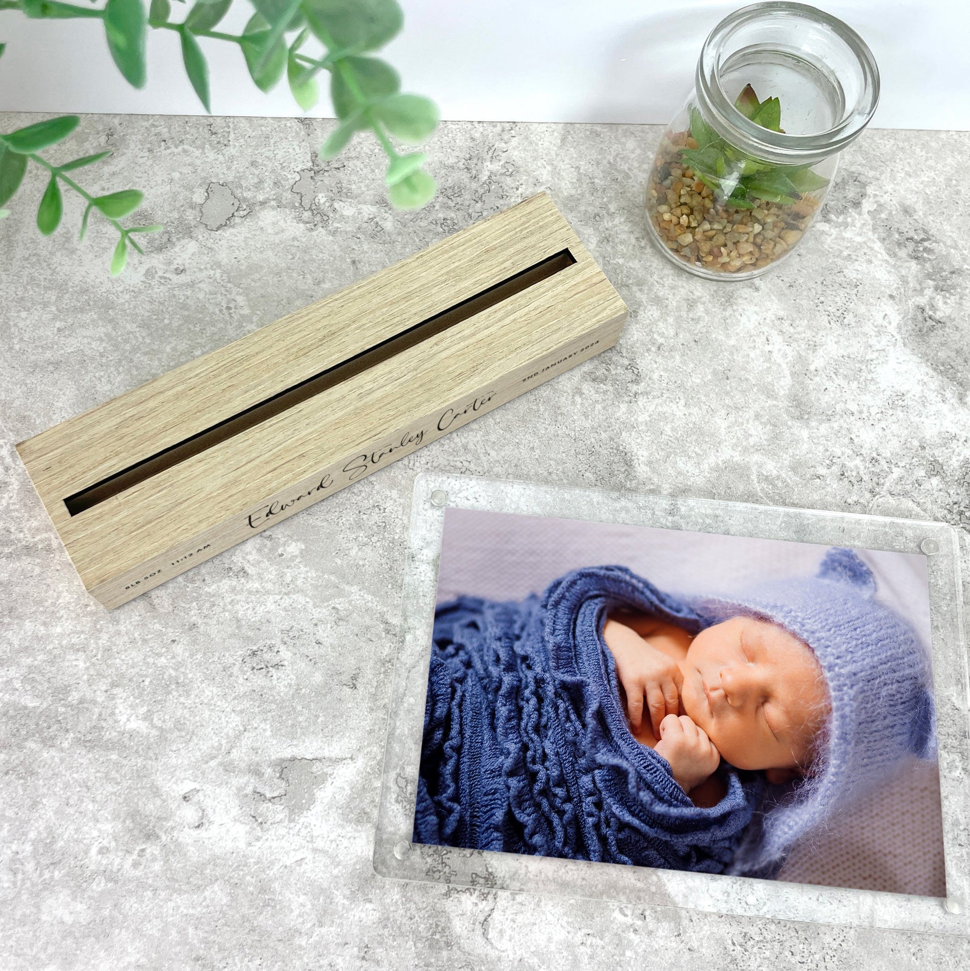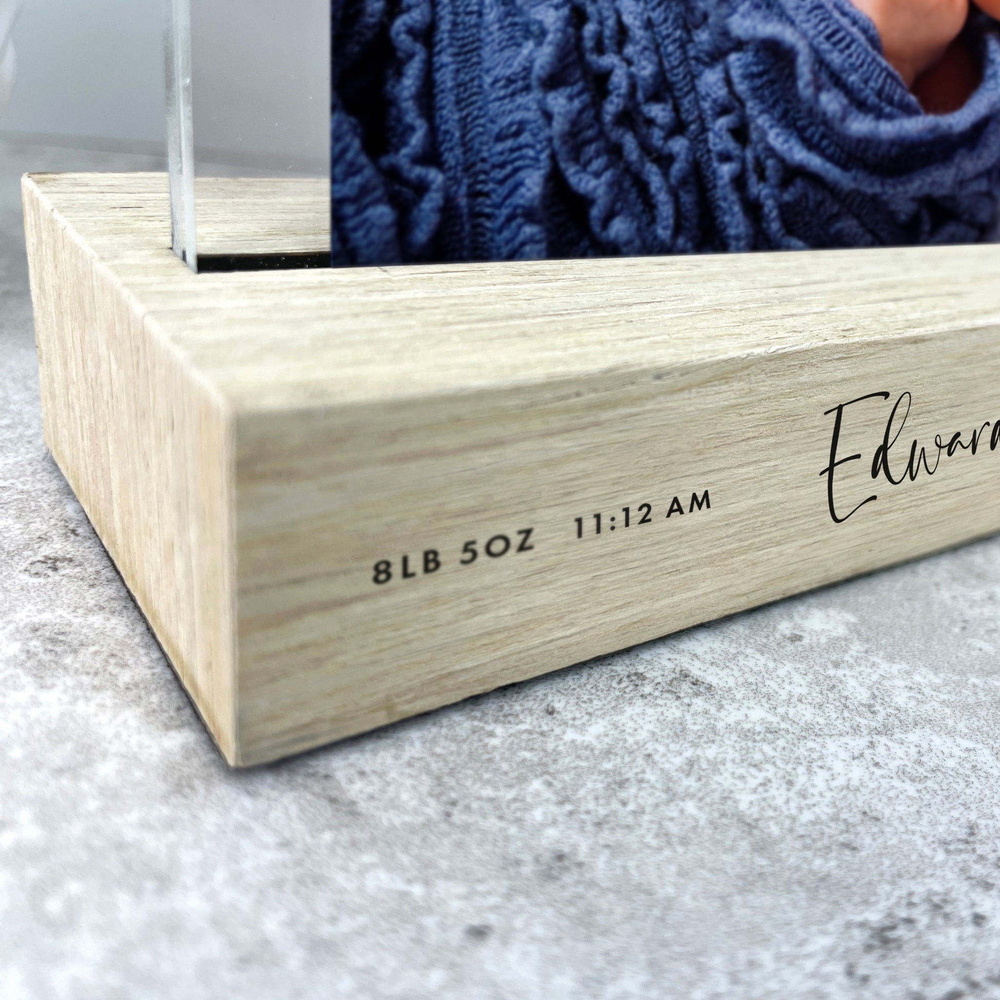 The solid wood base can be personalised with your baby's name, date of birth, time of birth, and birth weight. You can easily insert your favourite 6x4" photograph into the detachable acrylic photo holder.
