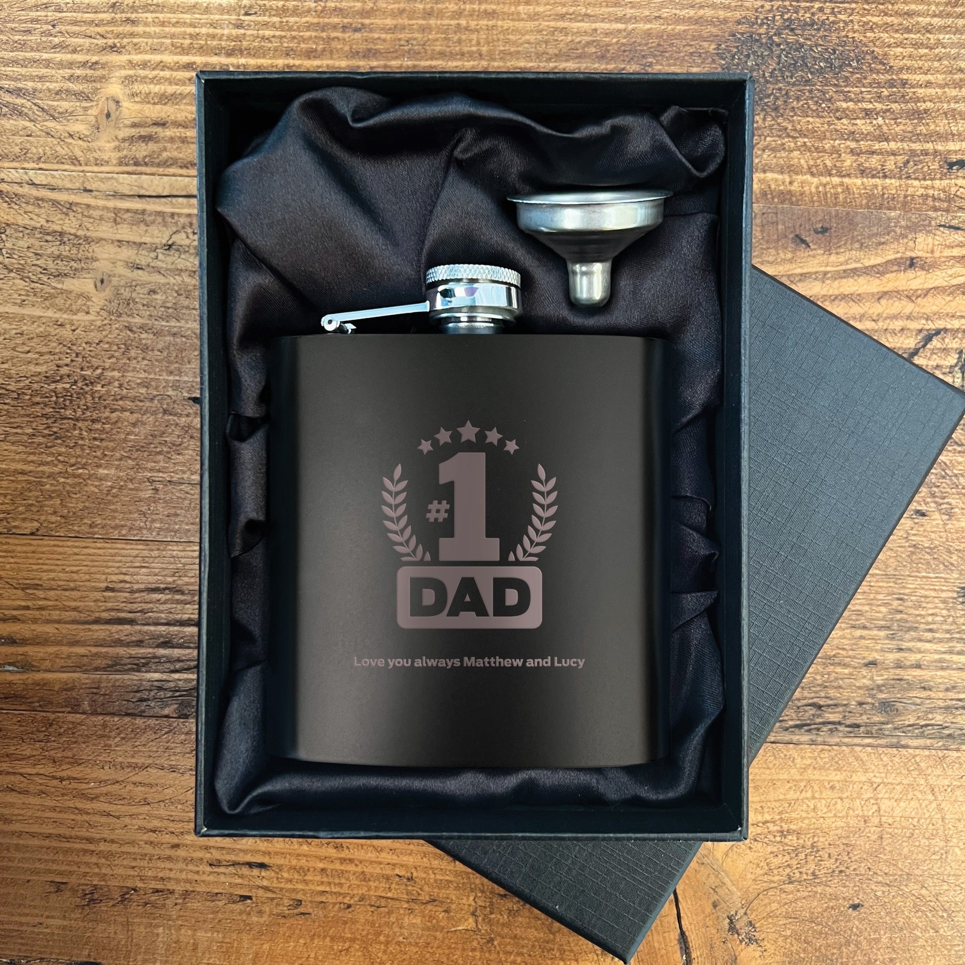 Celebrate the best dad around with this cheeky No.1 Dad engraved hip flask! Crafted from sturdy black metal, this 6oz flask is ideal for stashing his favourite tipple, whether that's whisky, gin, or something stronger.