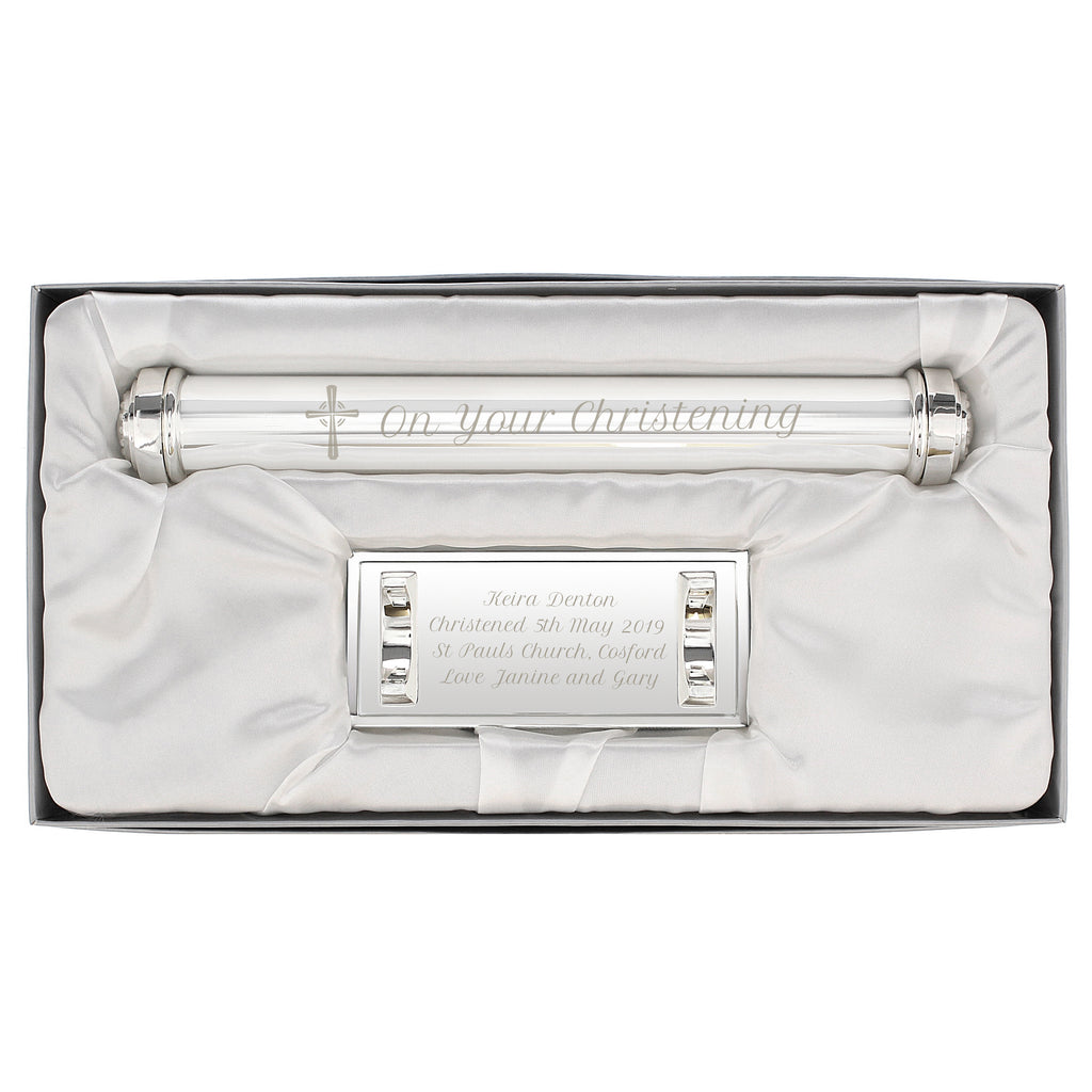 The wording 'On Your Christening' featured on the holder is fixed text.