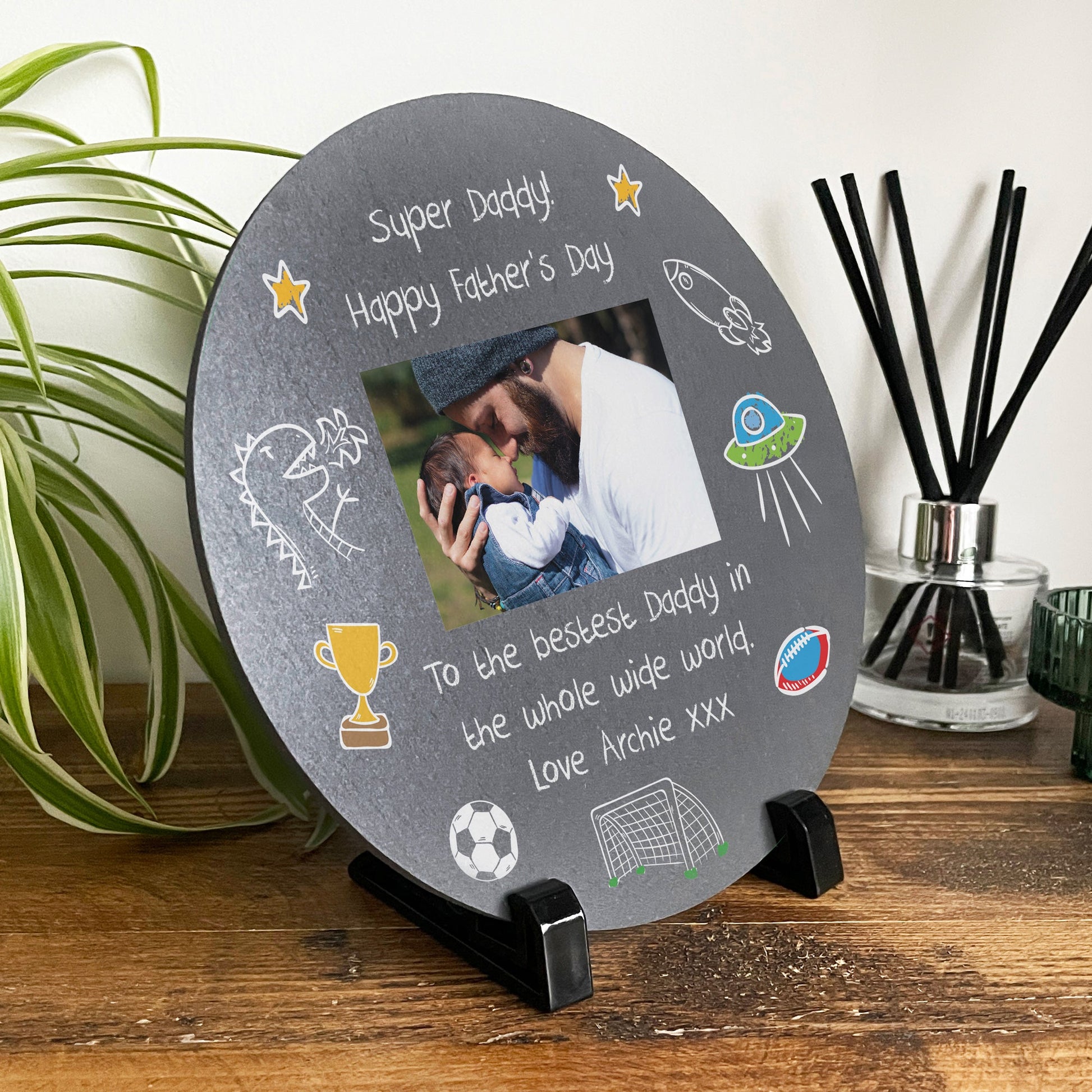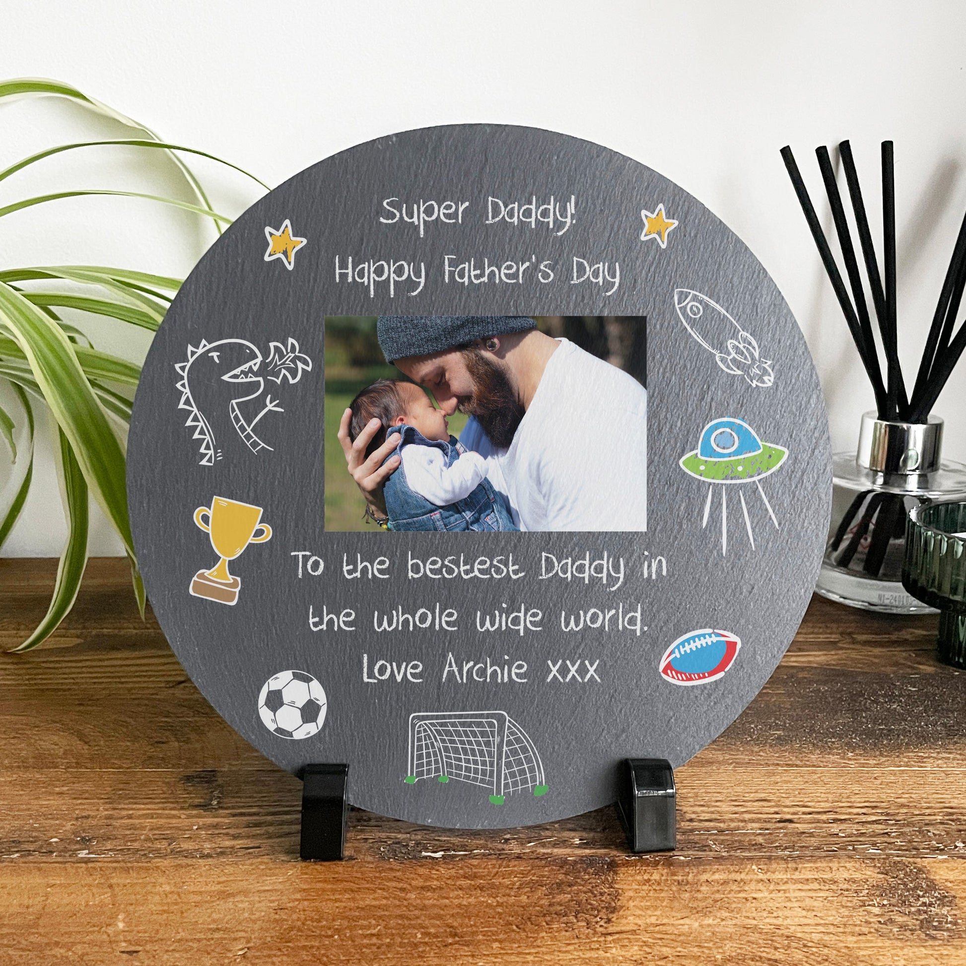 Surprise Dad with a unique slate photo keepsake for Father's Day! This cute slate plaque allows for customising with five lines of text, perfect for showing Dad some love. Playful kids' drawings frame your heartfelt message, making any new Dad feel extra special.