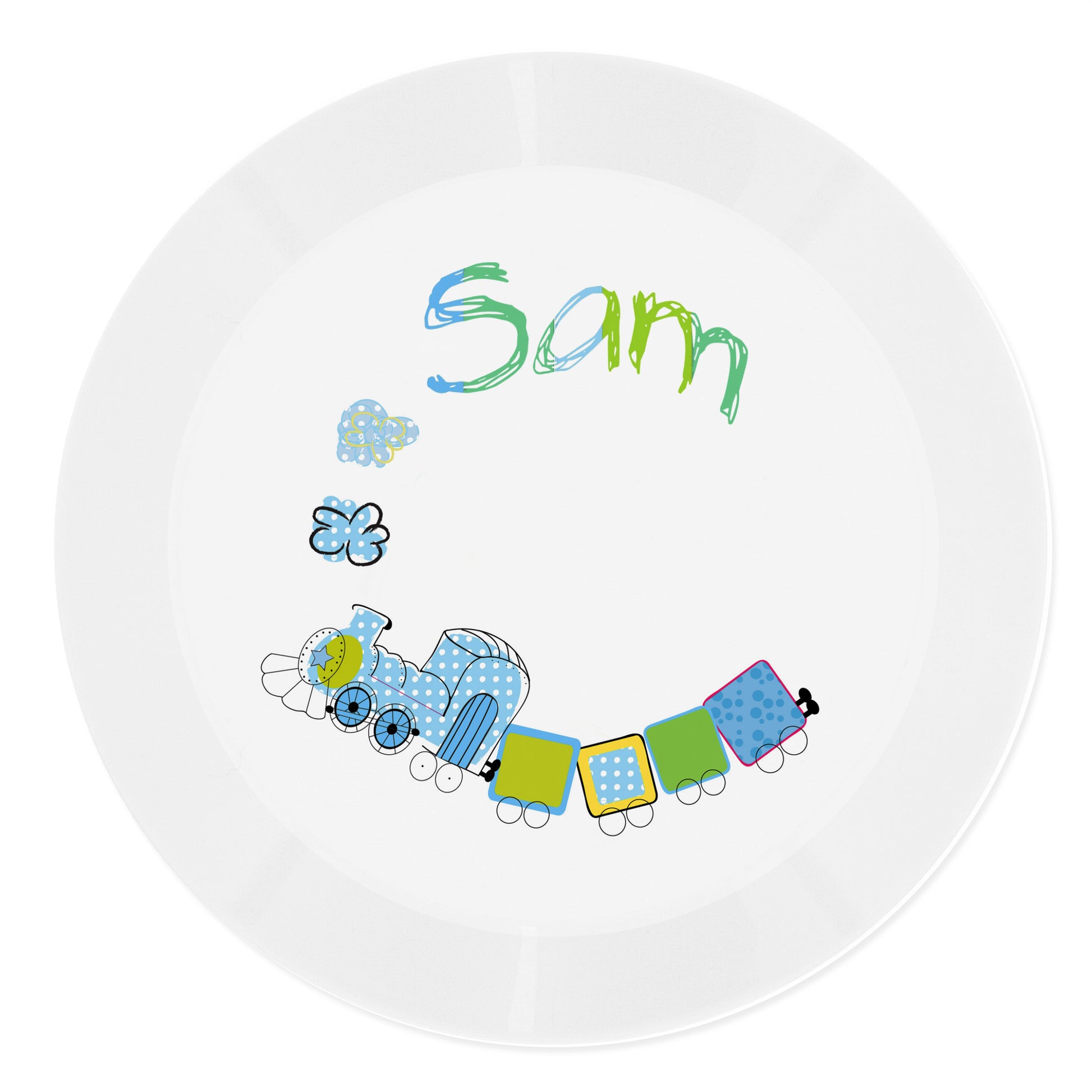 Personalise this patchwork train plate with a name up to 12 characters long.