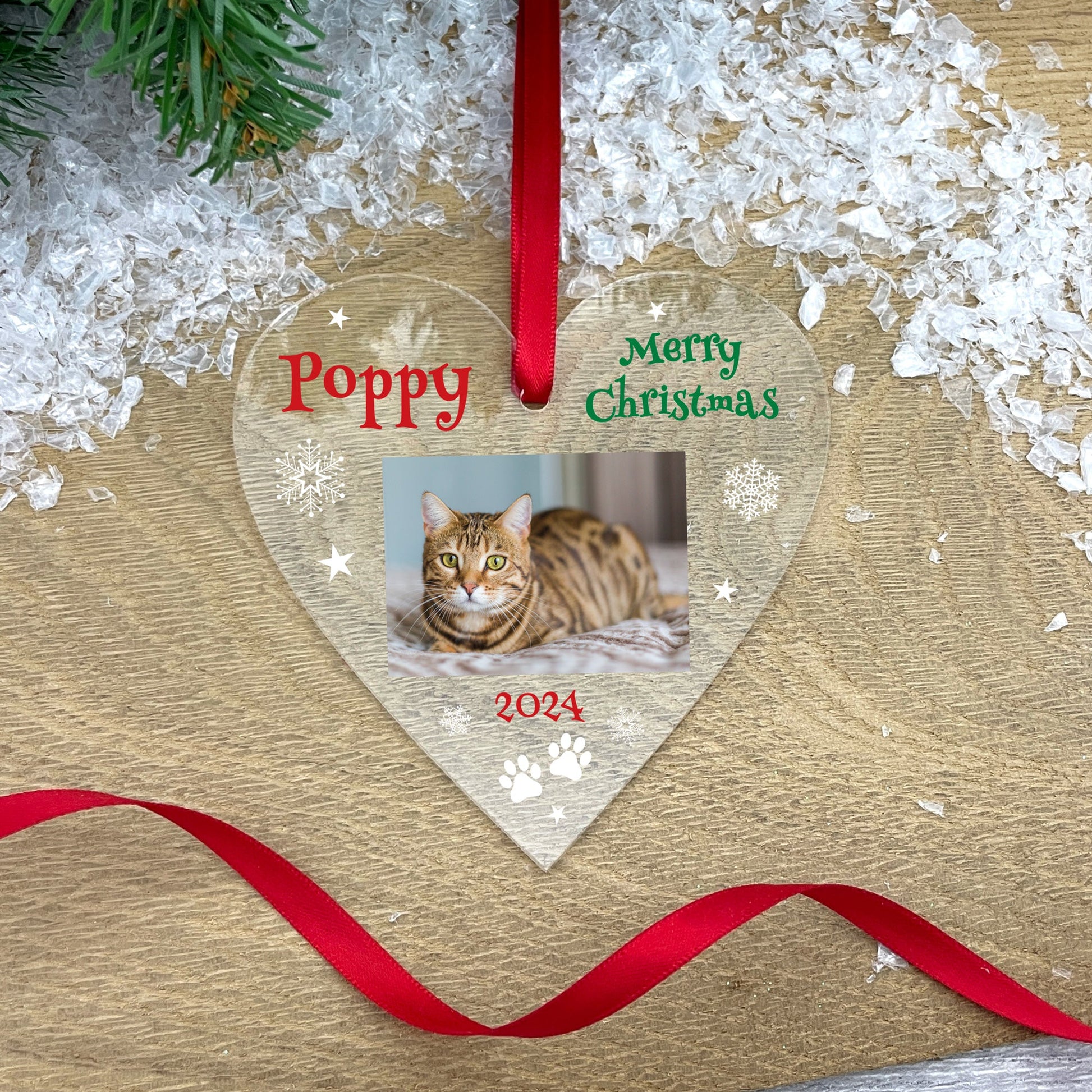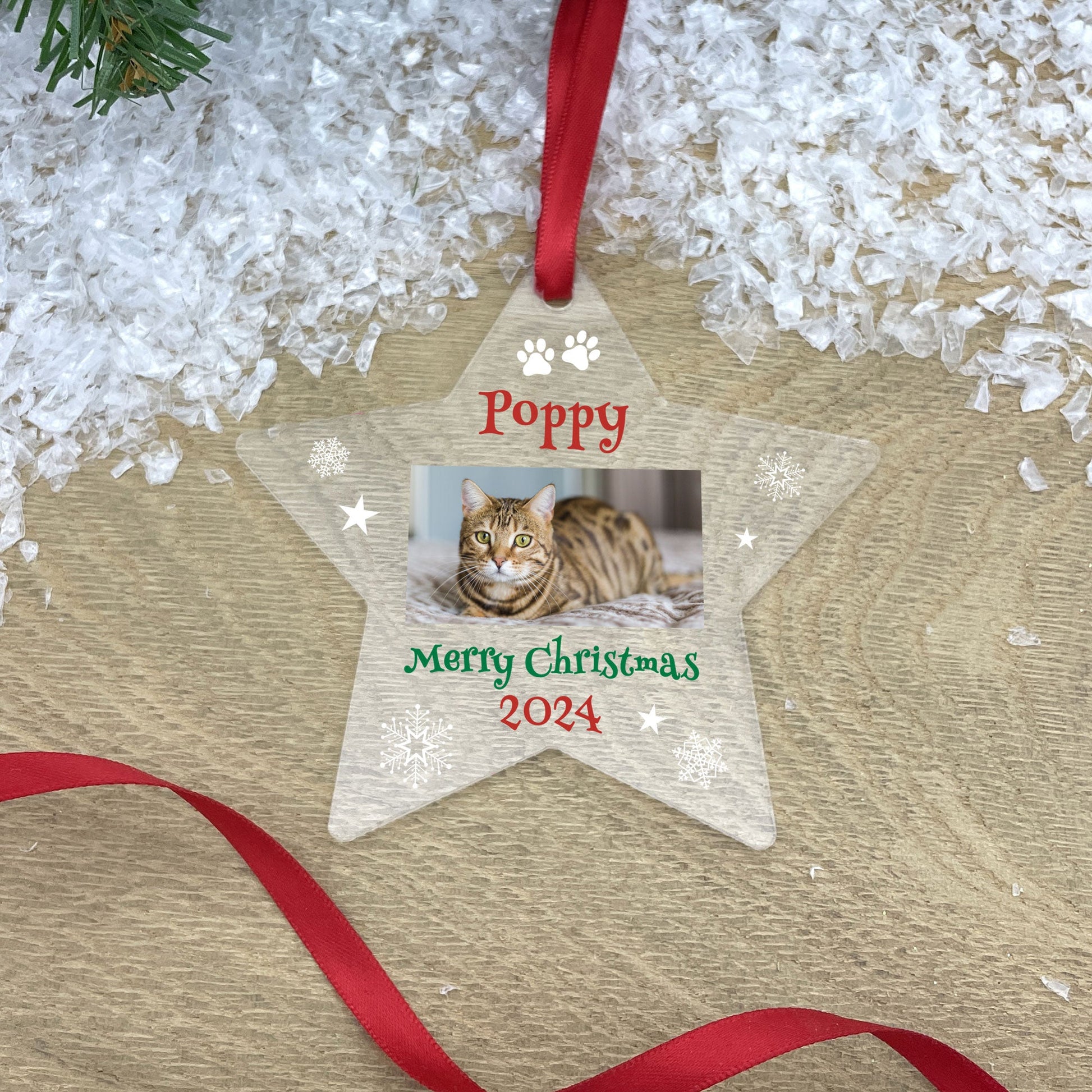 Choose from clear acrylic shapes like a bauble, heart, or star. Upload your favourite photo and personalise it with any name and year. The phrase "Merry Christmas" is included as a fixed message.