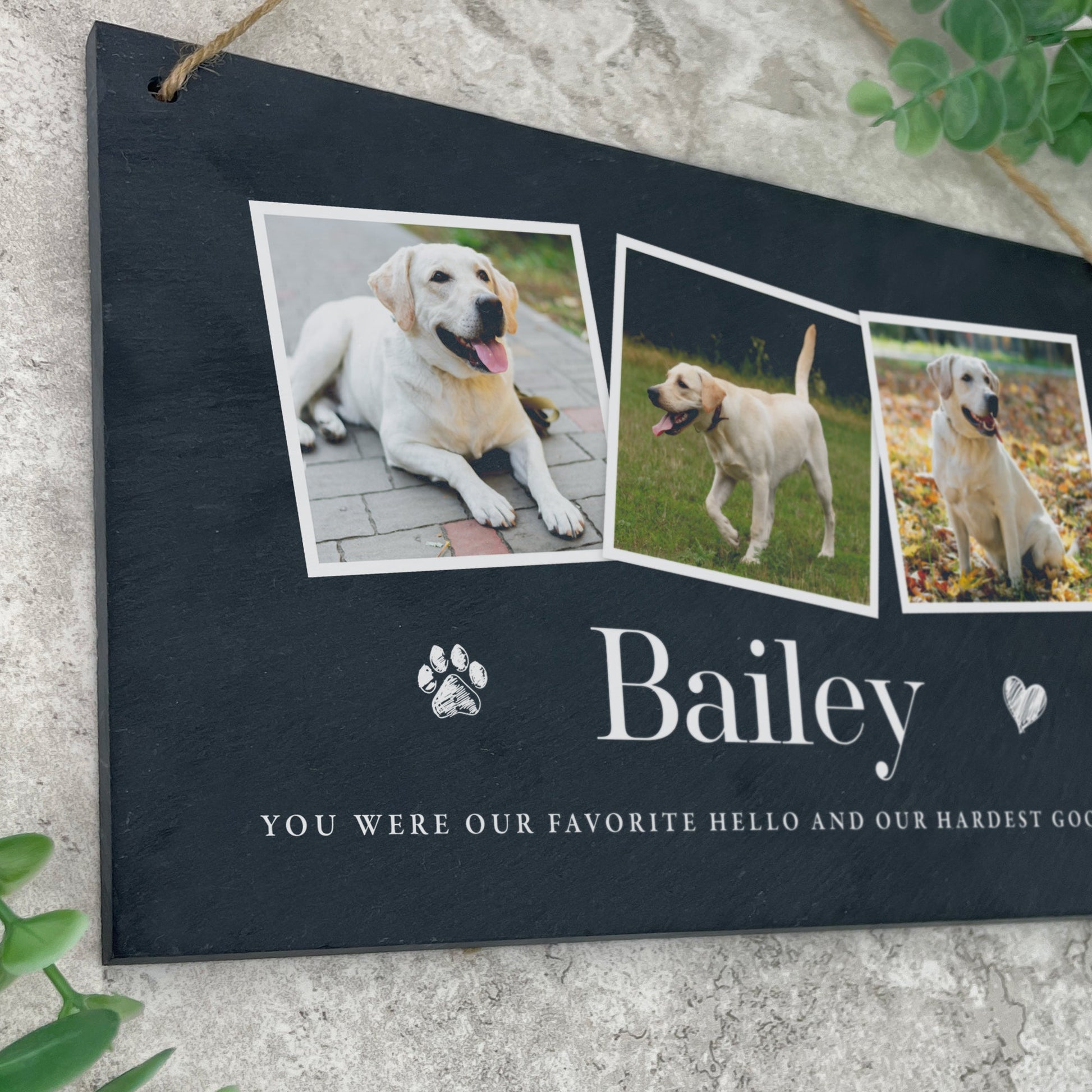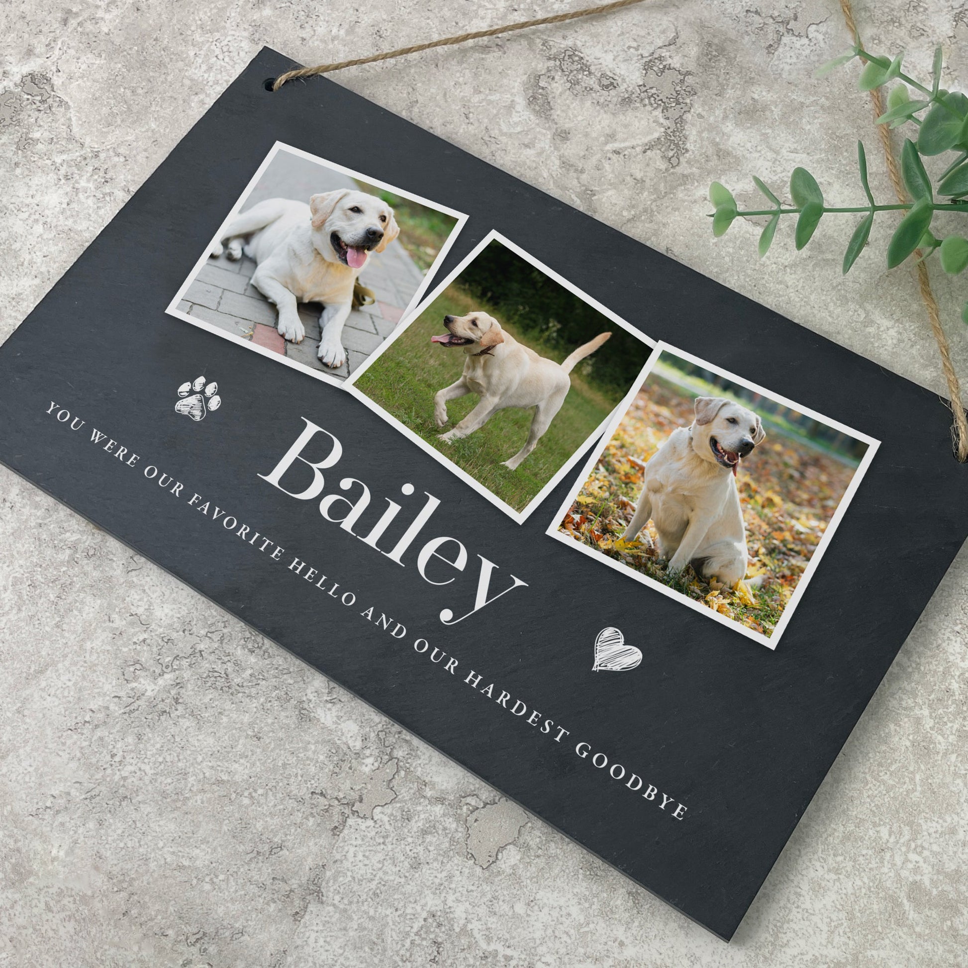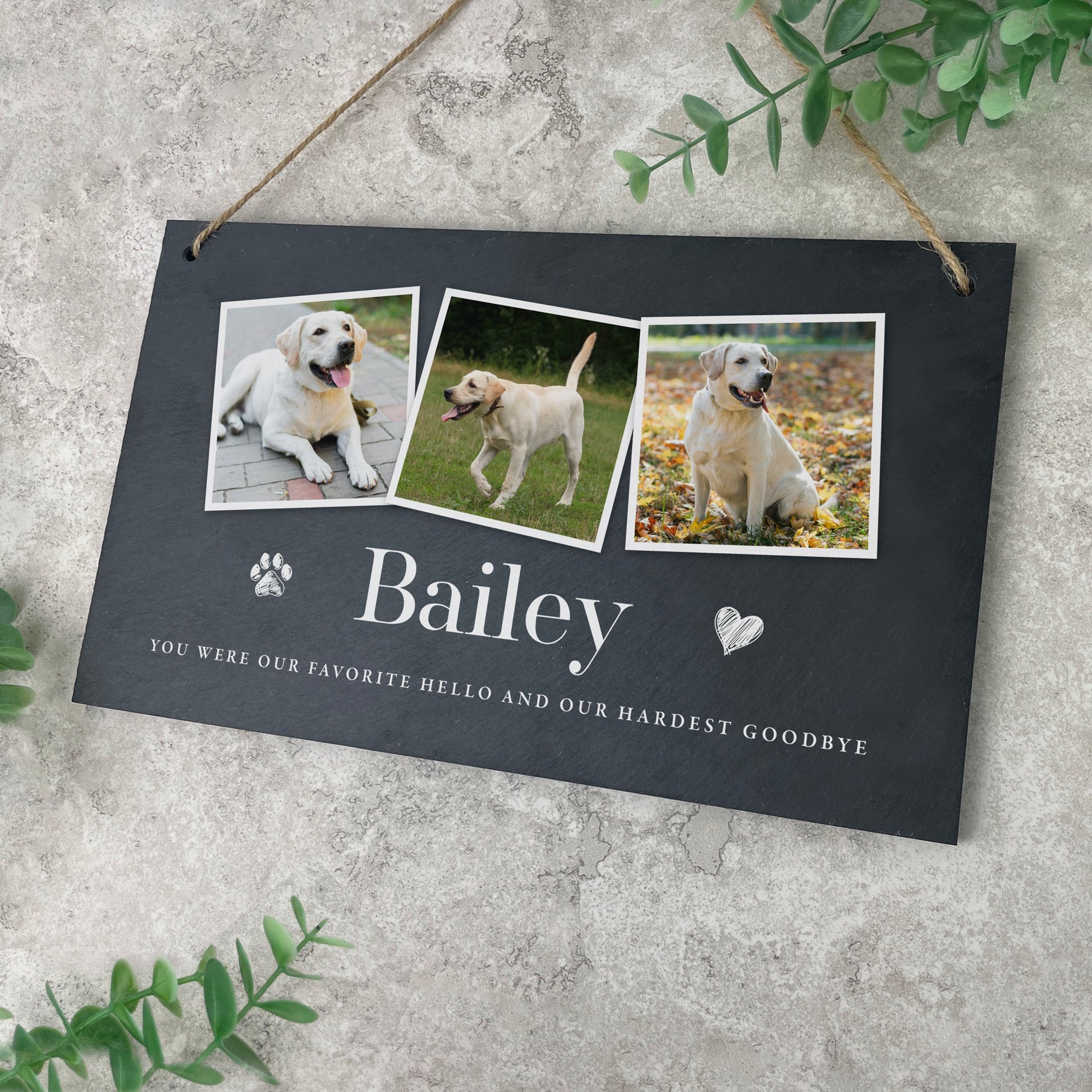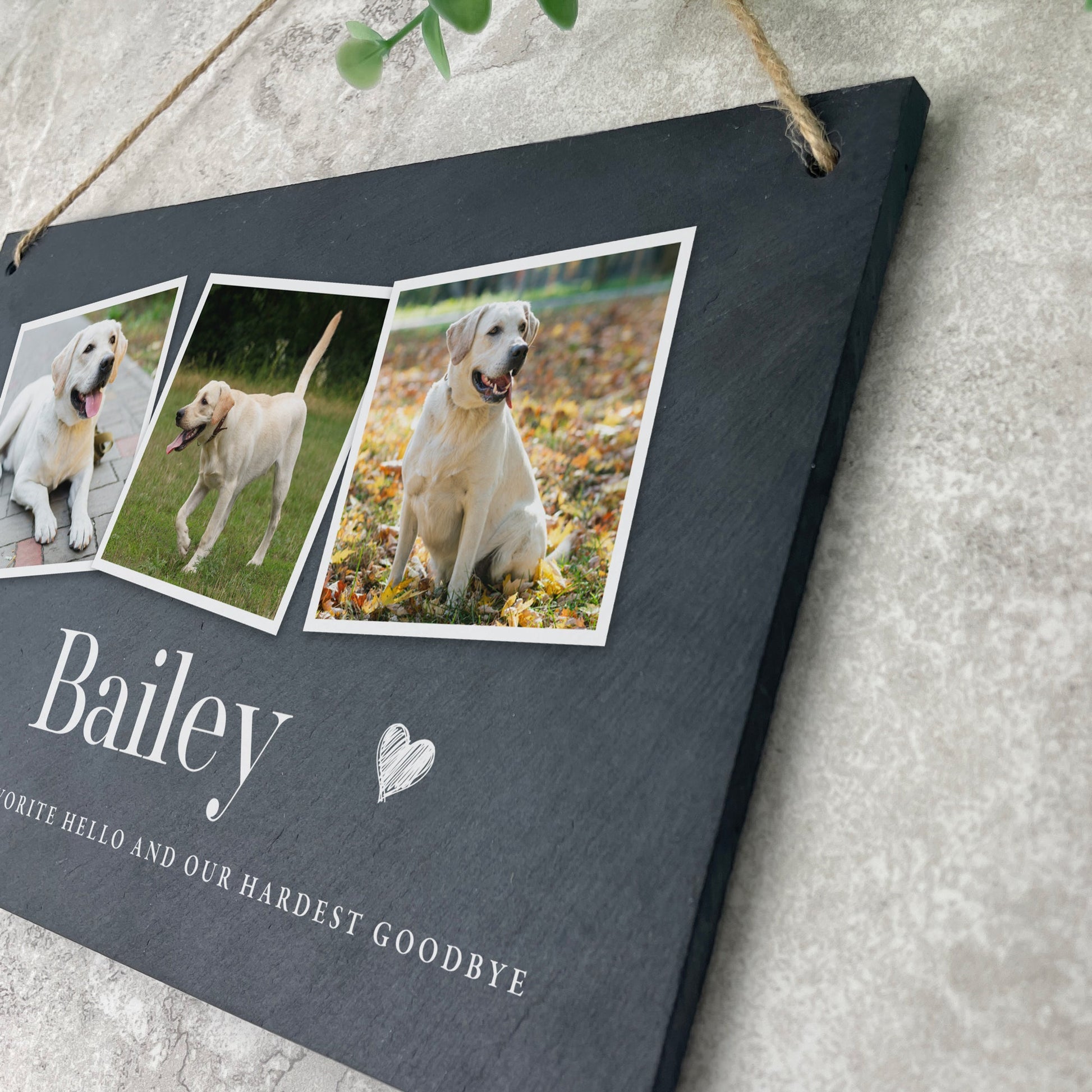 Remember your beloved furry companion with this customisable plaque, perfect for any corner of your home, garden, or memorial. Display three cherished photos of your pet, their name, and a touching message or verse on a strong slate surface.