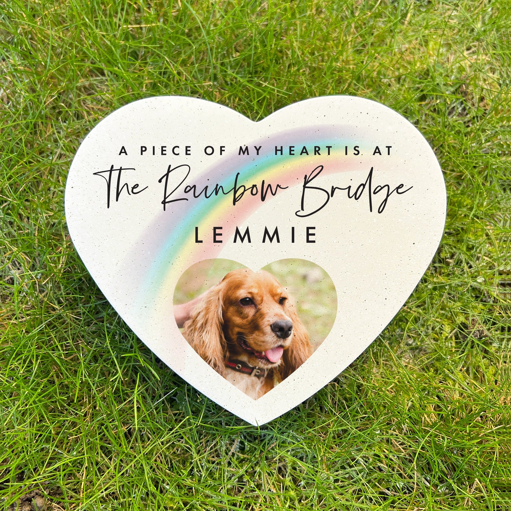 Create a lasting memorial for your cherished pet with this personalised heart-shaped grave marker. Display a treasured photograph of your companion alongside their name, paired with the comforting Rainbow Bridge message: "A piece of my heart is at Rainbow Bridge".