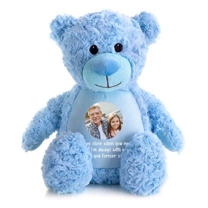 Our blue teddy bears are incredibly soft and perfect for any event, making them a unique and bespoke gift. You can personalise this bear with a beloved photo and a message of up to 3 lines for a birthday, anniversary, Christmas, christening, Mother's Day, Father's Day, and more!
