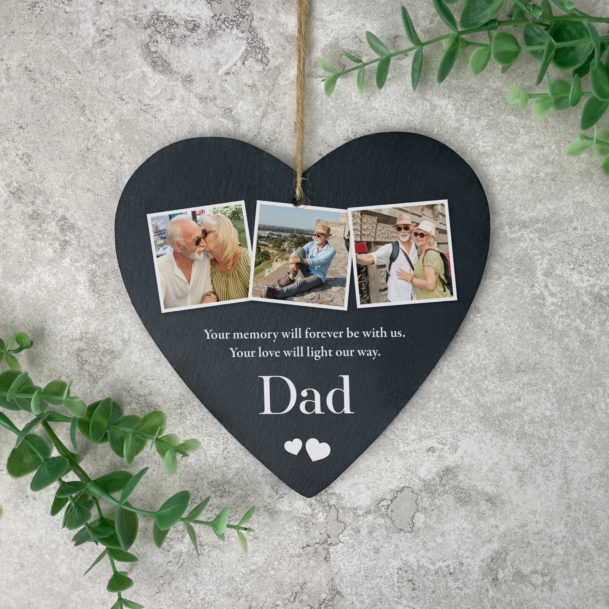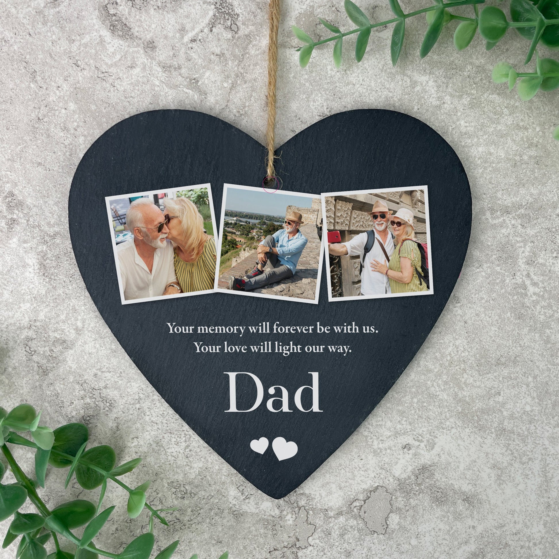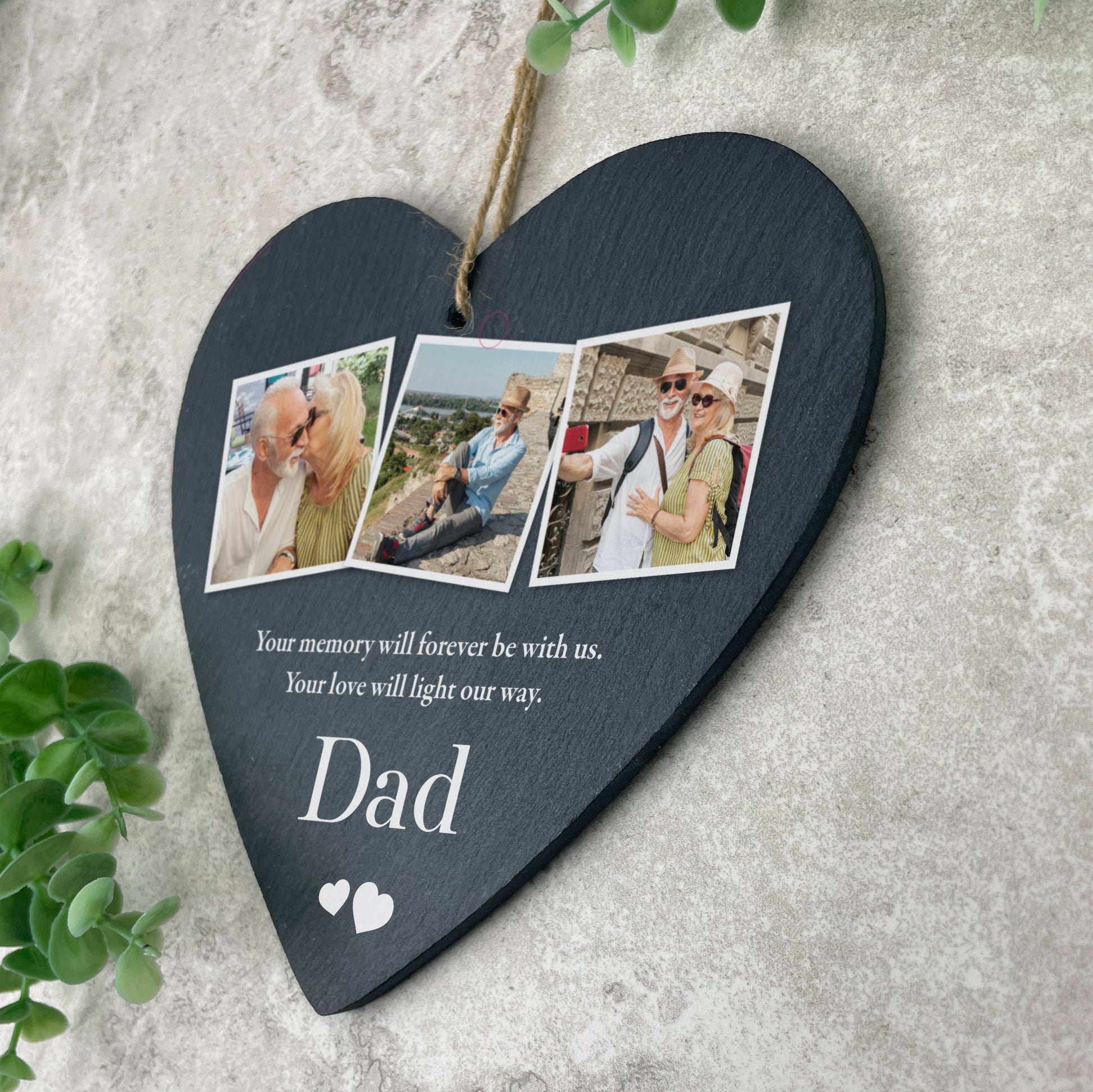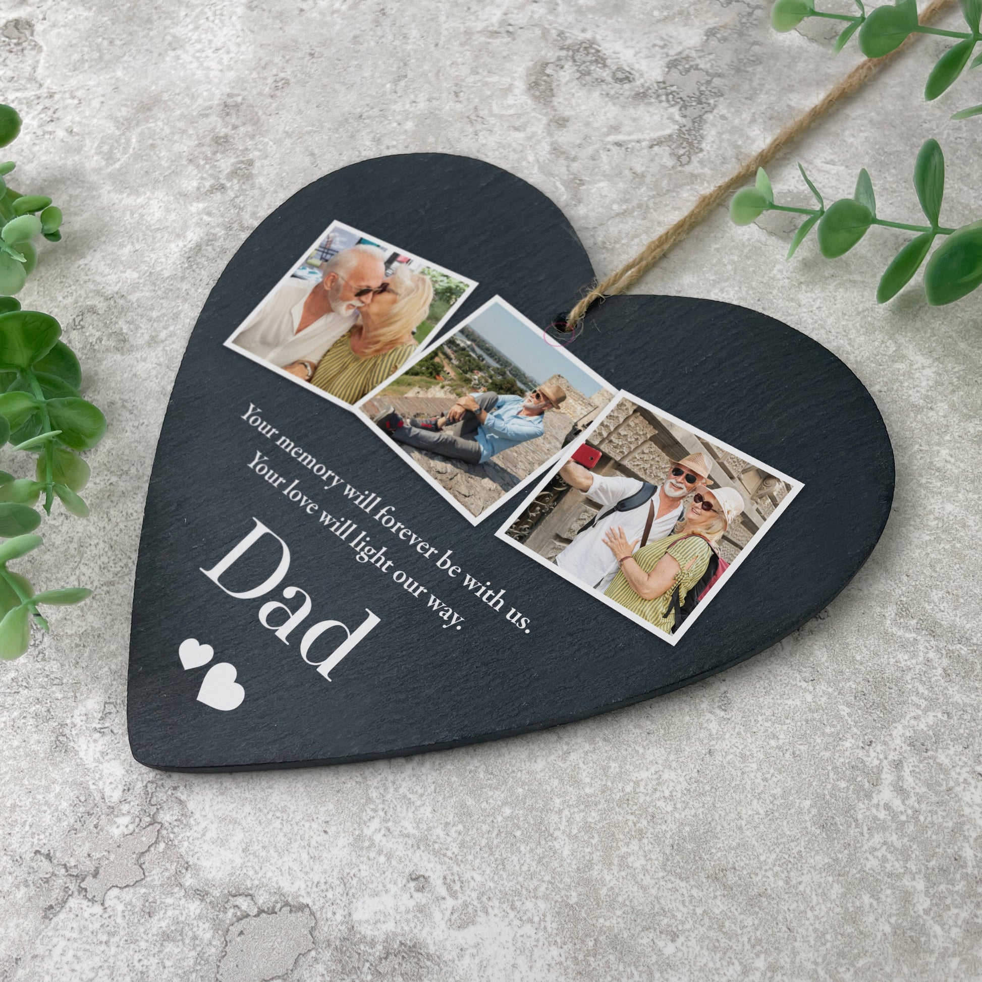 Design a beautiful and lasting memorial with this personalised heart-shaped slate for your home, garden, or resting place. Customise it with three cherished photos, two lines of text, and your loved one's name for a truly personal remembrance.