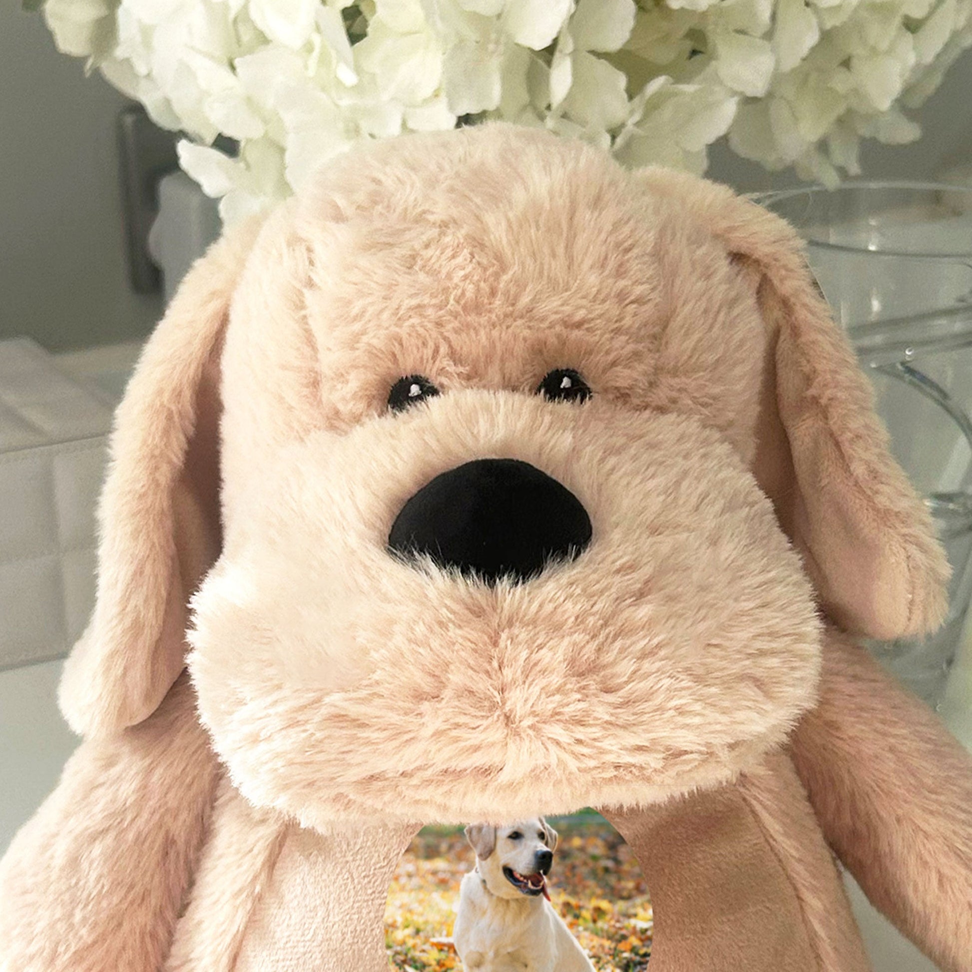 Celebrate a 'Gotcha Day', a special birthday, or remember a beloved pet with this personalised photo teddy. This super-soft pup is perfect for cuddles and can be personalised with your favourite photo, their name, and a heartfelt message (up to 2 lines). The heart and paw print design sits on either side of the tummy.
