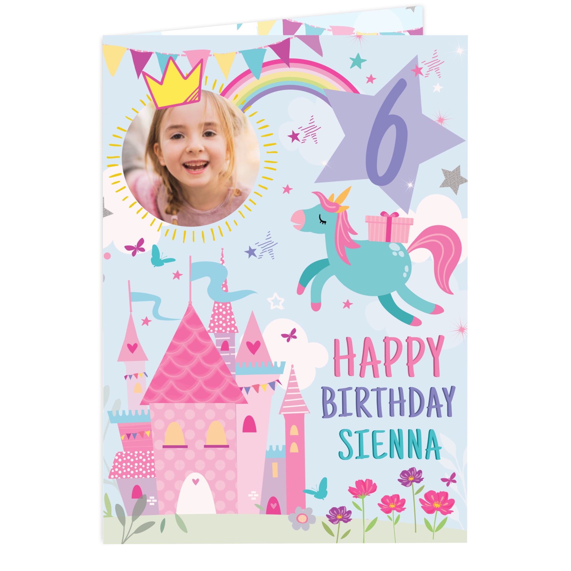 Featuring a whimsical castle in a dreamy pastel wonderland, this card is perfect for little royals who believe in unicorns and birthday wishes.