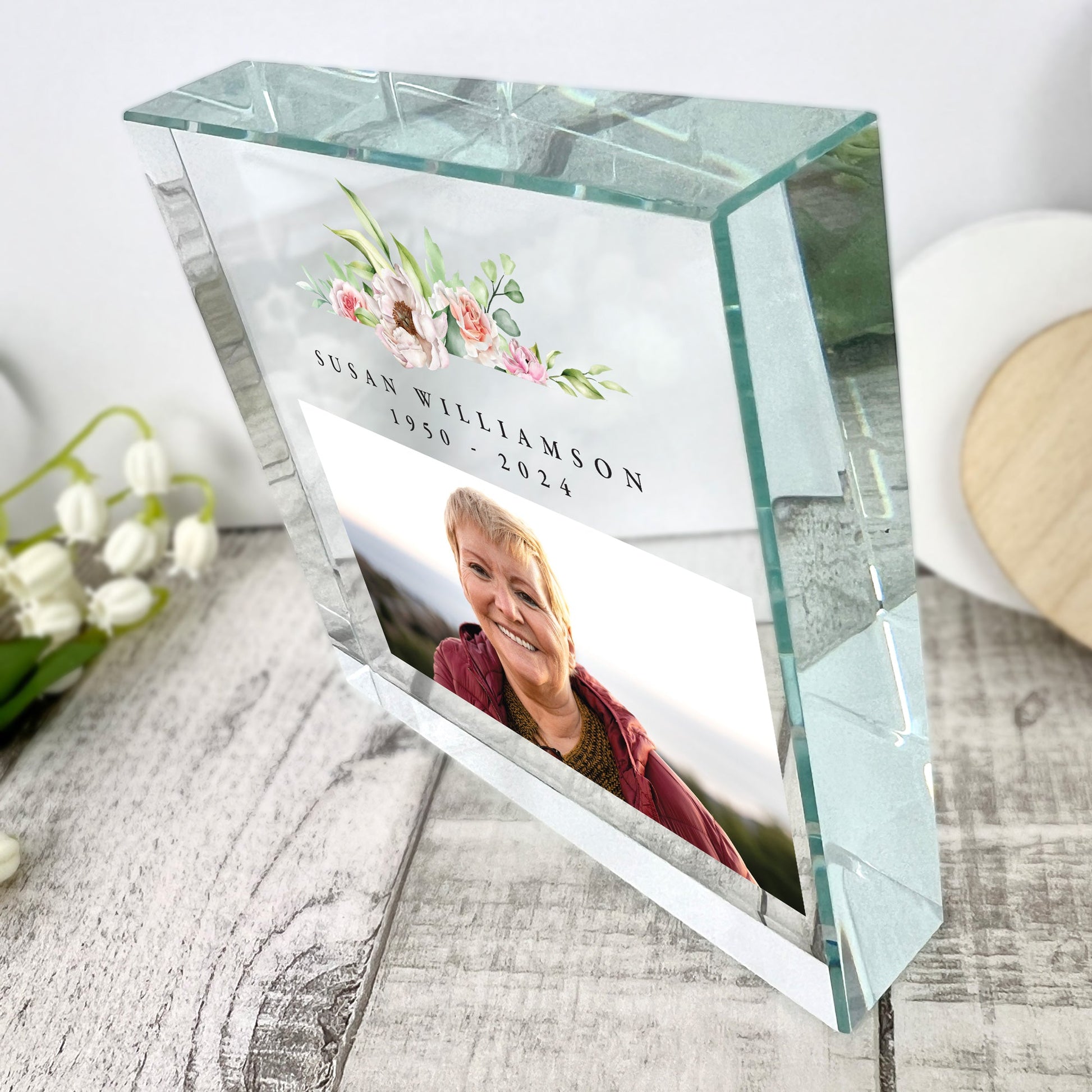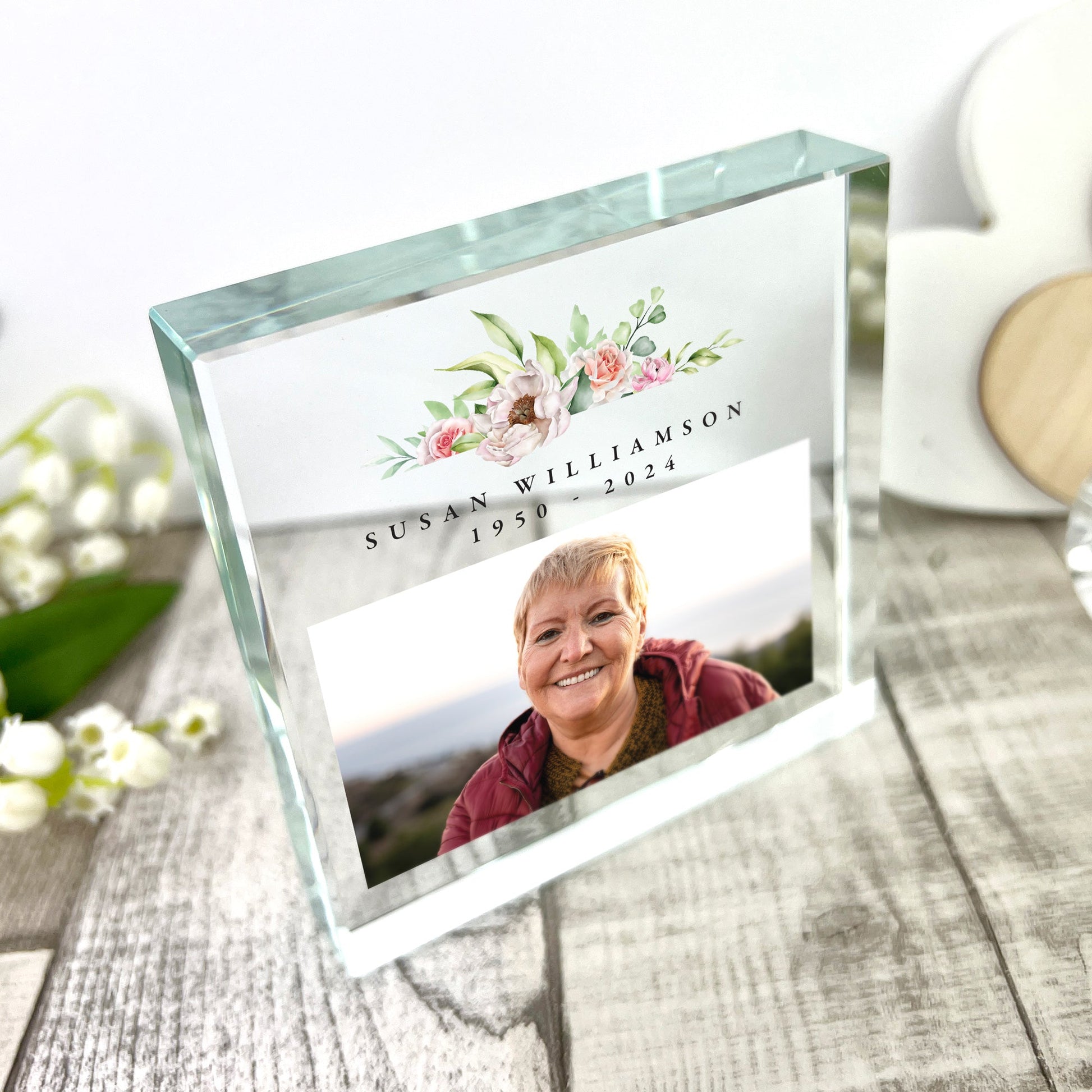 Offer a thoughtful way to remember someone special with this personalised memorial keepsake. This glass token, featuring a delicate floral design, provides comfort to someone missing a loved one.