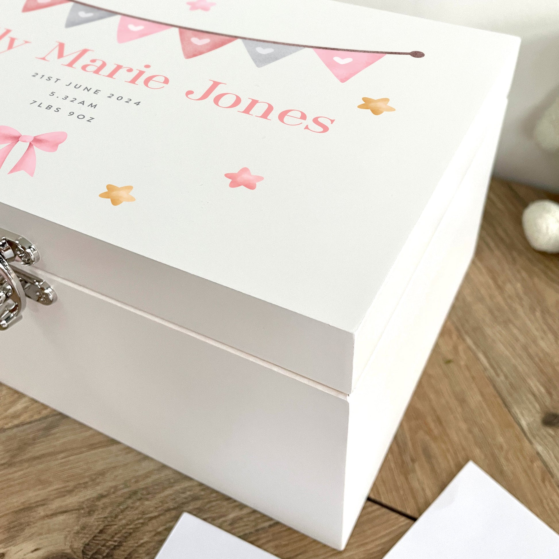 Give a new baby girl a special gift with this personalised pink memory box. It has a pretty garland design and is perfect for storing precious memories. It's also a lovely Christening present.