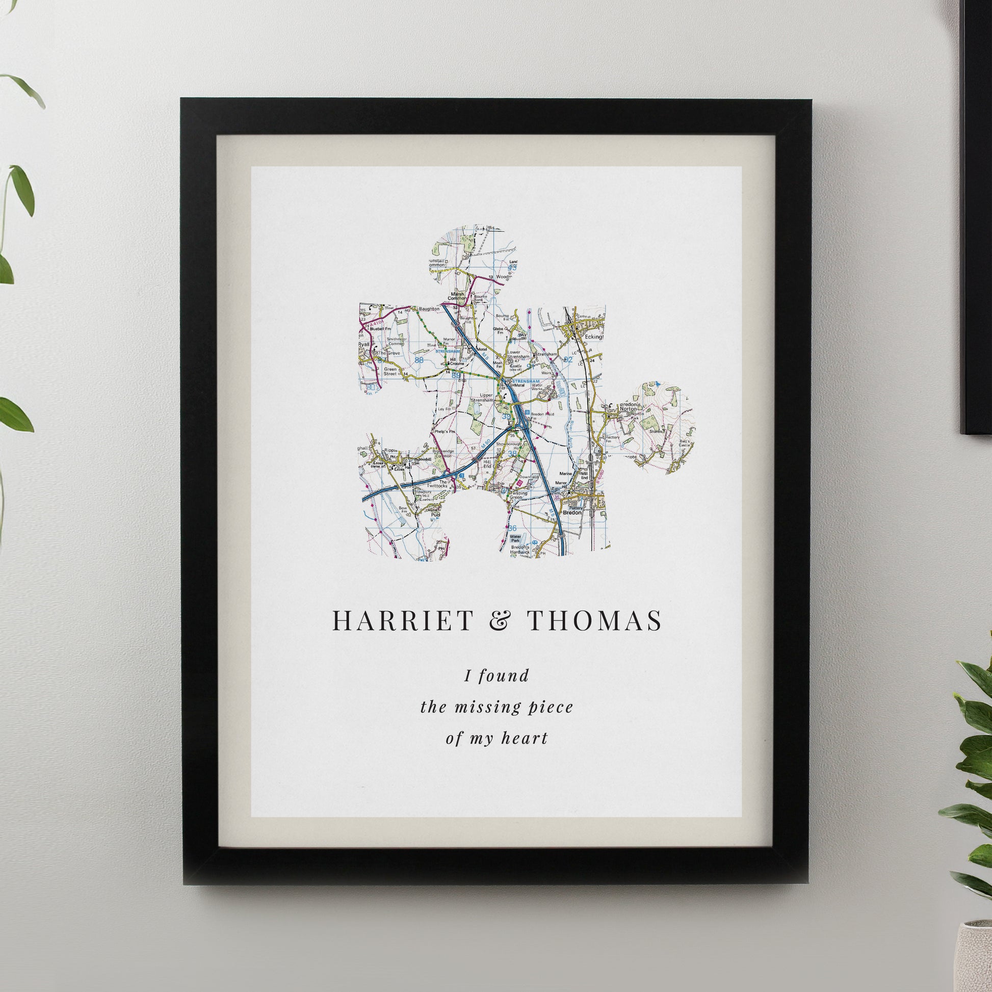 Personalised Present Day Map Puzzle Piece Black Poster Frame