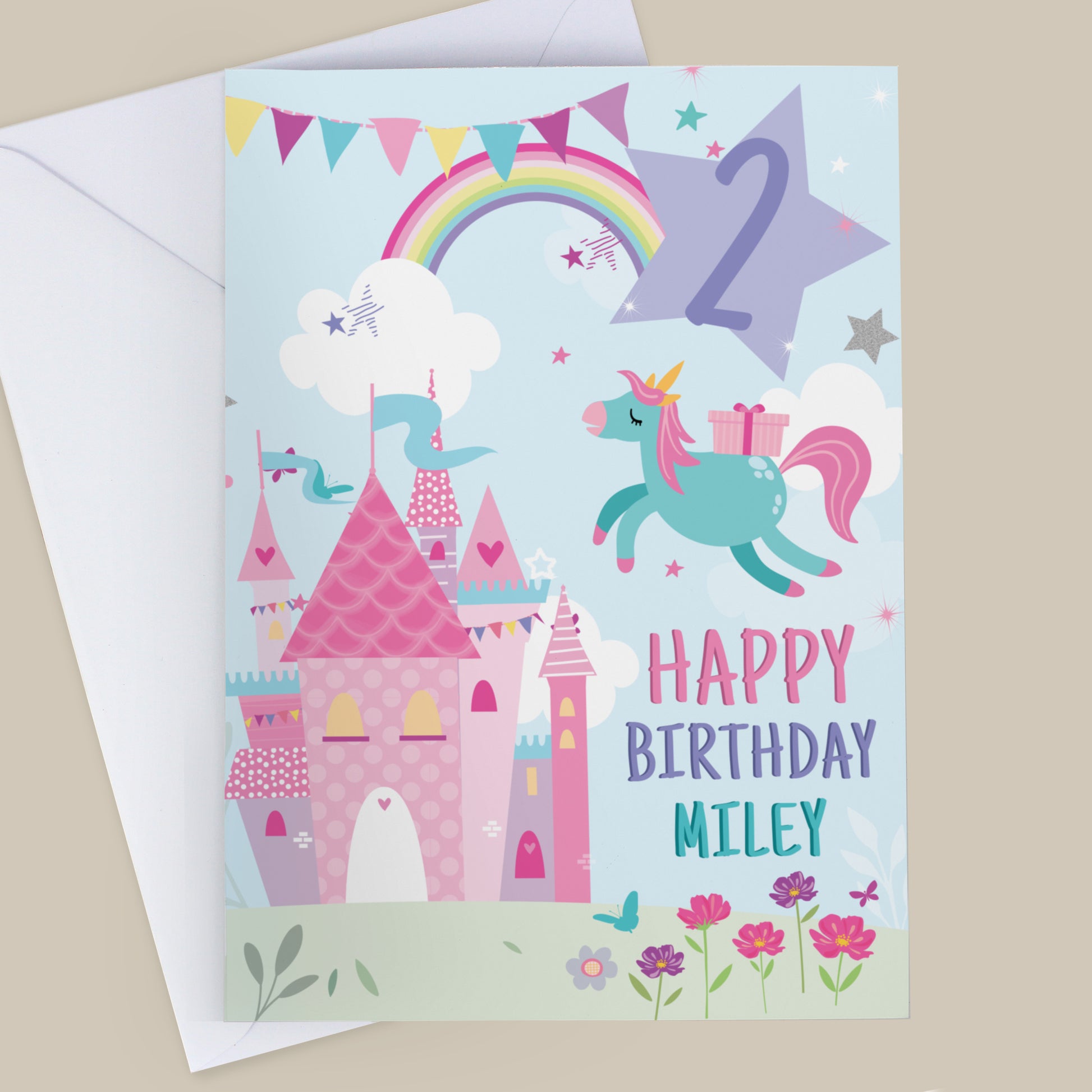 Featuring a whimsical castle in a dreamy pastel wonderland, this card is perfect for little royals who believe in unicorns and birthday wishes.