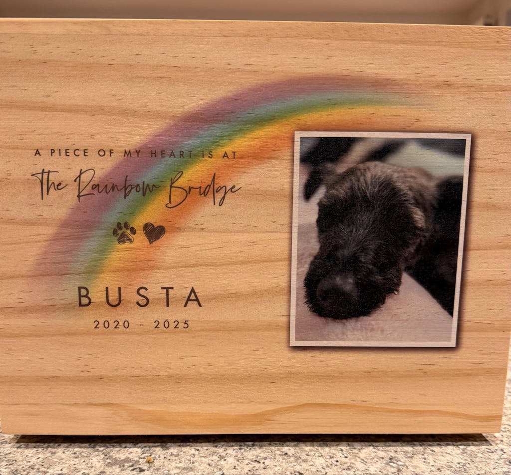 Remember your beloved pet with this personalised wooden box. It has a rainbow and the words "A piece of my heart is at The Rainbow Bridge."