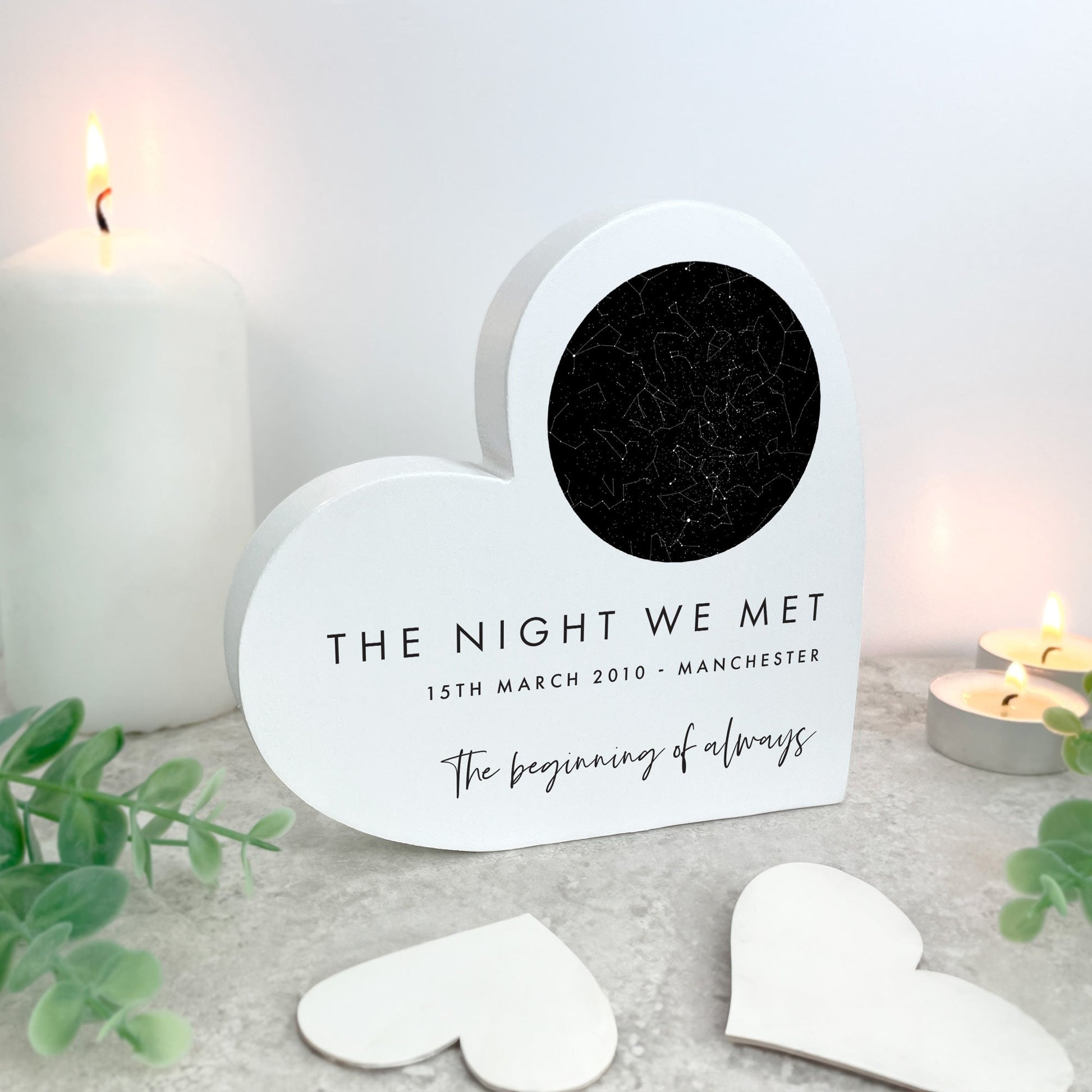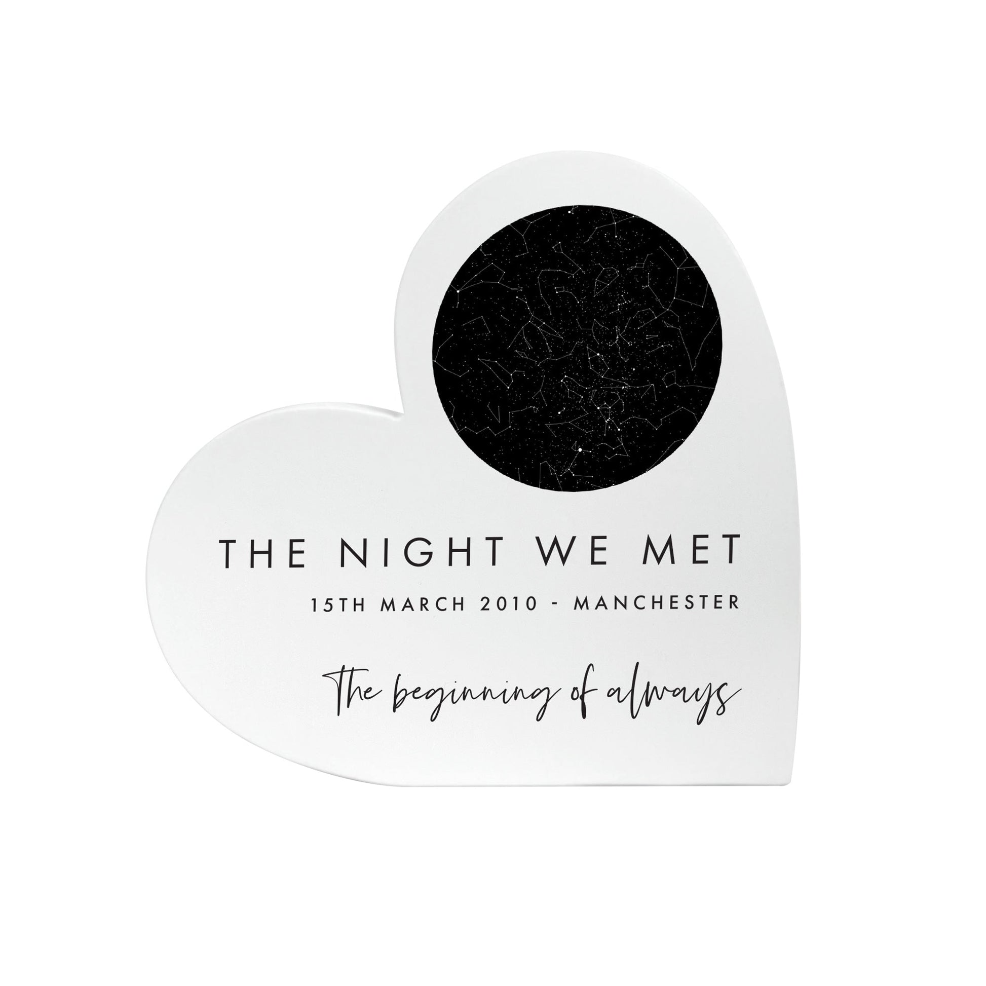 Capture a moment written in the stars with this charming white wooden heart. Perfect for anniversaries, weddings, births, or any milestone worth remembering, it features an accurate star map from your chosen date and location, UV printed with stunning precision.
