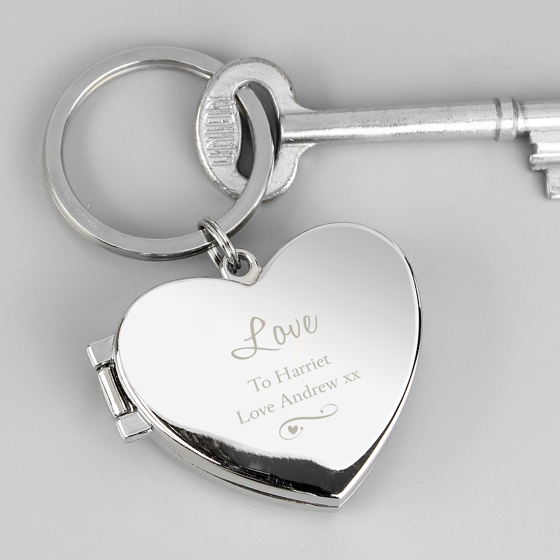 Personalise this silver finish Heart Shaped Photo Keyring with any name up to 12 characters and any message over 2 lines, with 20 characters per line.