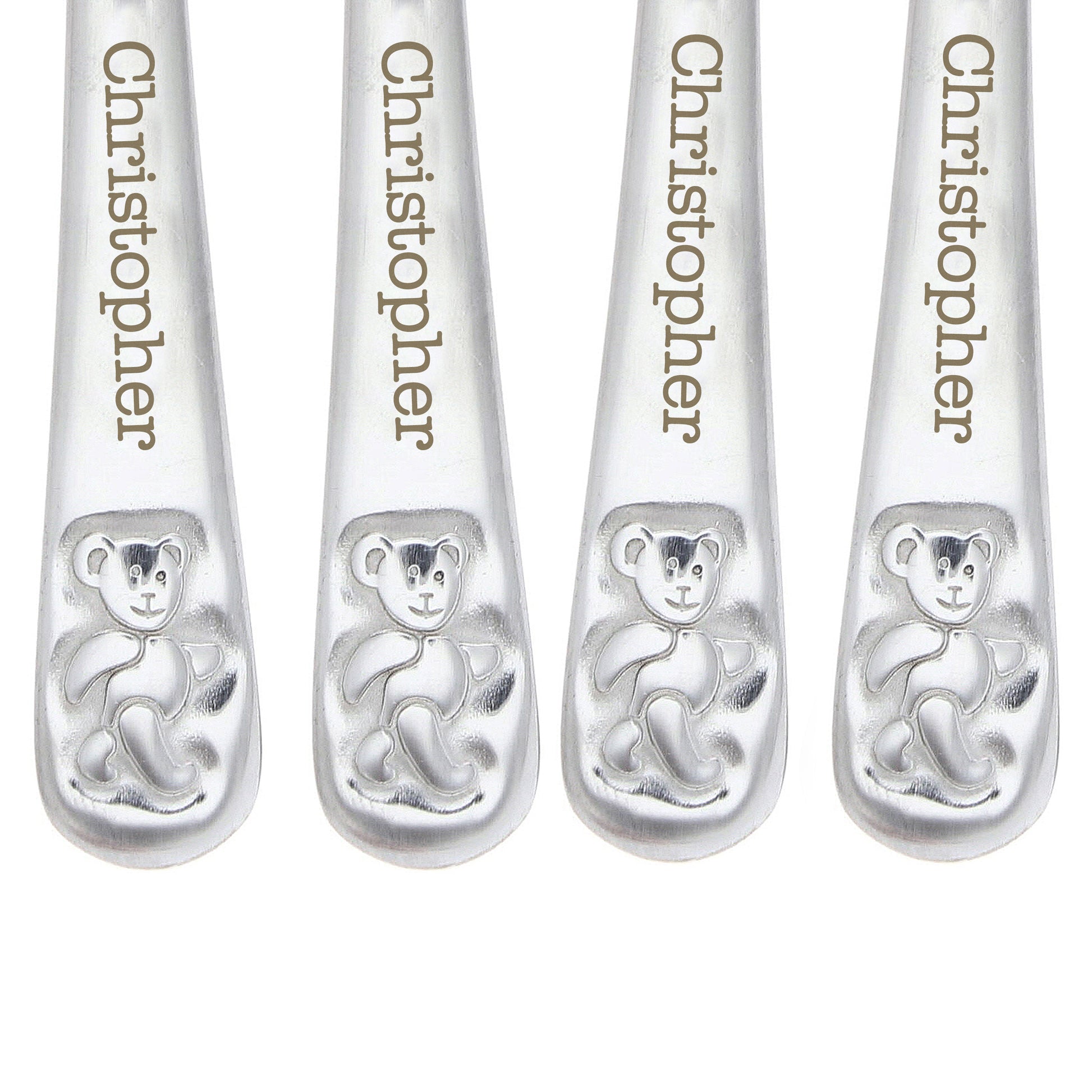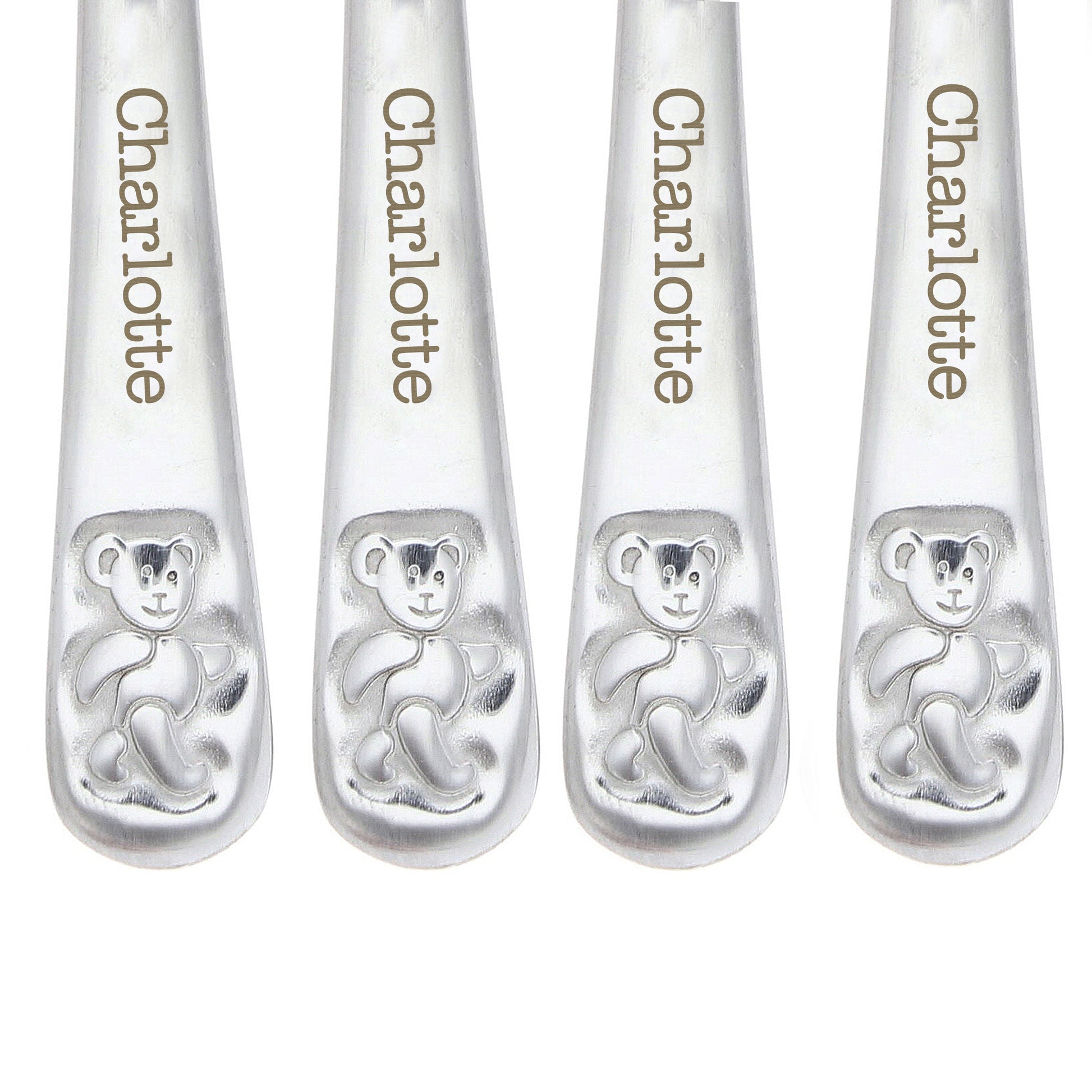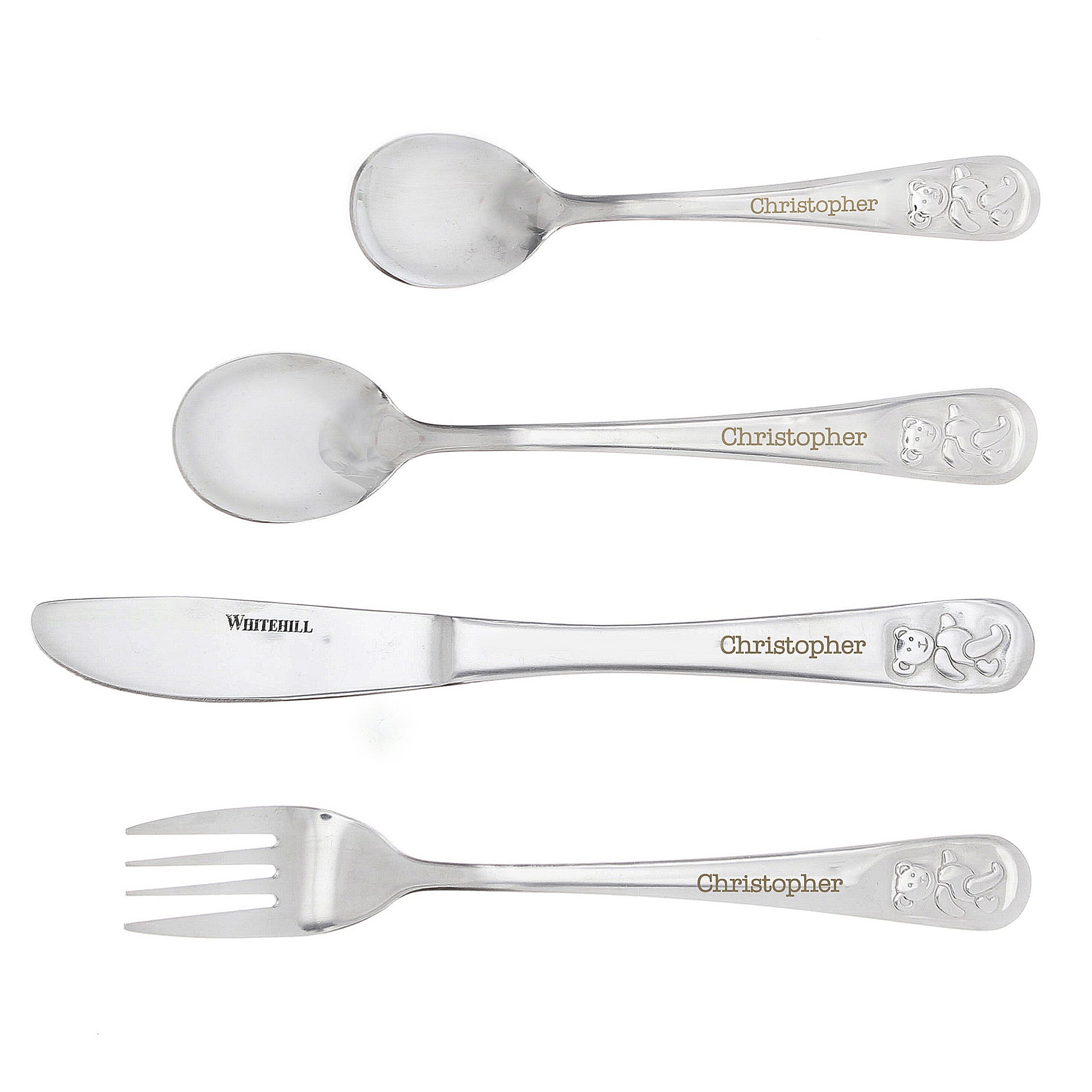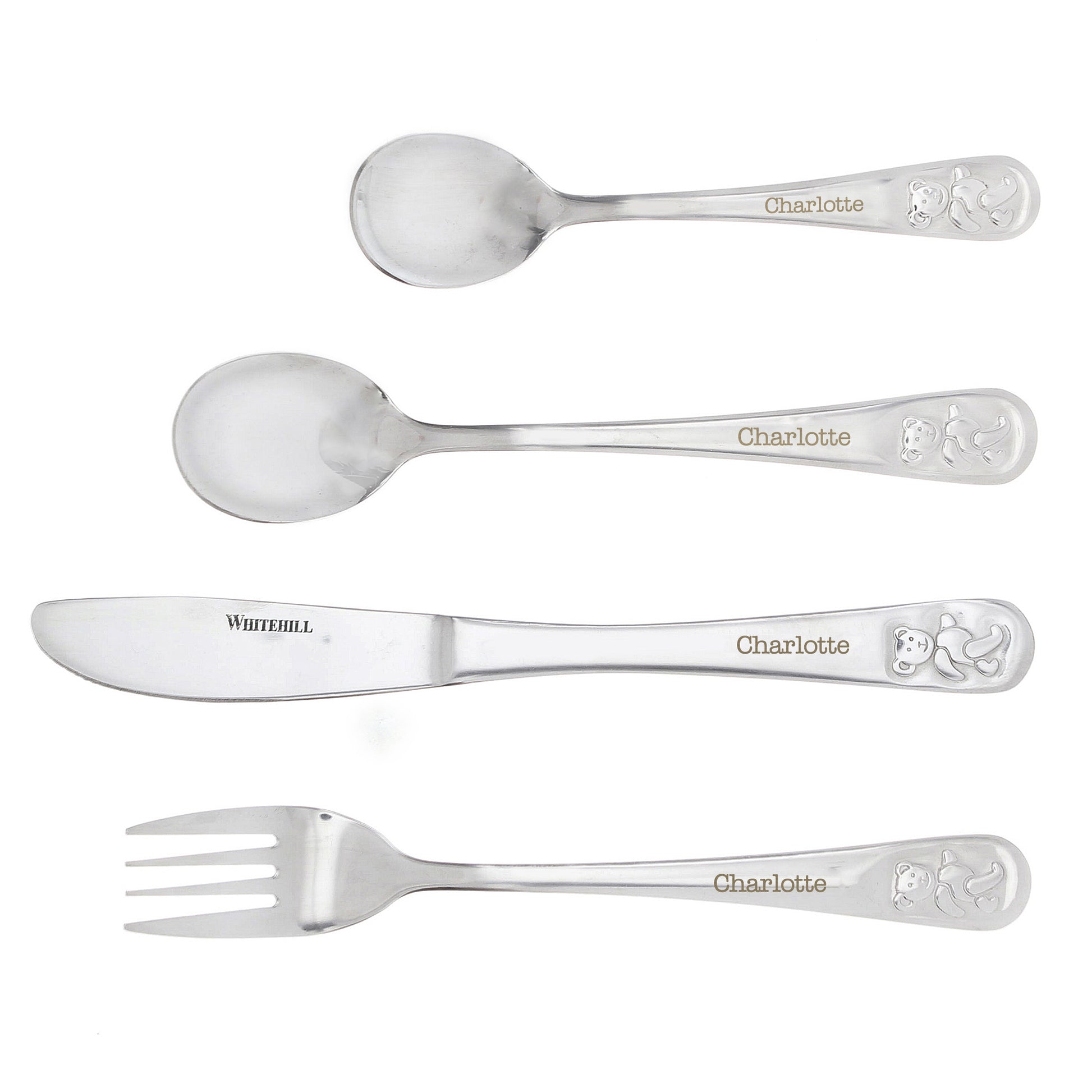 This stylish 4 piece set of steel cutlery featuring a cute teddy design can be personalised with any name up to 15 characters.
