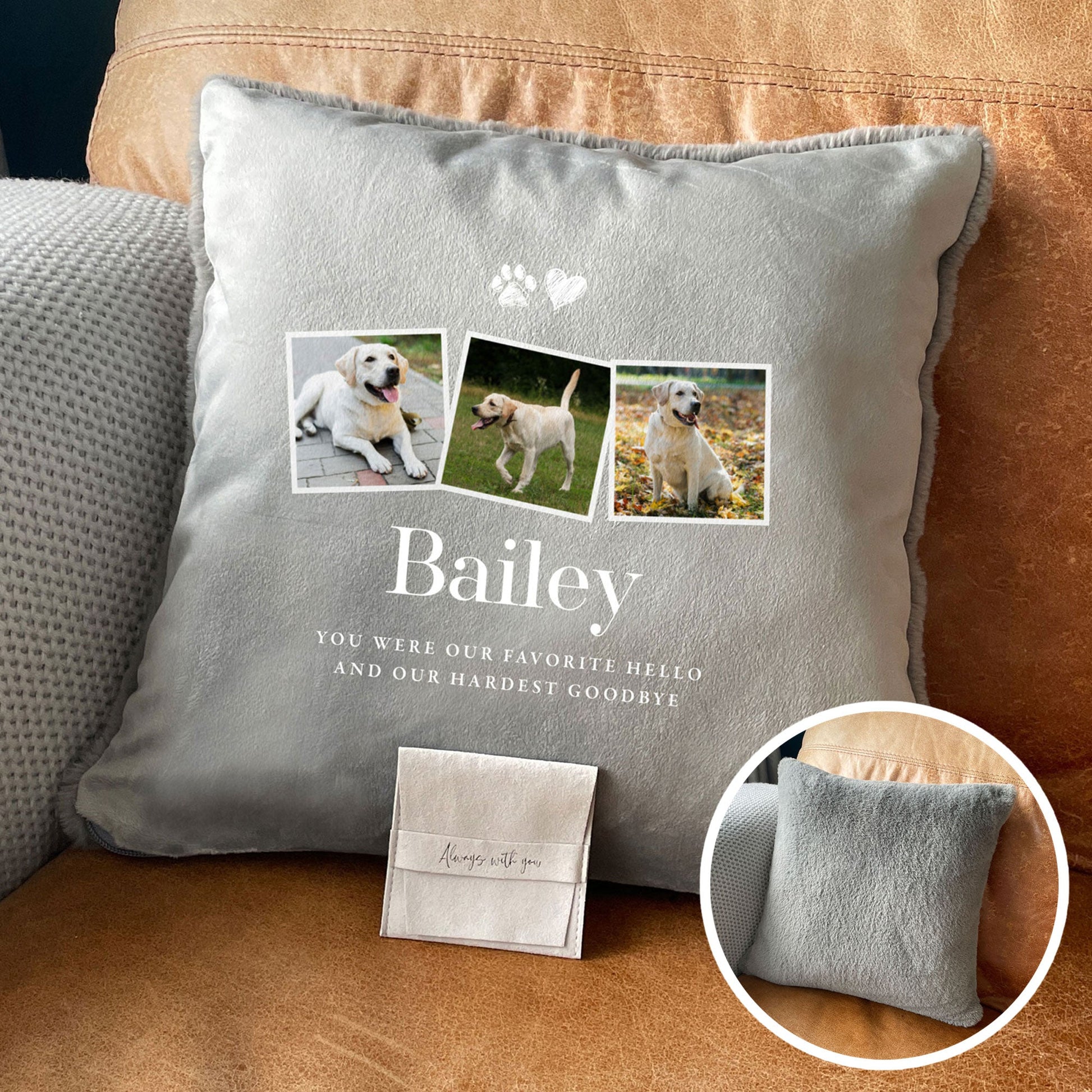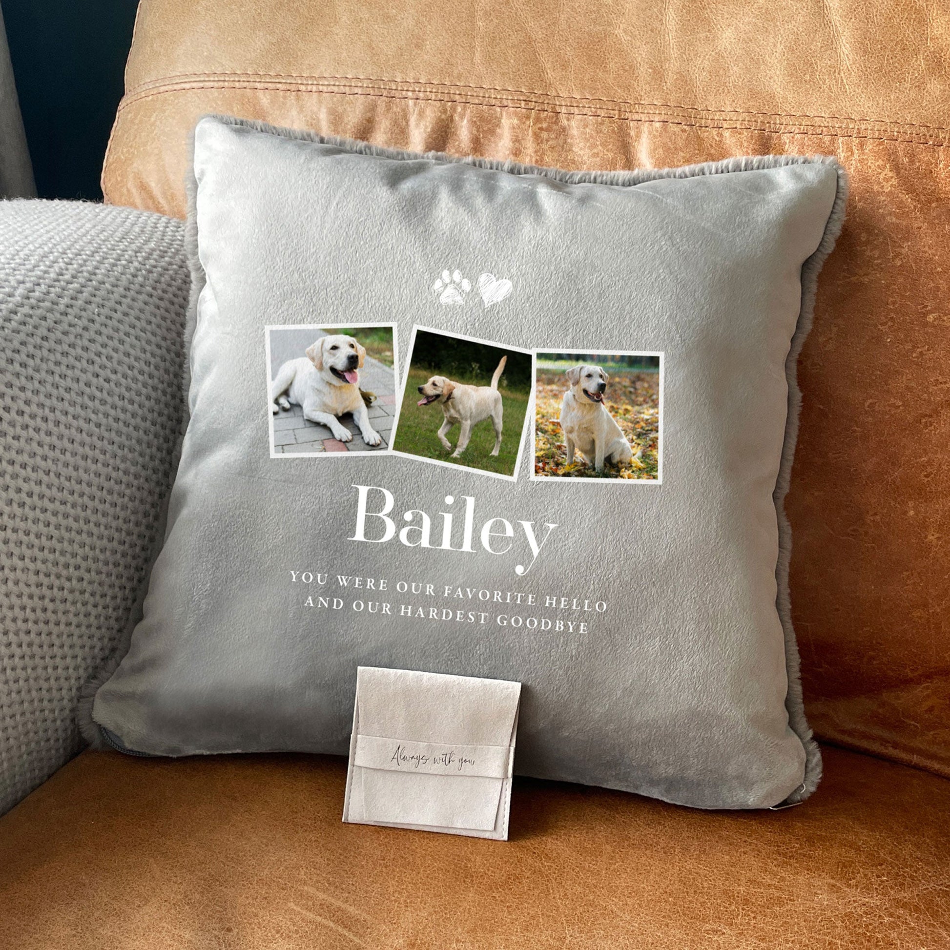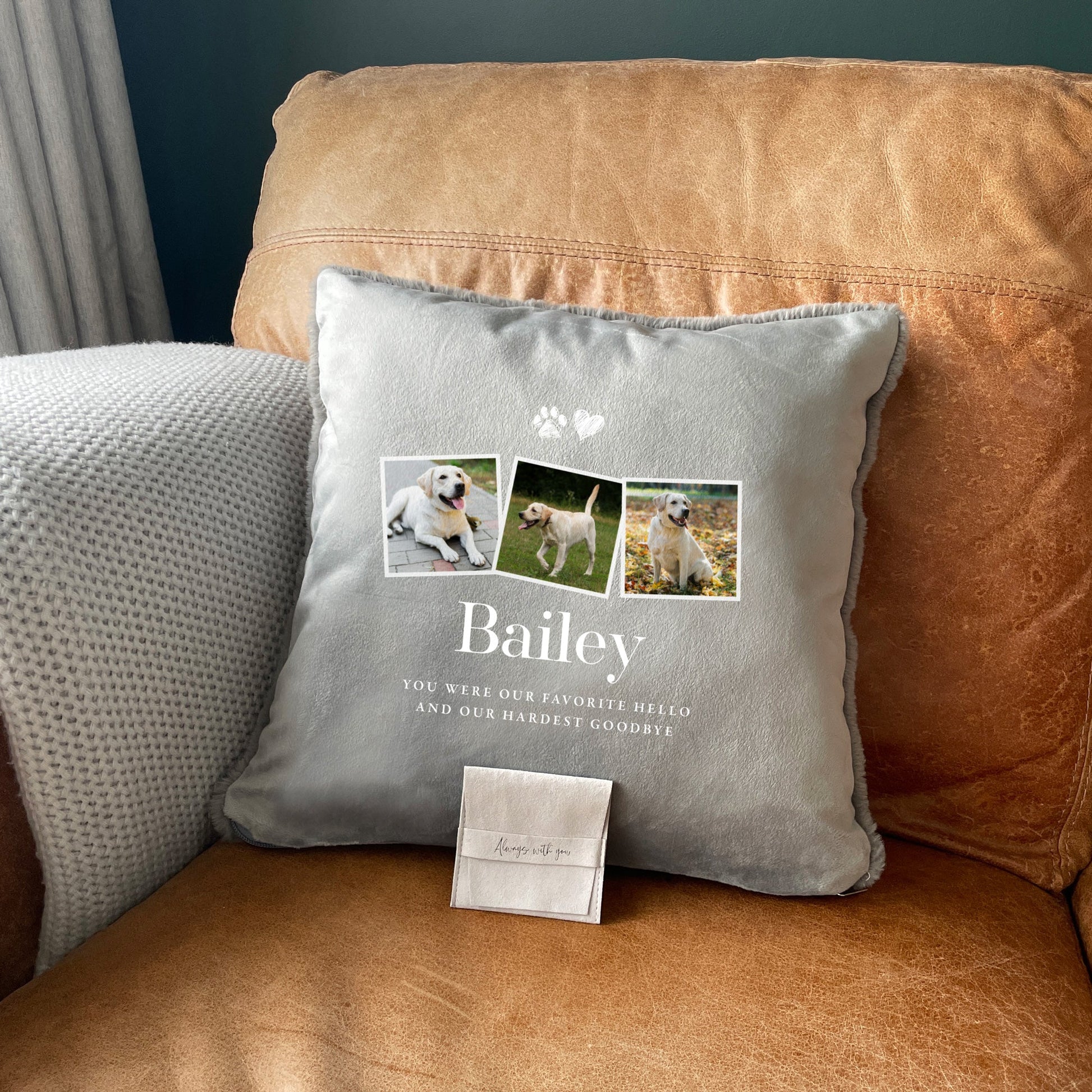 Find comfort and warmth with our personalised memorial cuddle cushion. This photo cushion, featuring three treasured photos and a special message, is perfect for when you're missing your beloved pet and longing for a hug. The top of the cushion has a charming sketchy heart and paw print.