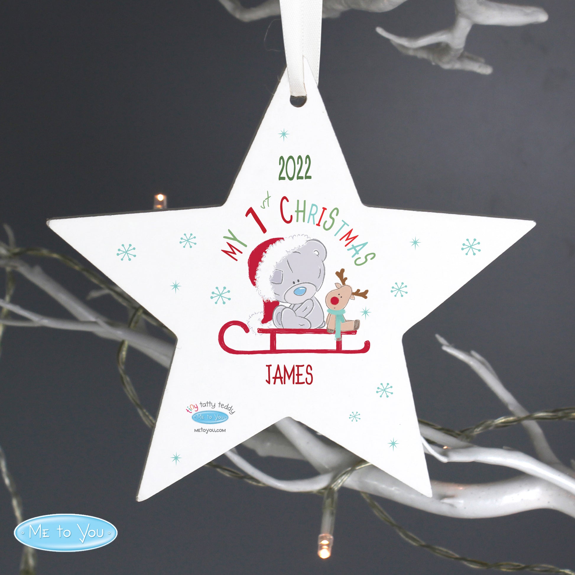 Personalised Tiny Tatty Teddy My 1st Christmas Sleigh Wooden Star Decoration