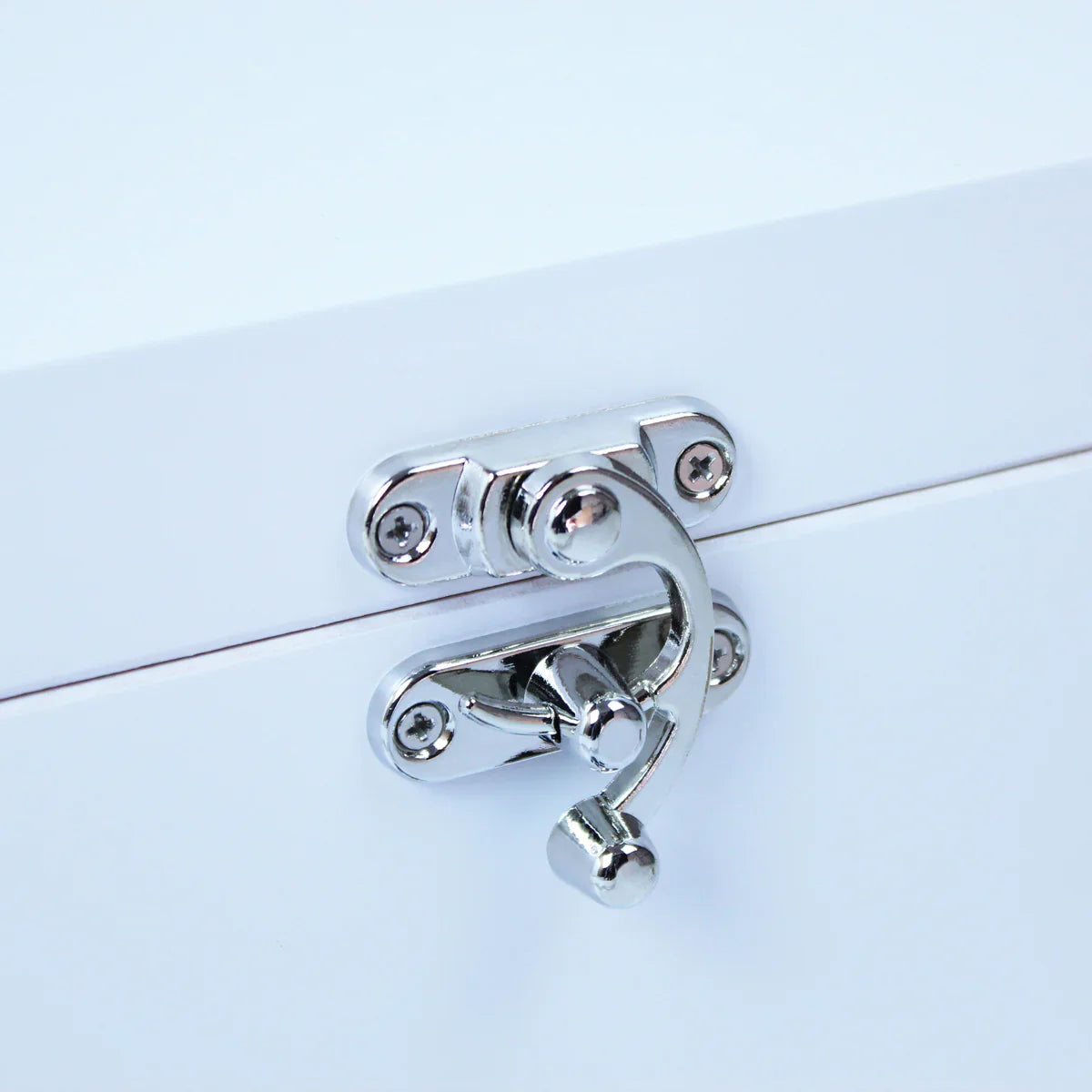 The strong white box is made of pine wood. It has metal hinges and a clasp to keep things safe. Choose from different sizes.