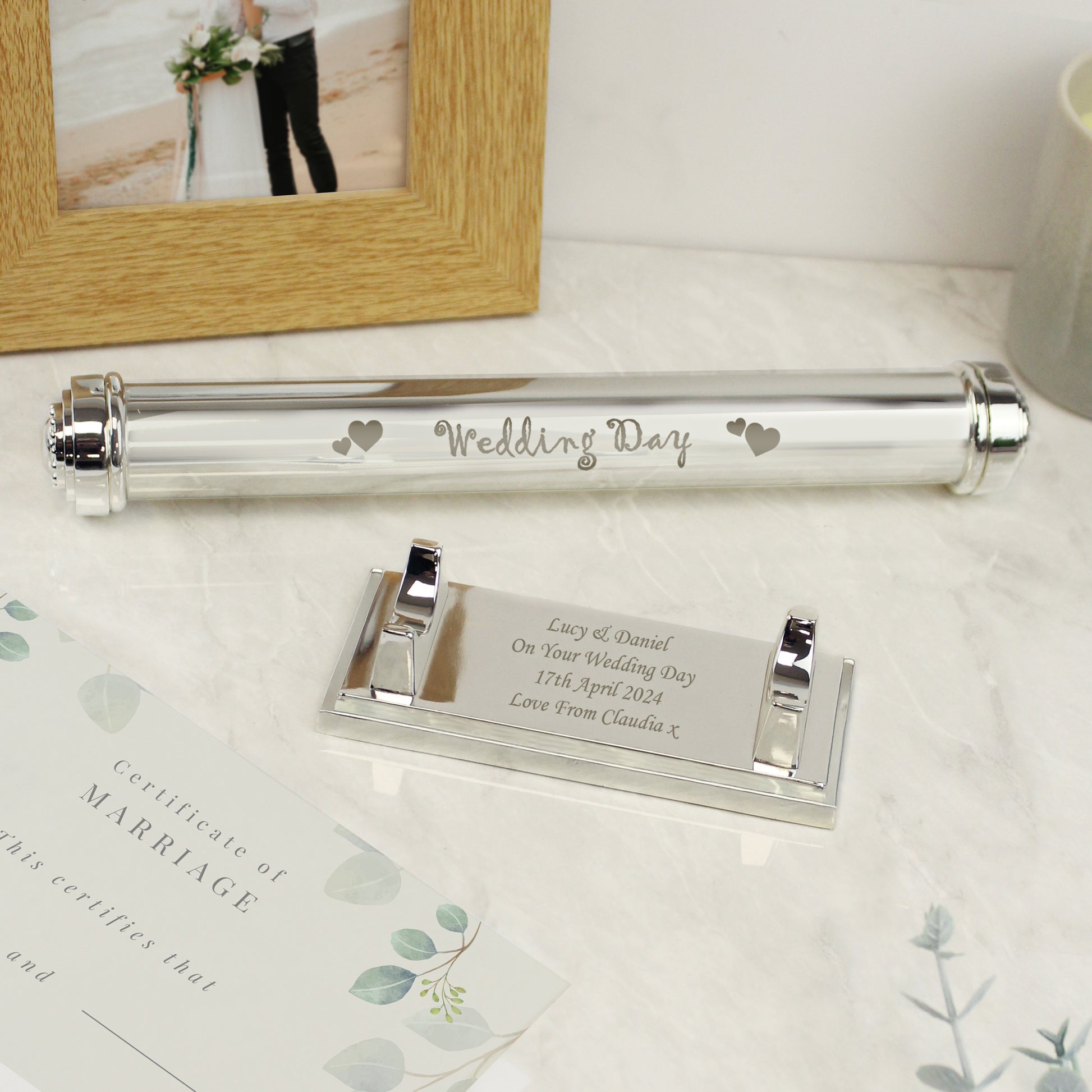 Personalised the stand with any message over 4 lines and up to 25 characters per line. The wording 'Wedding Day' featured on the holder is standard text.