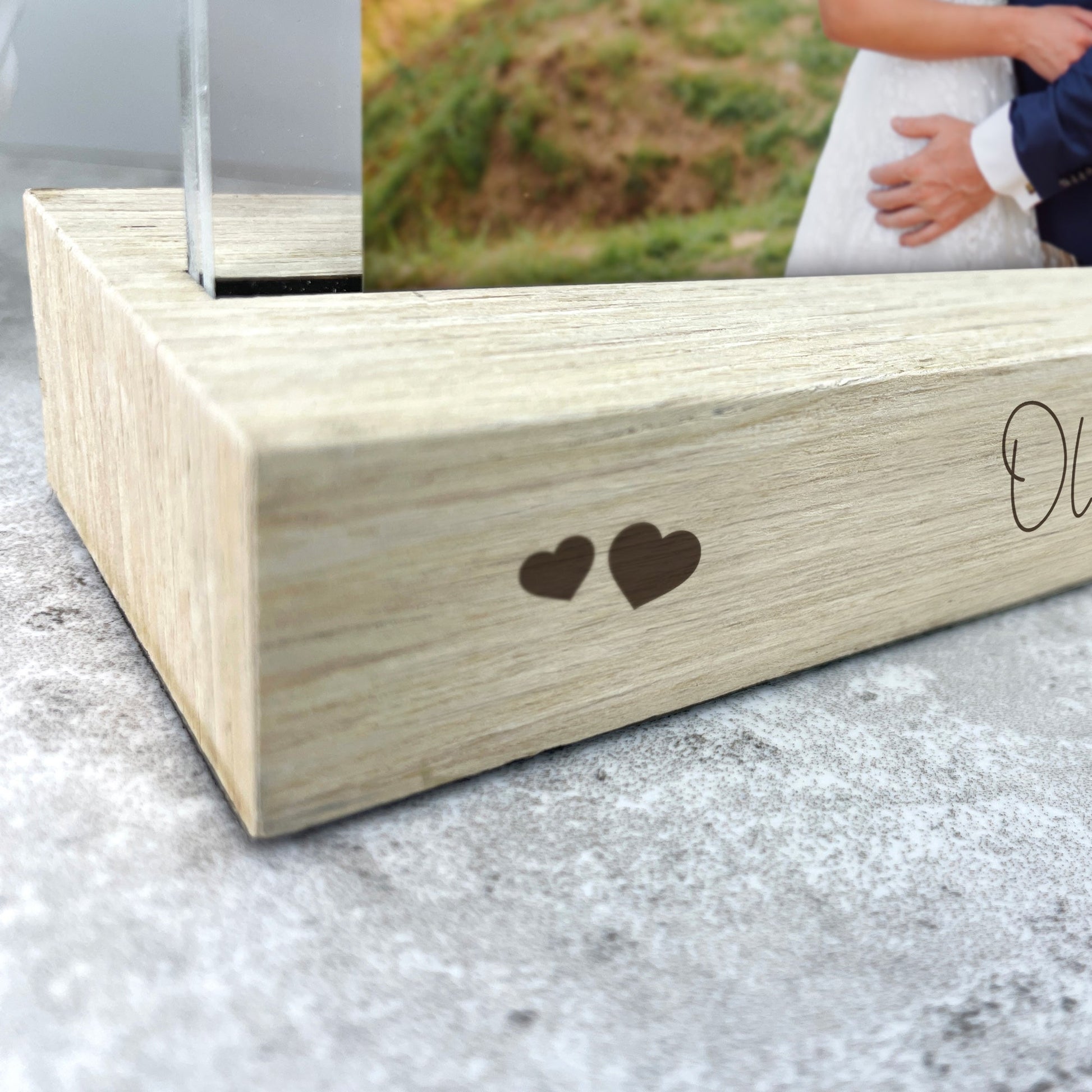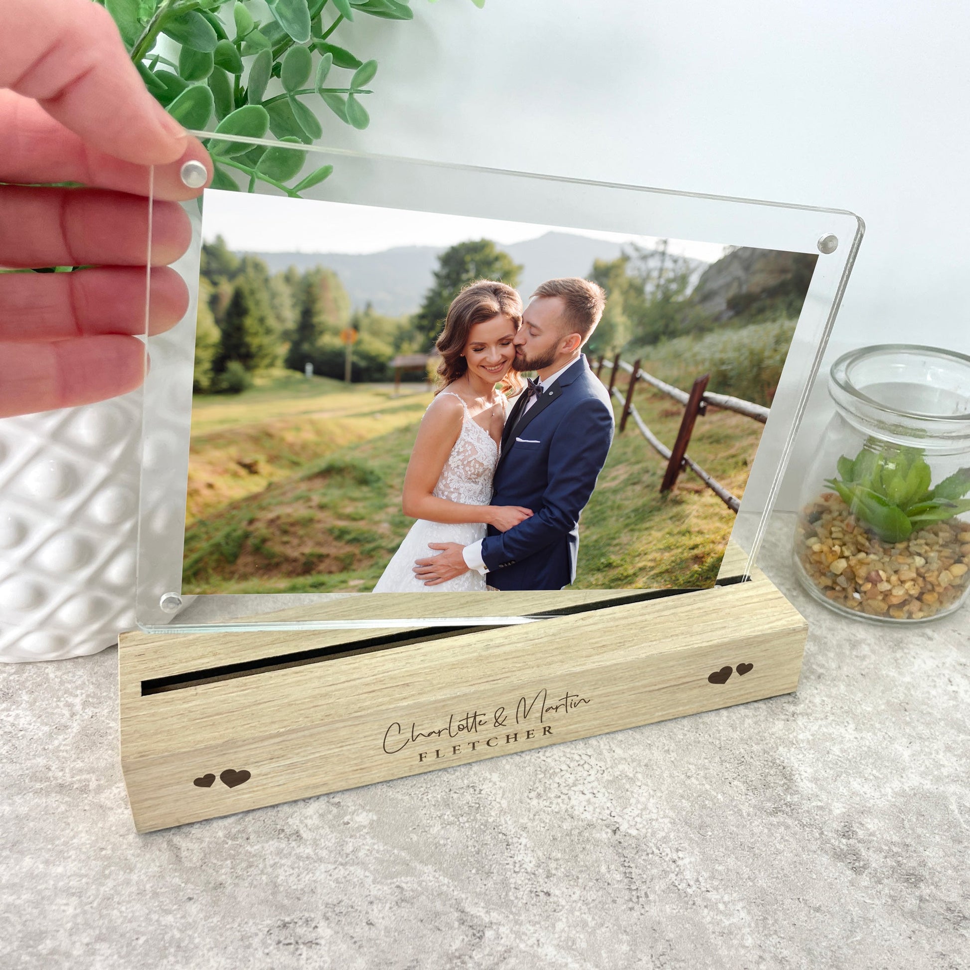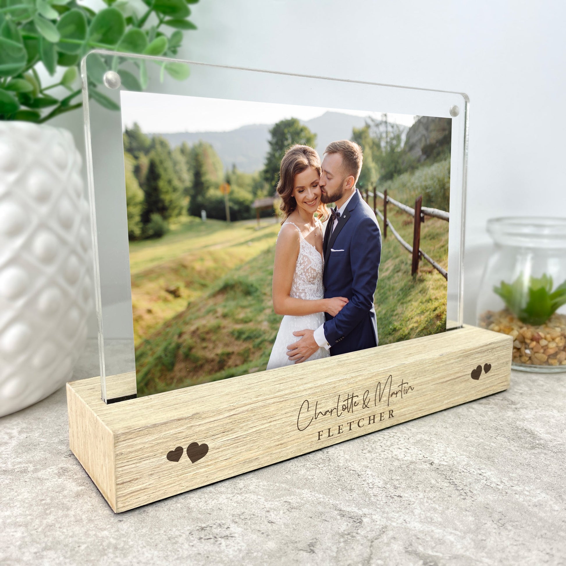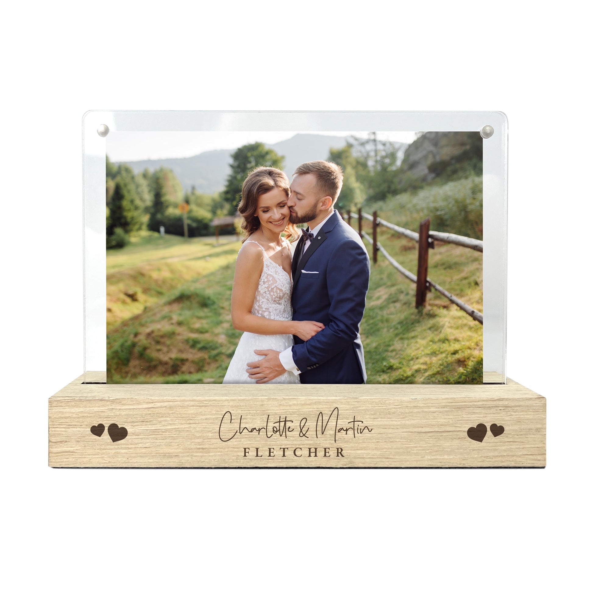 This personalised wooden picture frame is a lovely present for a couple as a wedding gift, or for your partner on Valentine's Day or an anniversary. Personalise it with two lines of text: the top line in a script font and the bottom line in a straight font. The heart designs at either end of the base are always included.