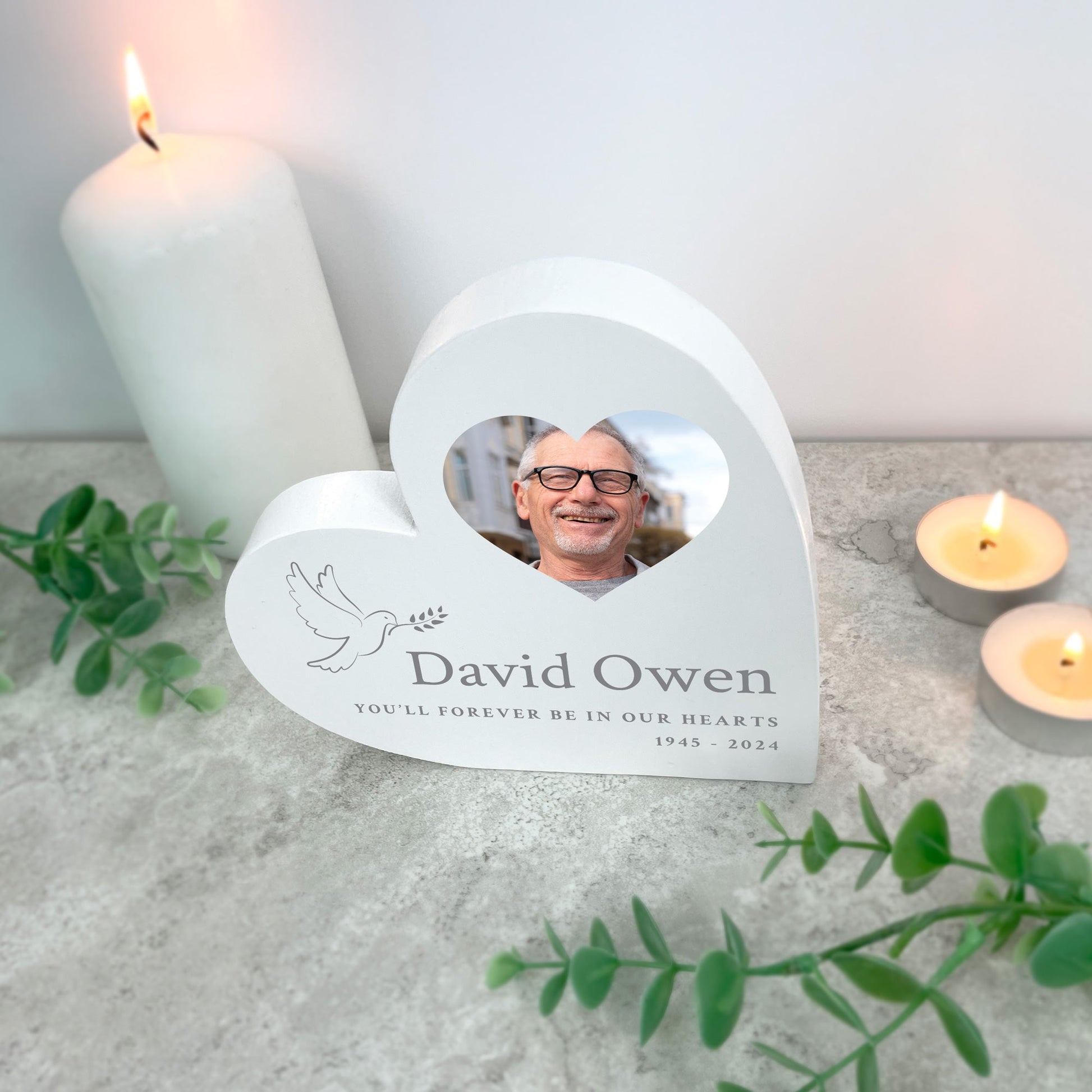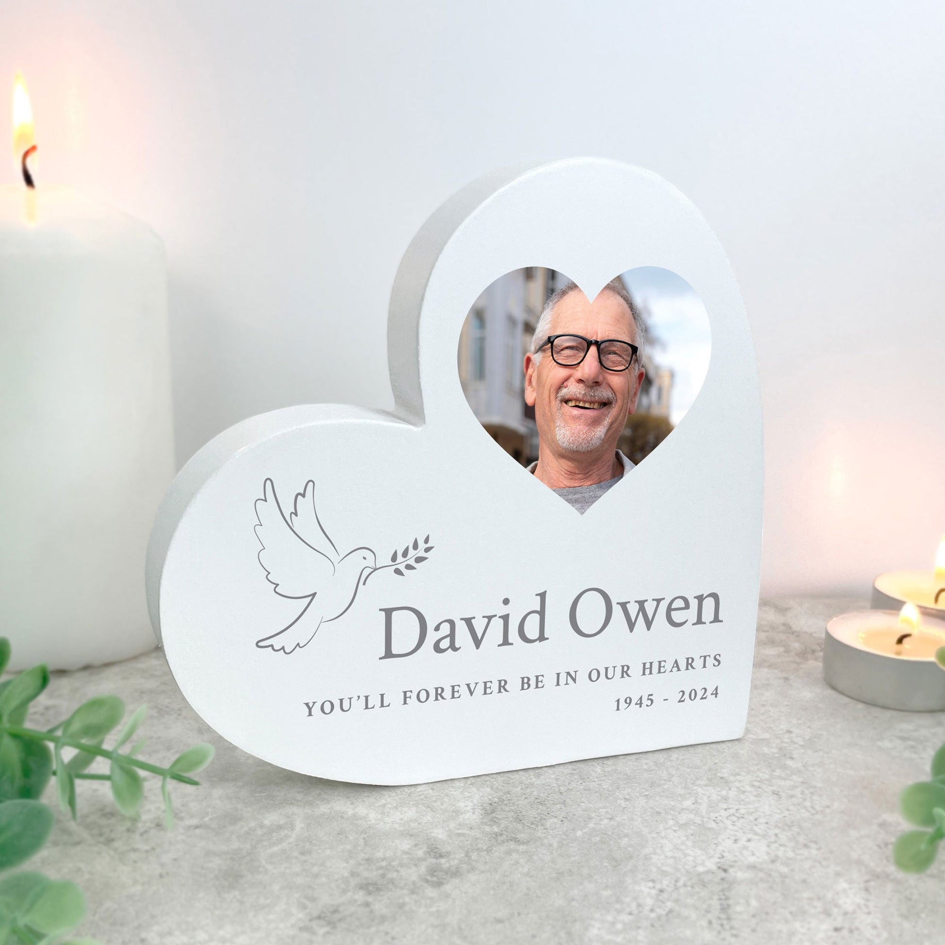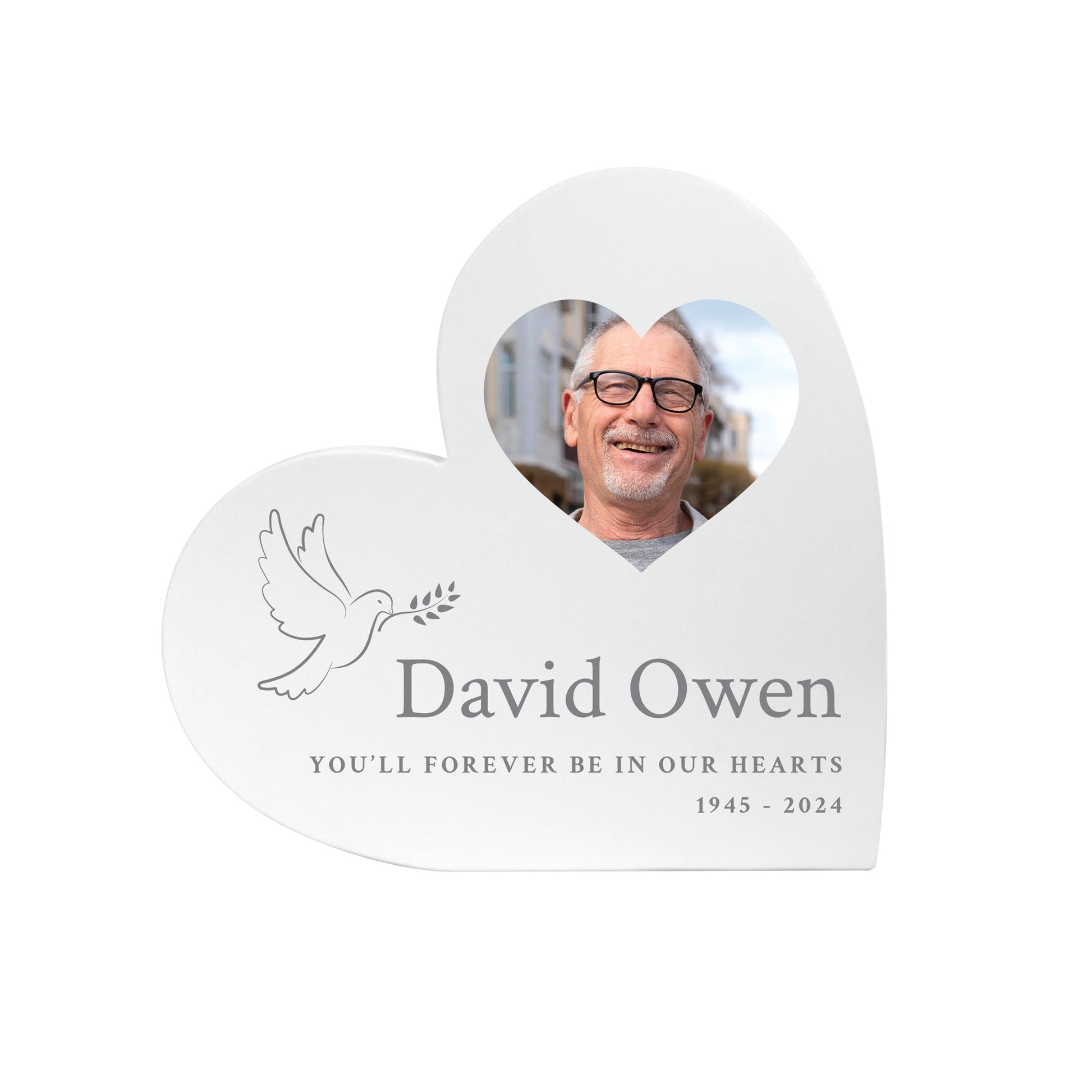 Personalised White In Loving Memory Dove Photo Freestanding Heart