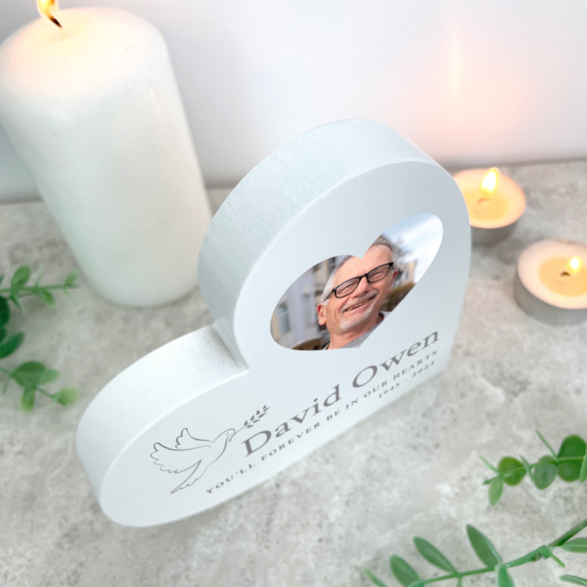 Remember a loved one with this freestanding wooden heart ornament, beautifully personalised with an In Loving Memory Dove design, your favourite photo, and up to 3 lines of custom text.